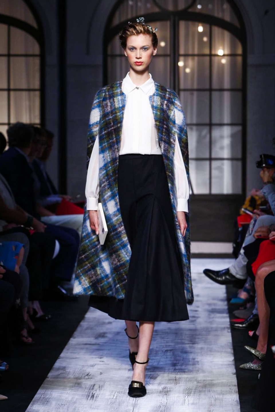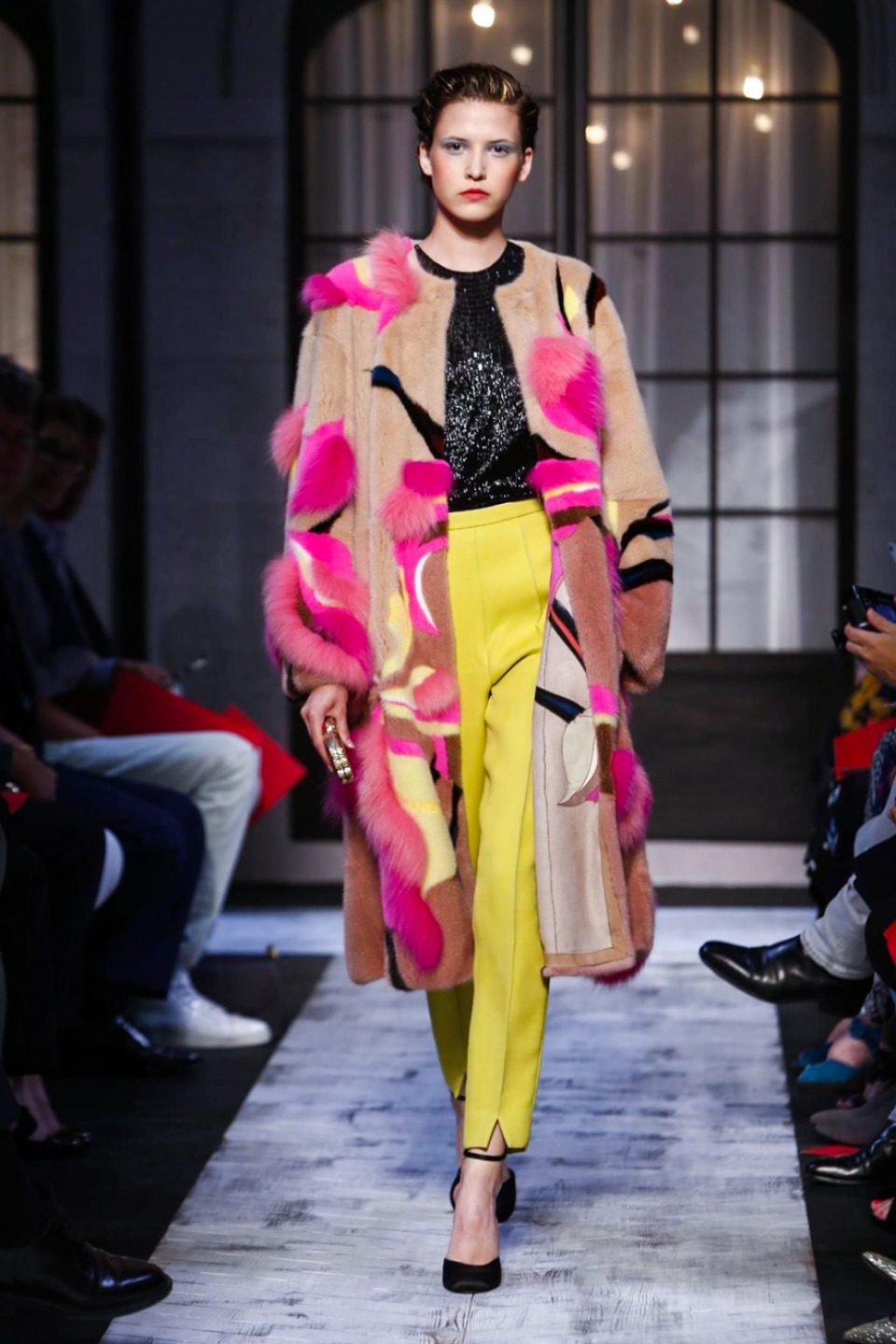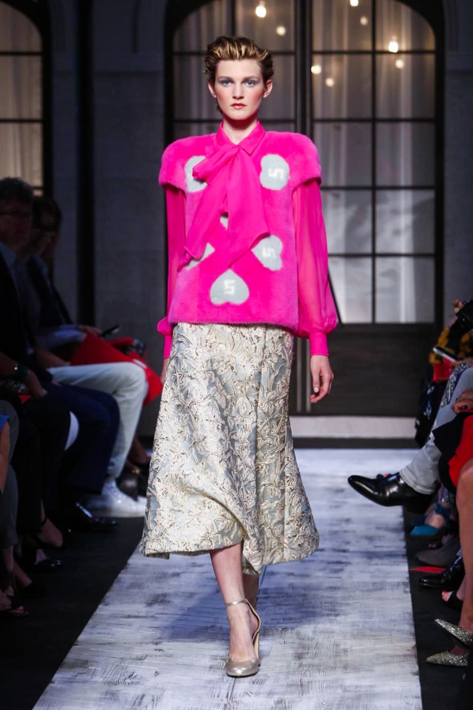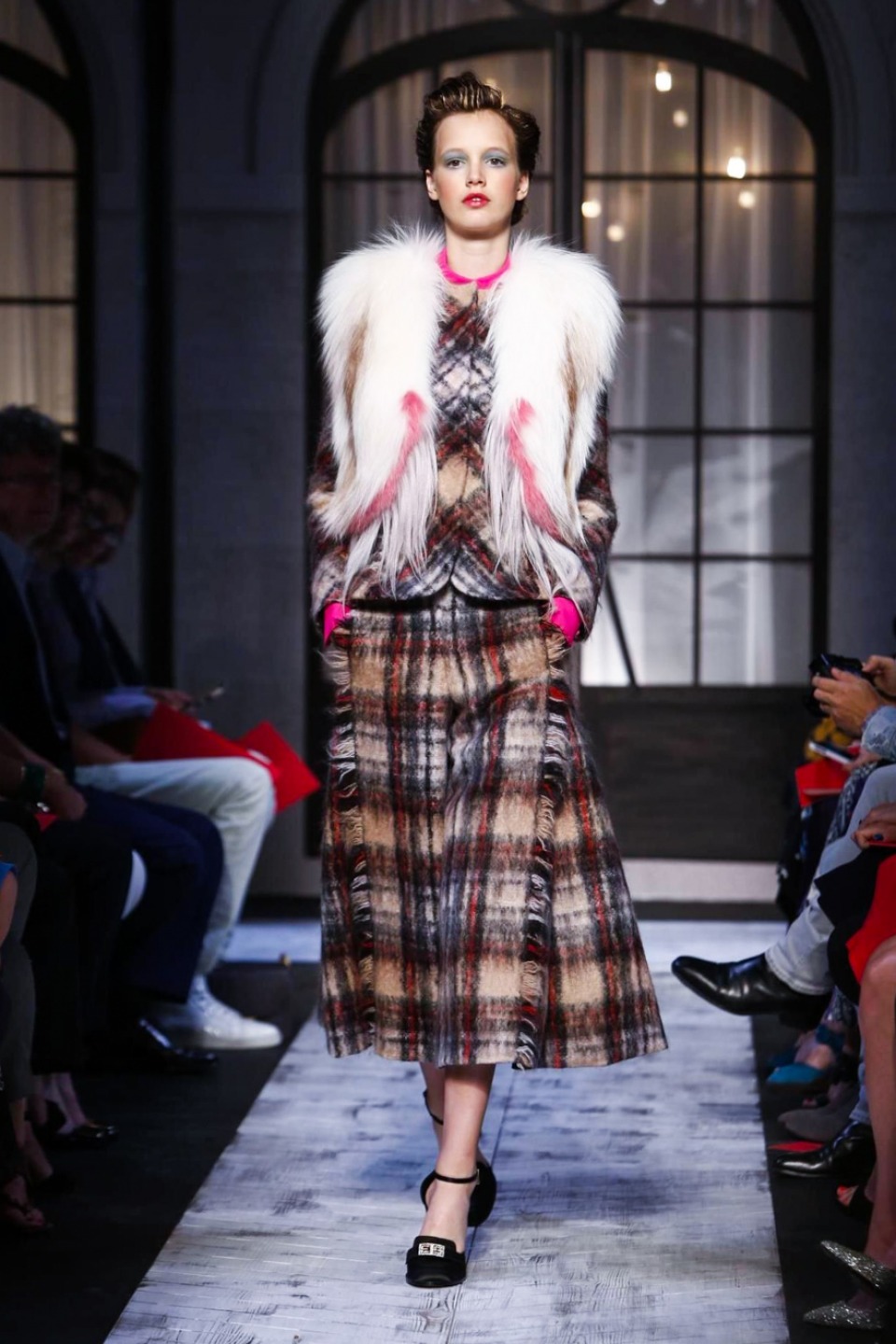 Bertrand Guyon’s debut collection for the recently re-established Italian house Schiaparelli was a strong one, in all senses of the word. Colors were bold and spirited, ranging from ruby reds and hot pinks to mermaid tones and zesty citrus hues. Clashing was also one of the collection’s main features, with loud beige plaids offset by pink furs and embellished blouses teamed with light, shimmery skirts.