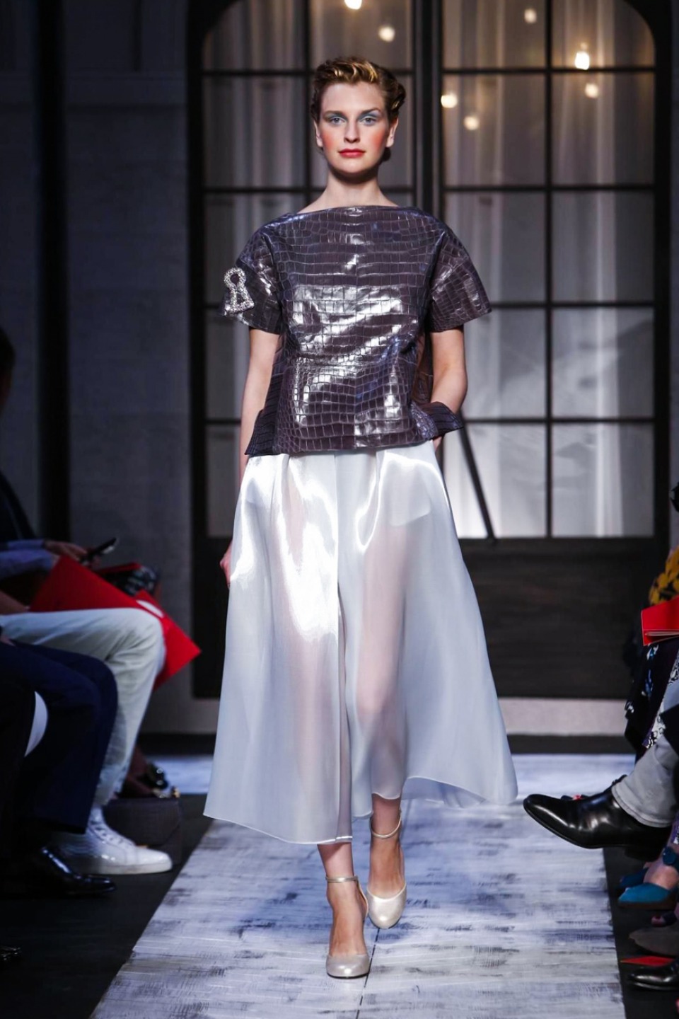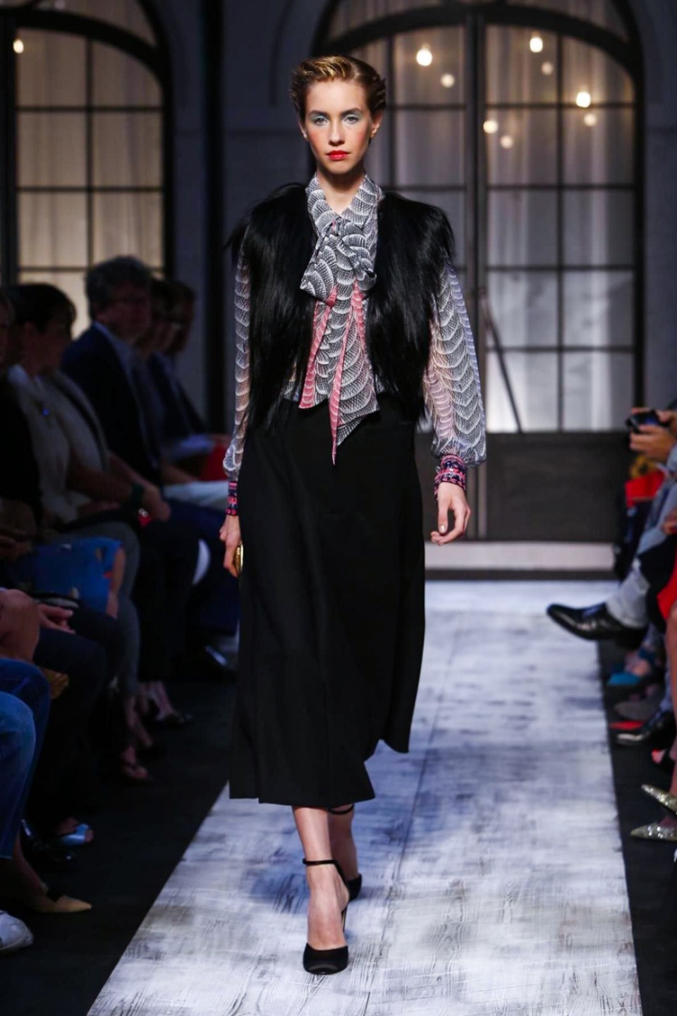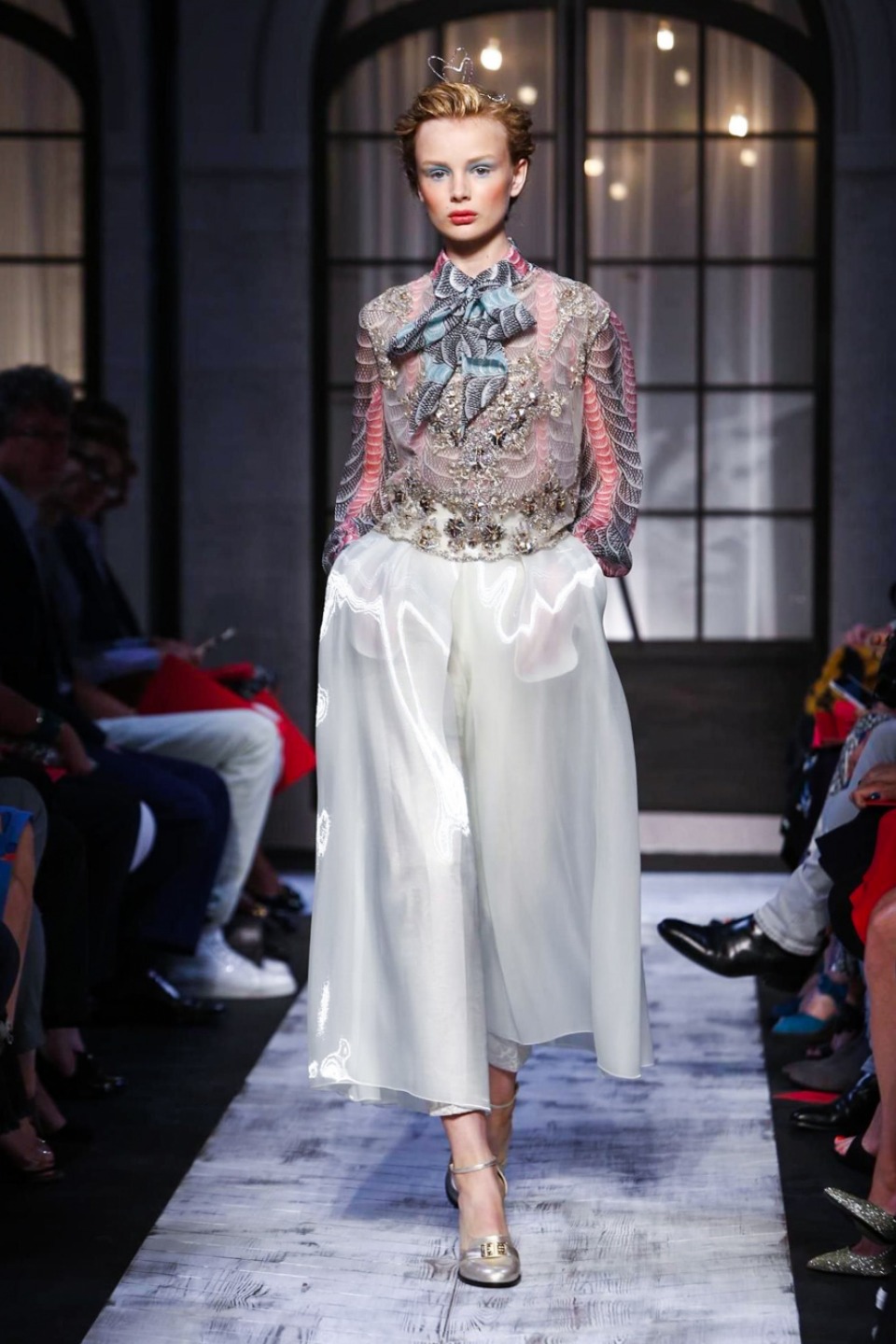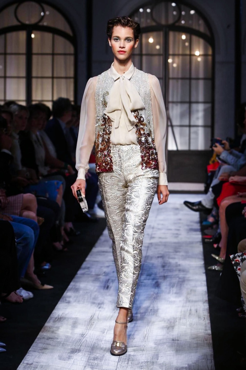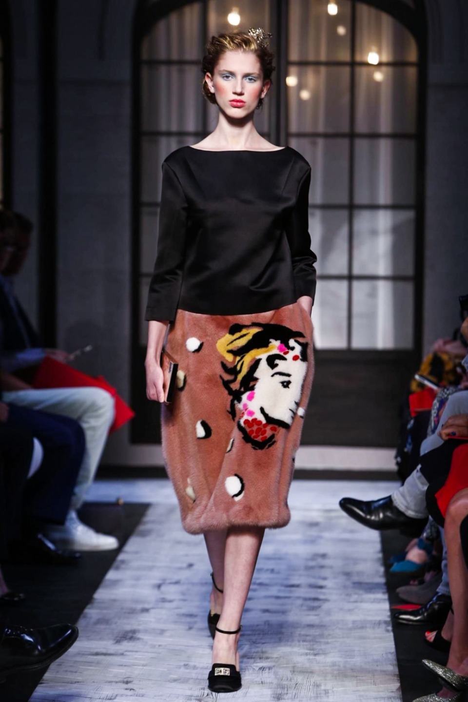Bertrand Guyon’s debut collection for the recently re-established Italian house Schiaparelli was a strong one, in all senses of the word. Colors were bold and spirited, ranging from ruby reds and hot pinks to mermaid tones and zesty citrus hues. Clashing was also one of the collection’s main features, with loud beige plaids offset by pink furs and embellished blouses teamed with light, shimmery skirts.