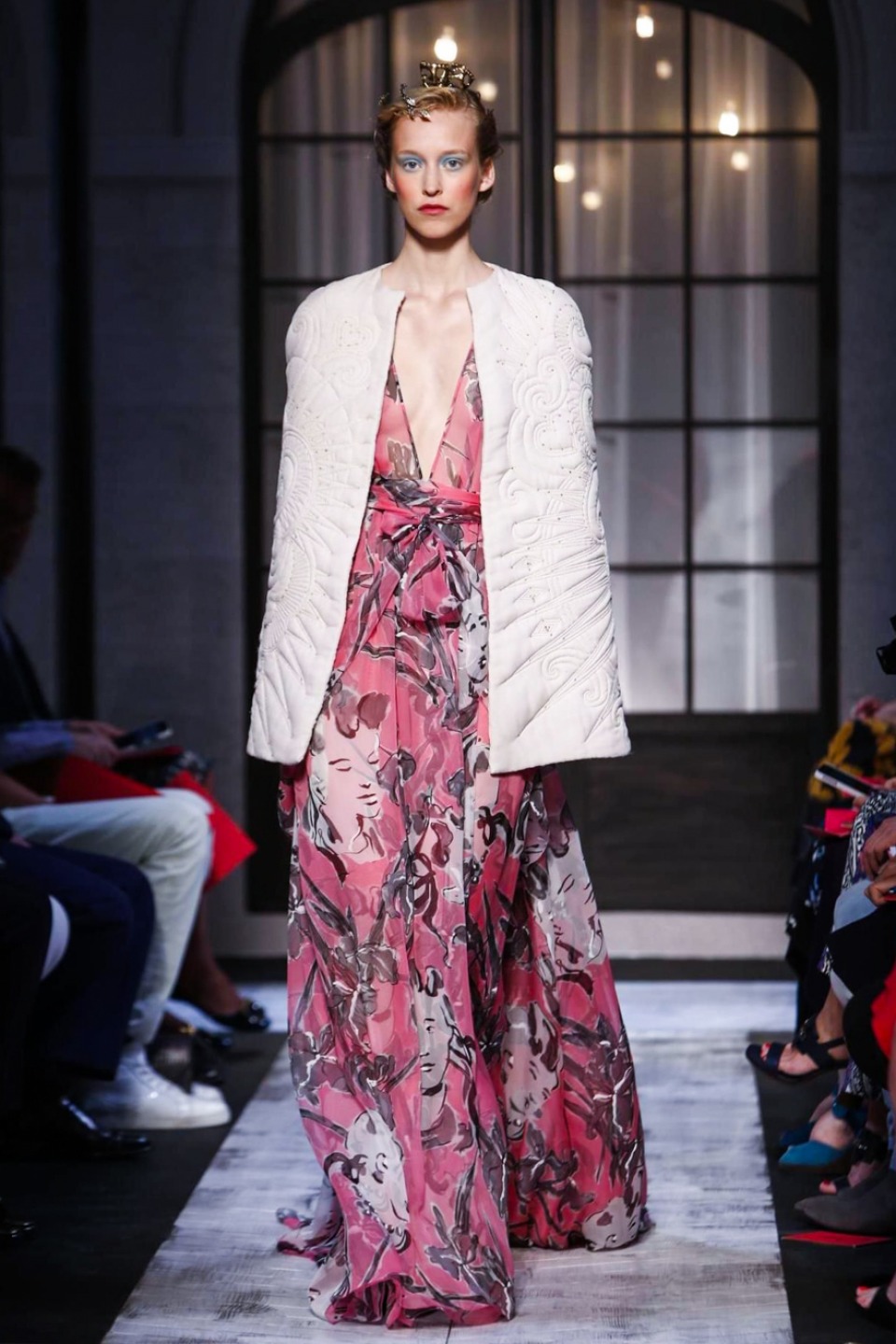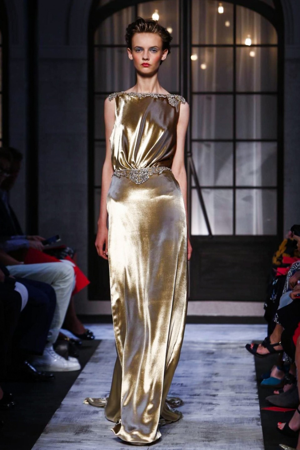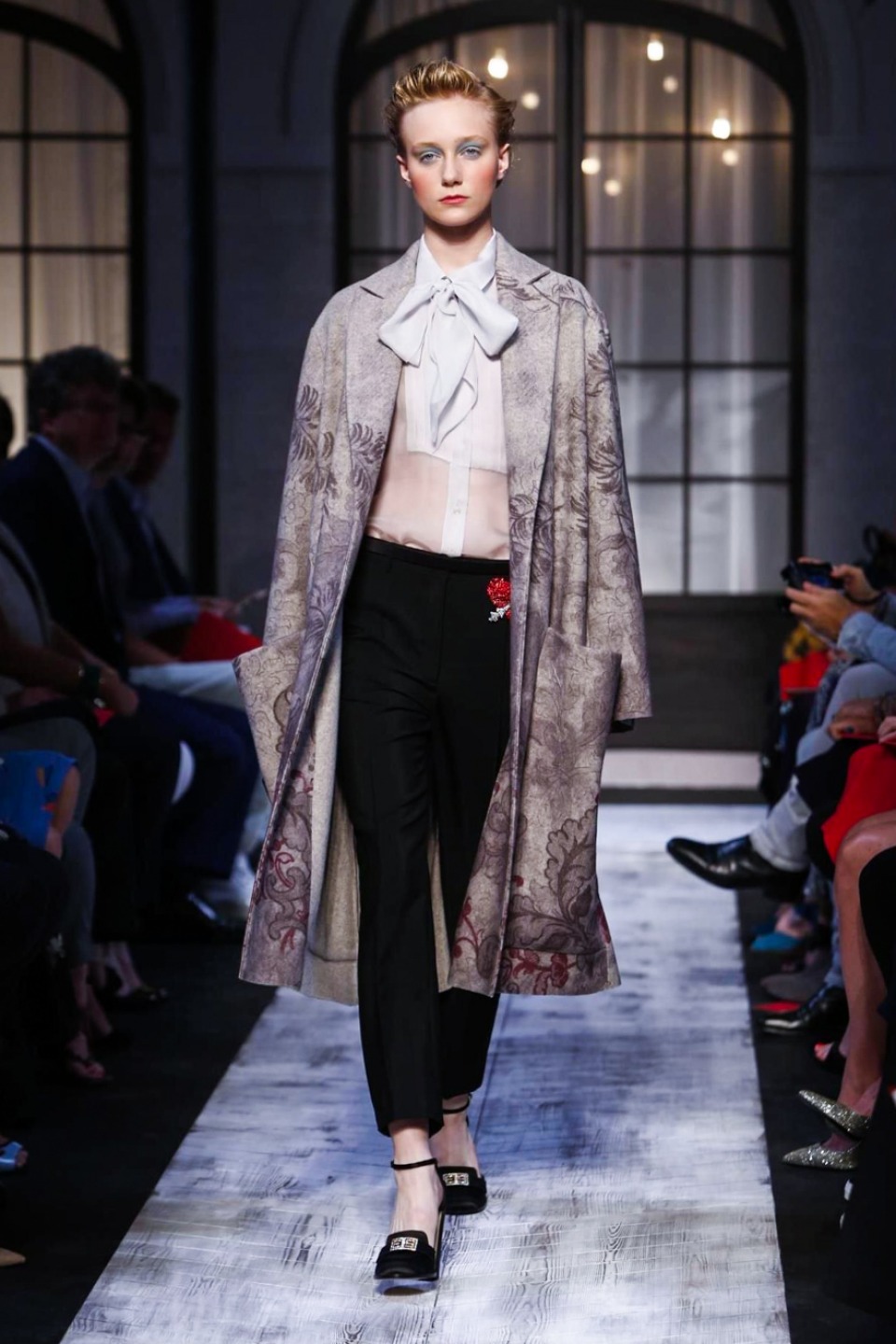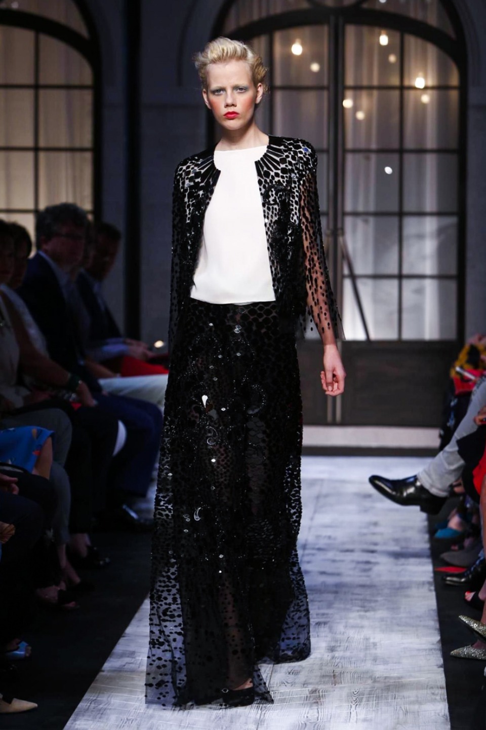 Bertrand Guyon’s debut collection for the recently re-established Italian house Schiaparelli was a strong one, in all senses of the word. Colors were bold and spirited, ranging from ruby reds and hot pinks to mermaid tones and zesty citrus hues. Clashing was also one of the collection’s main features, with loud beige plaids offset by pink furs and embellished blouses teamed with light, shimmery skirts.
