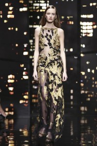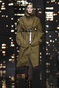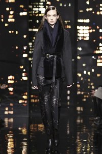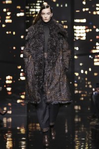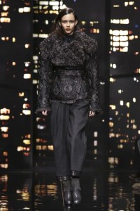Her proposed silhouette was long and layered but emphasised the waist by cinching it in with leather and obi belts as in a silk and metallic brocade tuxedo jacket over a crisp white shirt and a ribbon striped chiffon skirt. The most interesting suggestion was a multi-layered bustier (flannel, pinstripes, brocade and tulle) worn long over roomy trousers. If it sounds fussy it wasn’t. An alternative version had a cropped charcoal knit over handkerchief folds and a skirt with a high slit revealing a chiffon layer, but guess what? It was one piece, a dress. Feathers were embroidered on tailored coats, shirt and dress sleeves were billowing and an auburn leather aviator shearling jacket looked great over a pinstripe skirt as did a bronze waxed trench coat belted over a bodysuit. The embroidered organza dresses were dreamy and the image of a burnished gold lamé and felt tulle gown against that city backdrop was pretty unforgettable. Just like its City.