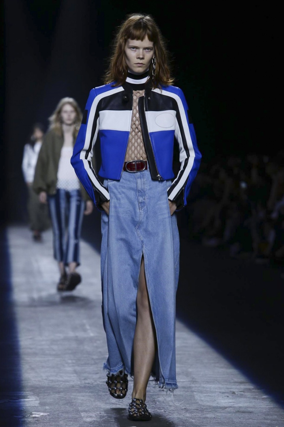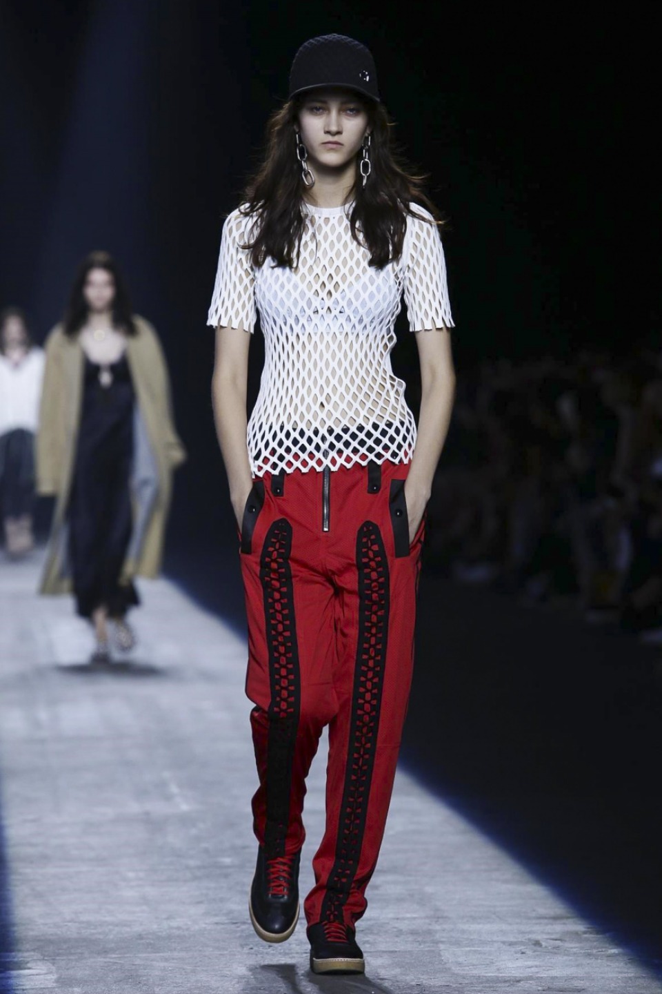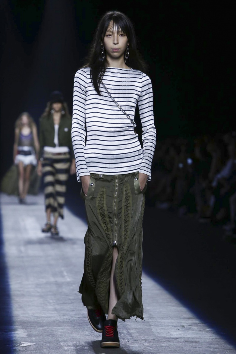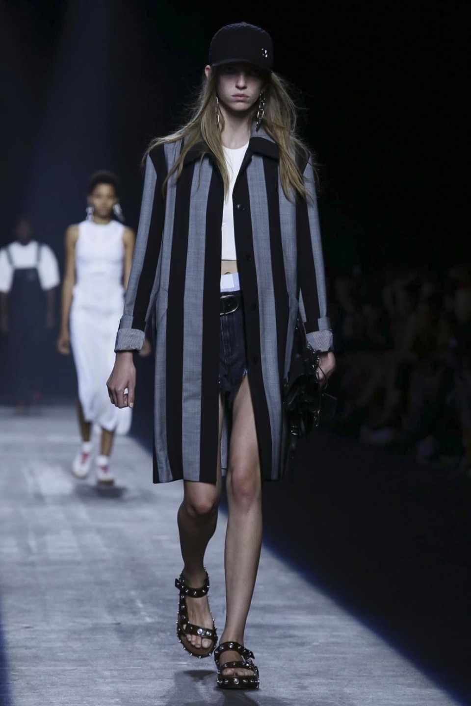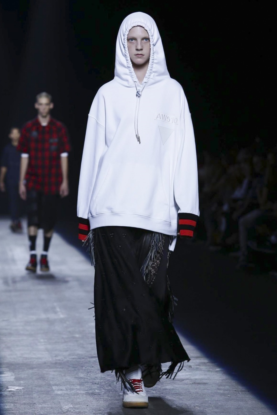 Trading in last season’s gothic inspired look, the new season featured more everyday staples including denim separates, military-inspired jackets and hoodies with a graphic edge. Bold stripes, chain link details, fringe and mesh made these wardrobe staples far from minimal. Wang also experimented with evening wear inspired looks in his own way with long, flowing dresses given a street style makeover when paired with oversized coats or baseball caps.