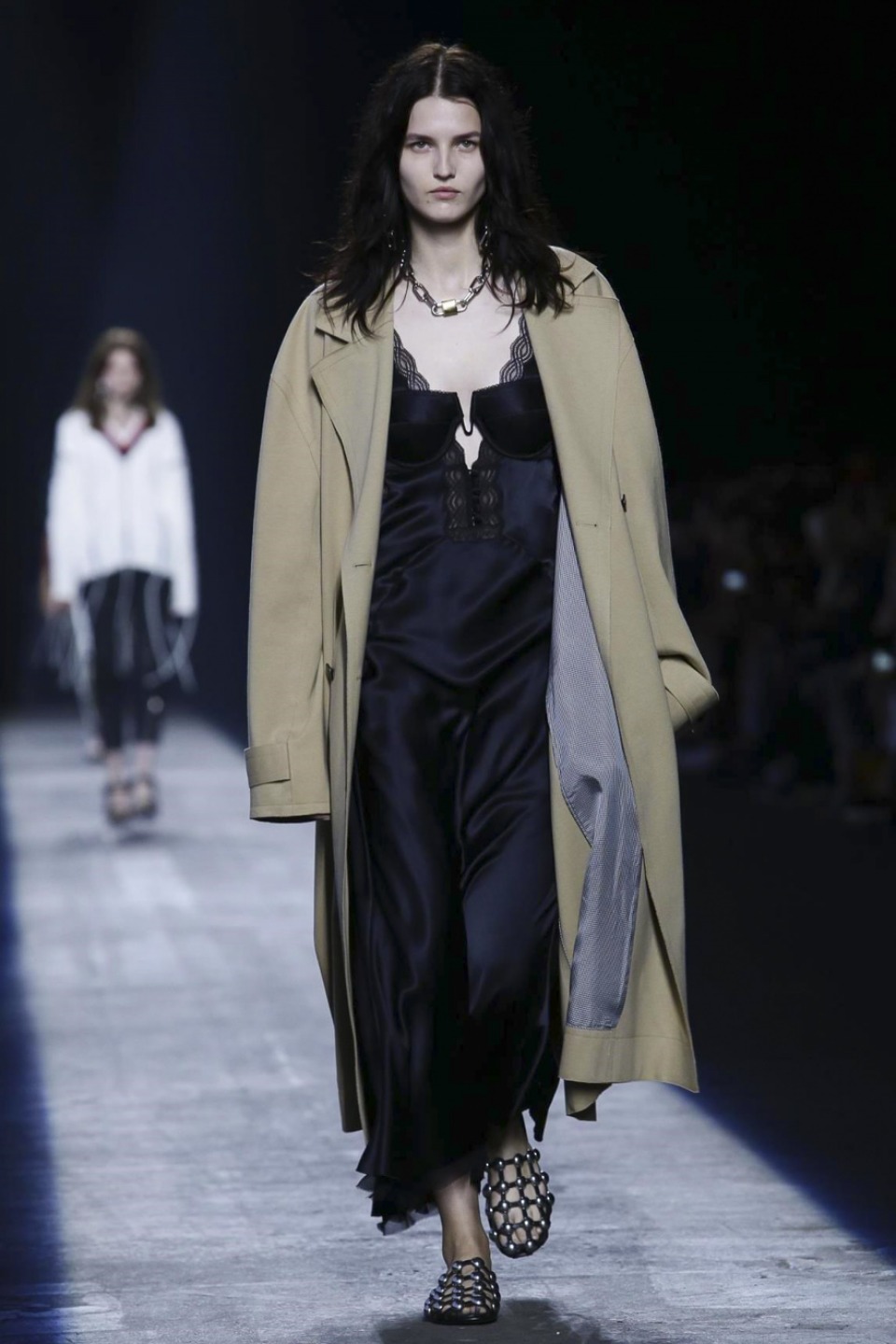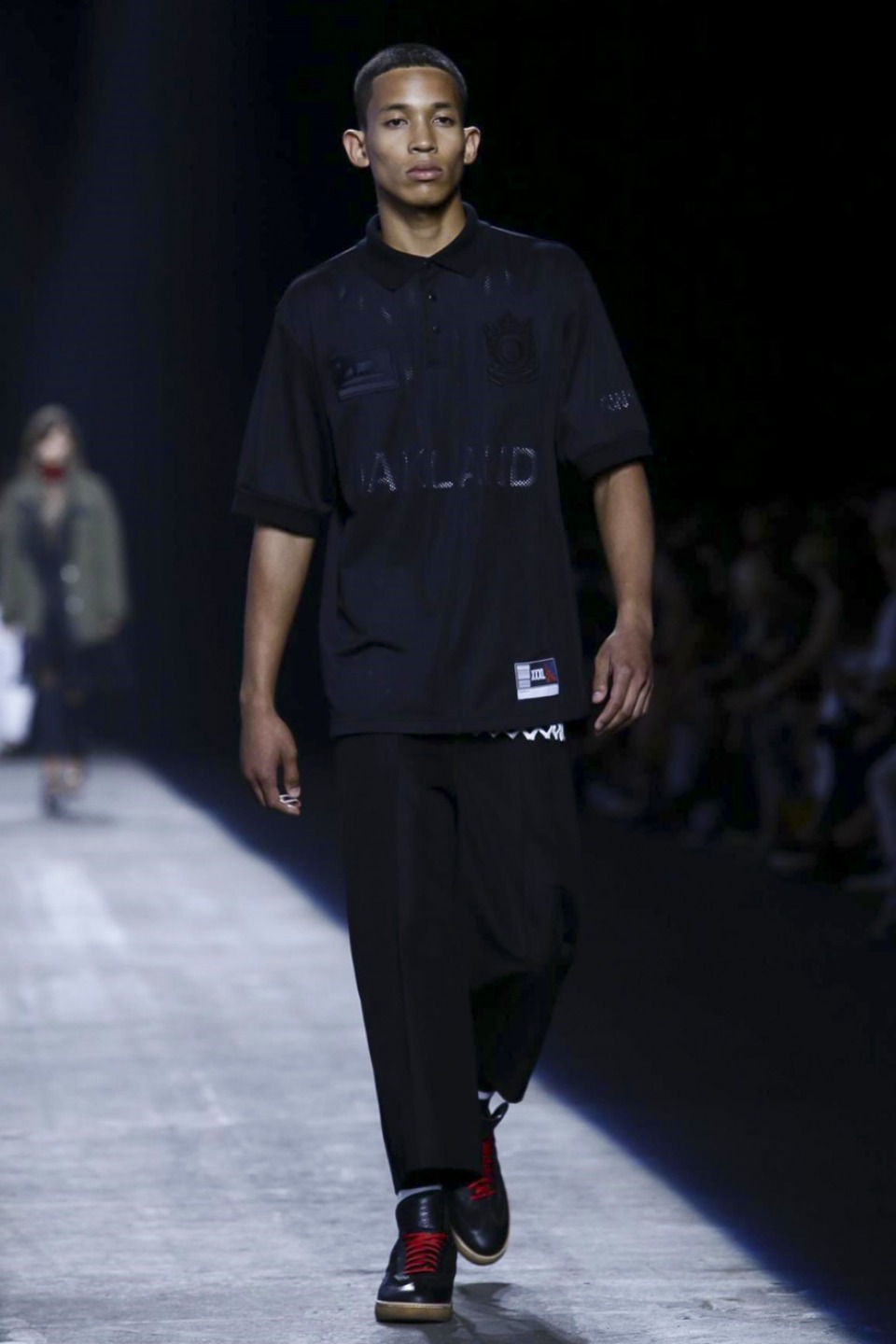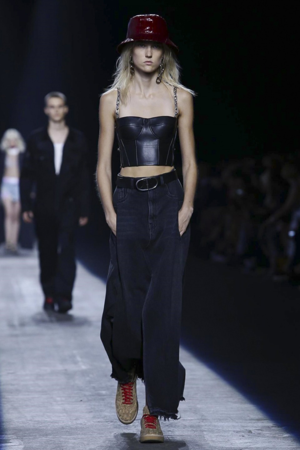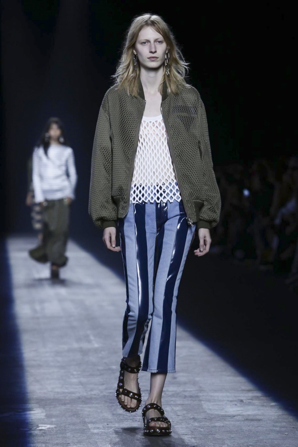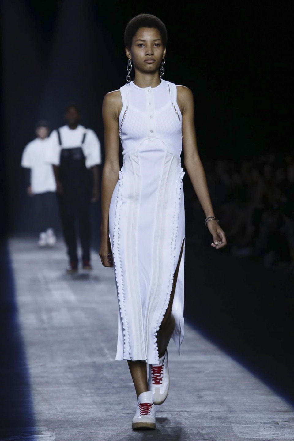 Trading in last season’s gothic inspired look, the new season featured more everyday staples including denim separates, military-inspired jackets and hoodies with a graphic edge. Bold stripes, chain link details, fringe and mesh made these wardrobe staples far from minimal. Wang also experimented with evening wear inspired looks in his own way with long, flowing dresses given a street style makeover when paired with oversized coats or baseball caps.