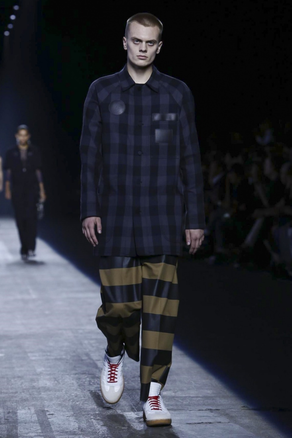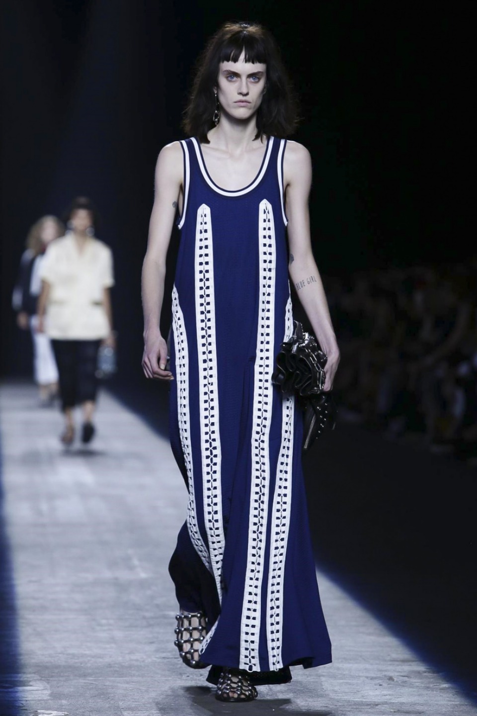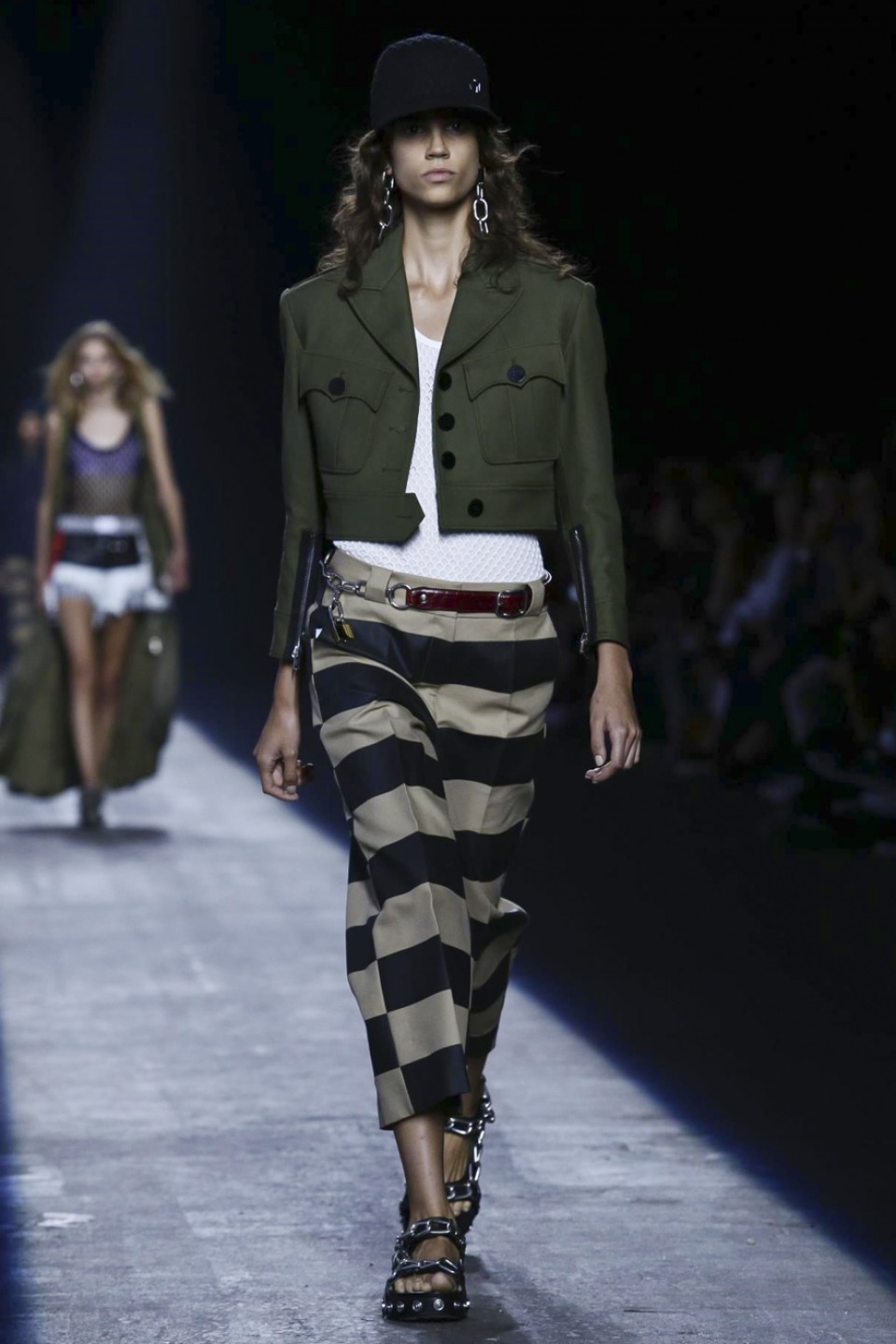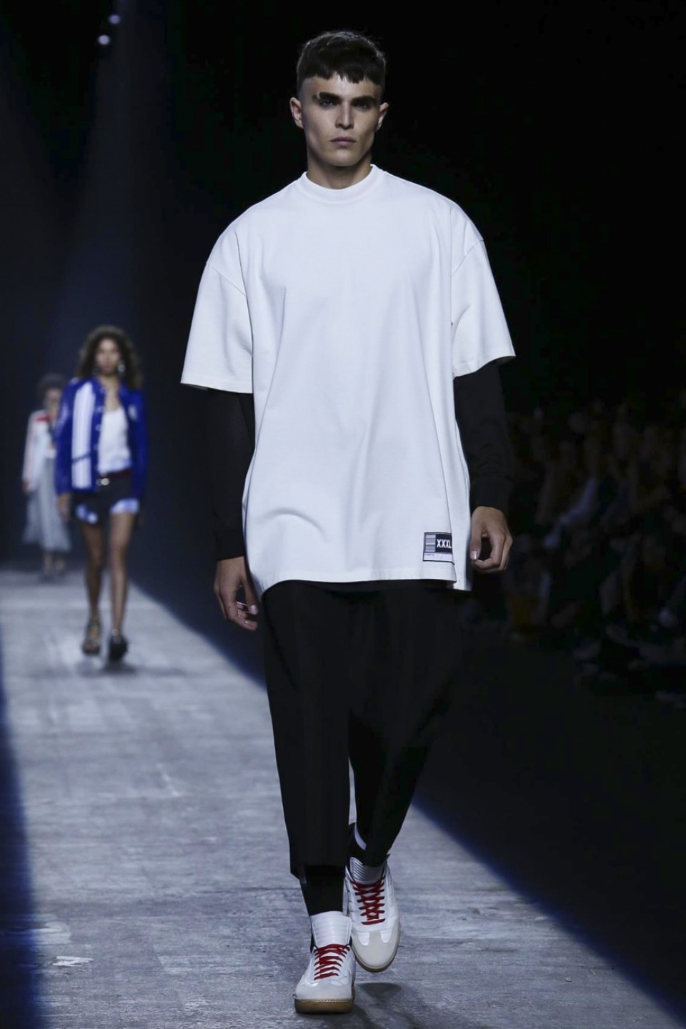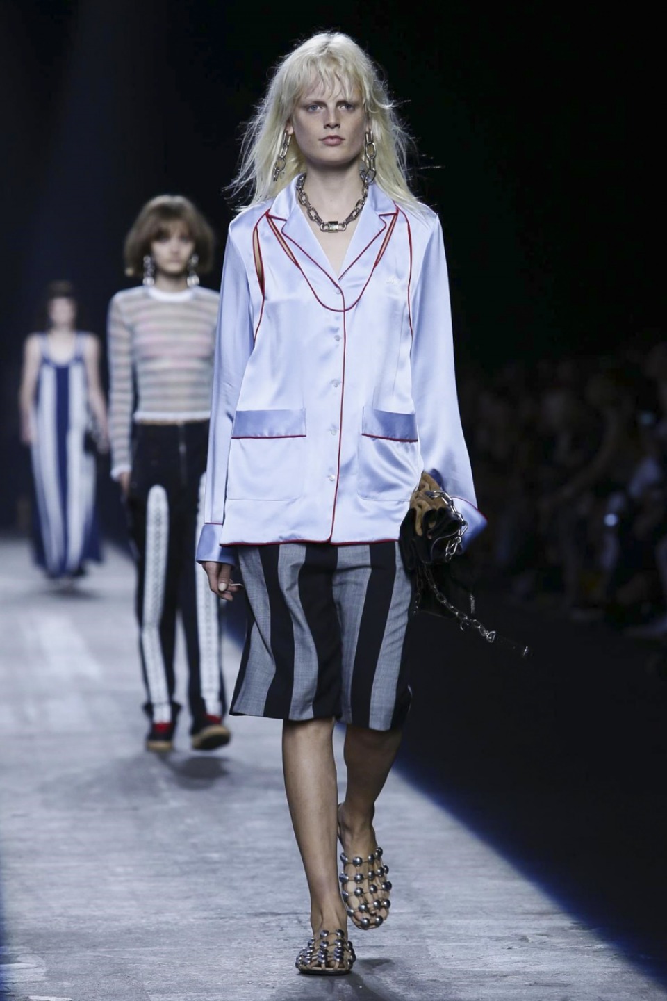 Trading in last season’s gothic inspired look, the new season featured more everyday staples including denim separates, military-inspired jackets and hoodies with a graphic edge. Bold stripes, chain link details, fringe and mesh made these wardrobe staples far from minimal. Wang also experimented with evening wear inspired looks in his own way with long, flowing dresses given a street style makeover when paired with oversized coats or baseball caps.