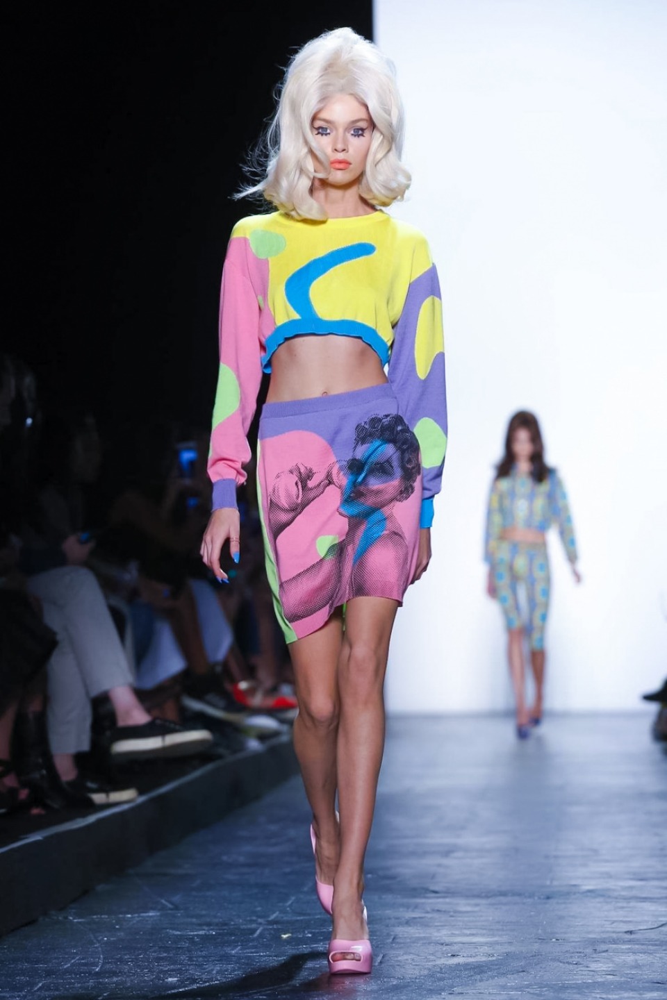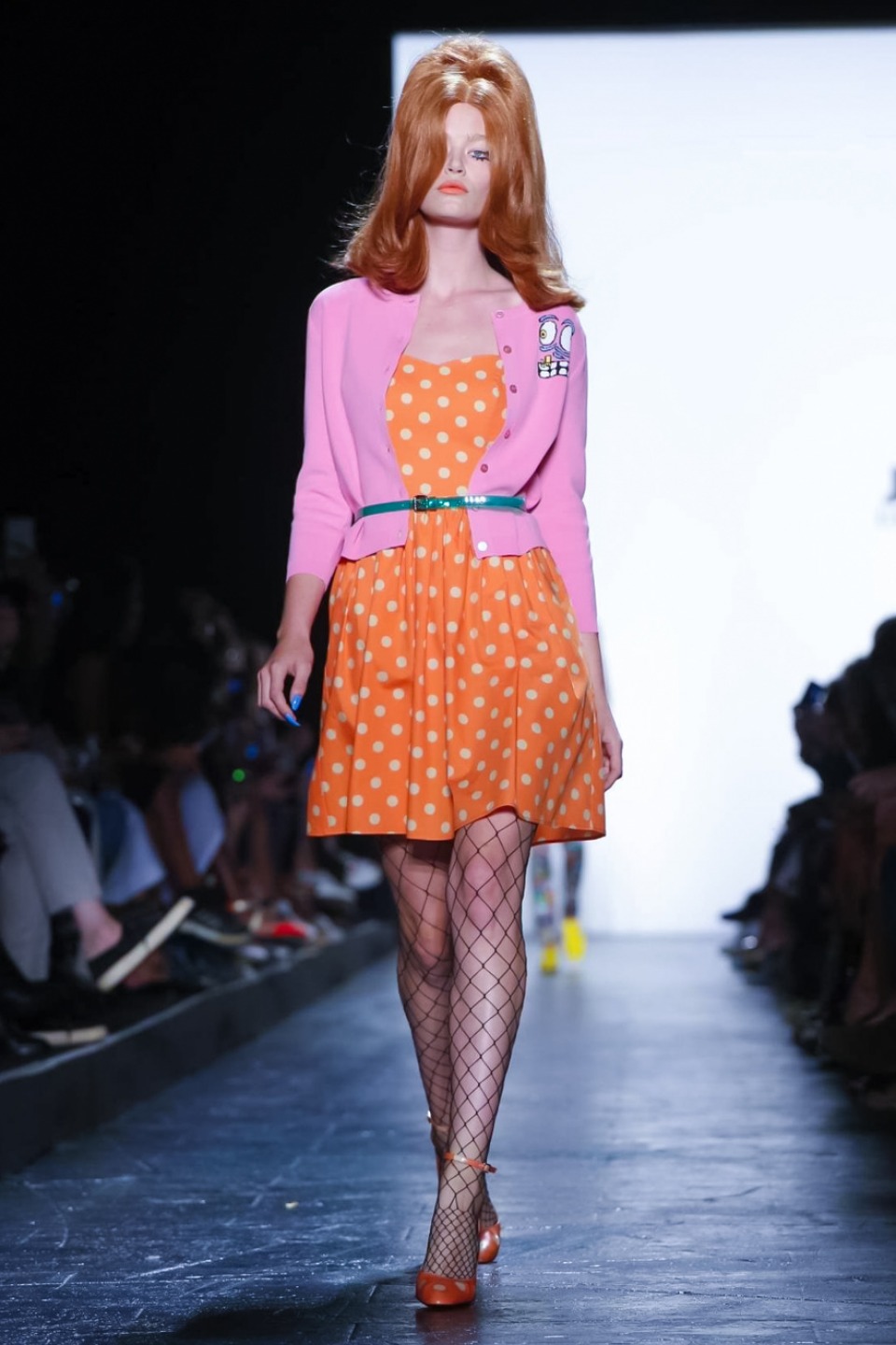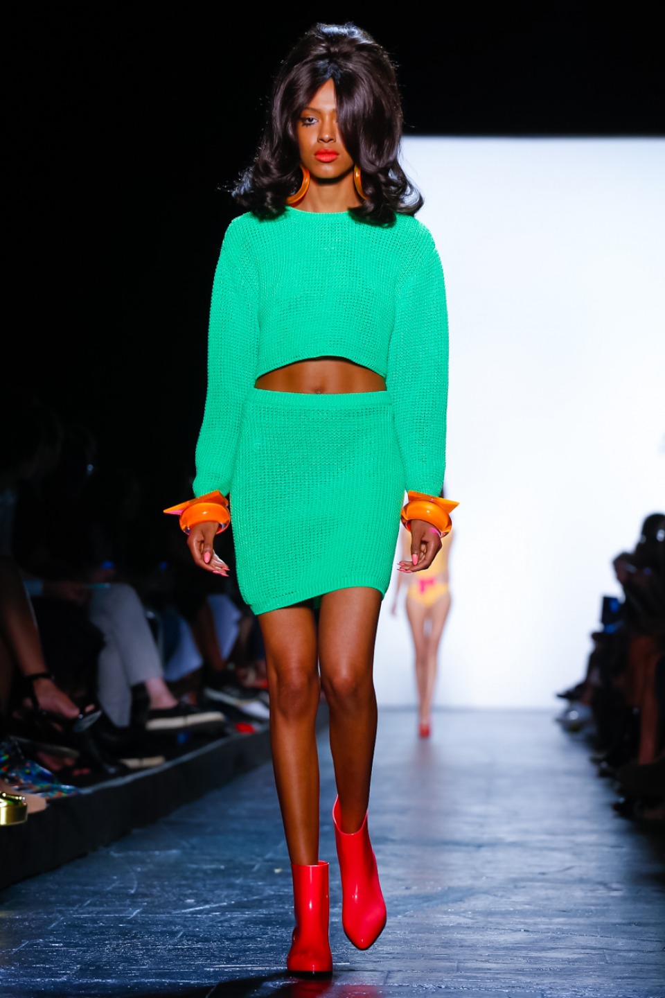 it seems Jeremy Scott noted inspiration from the club scene and John Waters films with his colorful mix of shift dresses, crop tops, bikinis and retro-flavored separates. Models including Gigi Hadid, Stella Maxwell as well as Bella Hadid, each walked out with matching bouffant, super-teased wigs, orange lips and glued on nails with long talons.