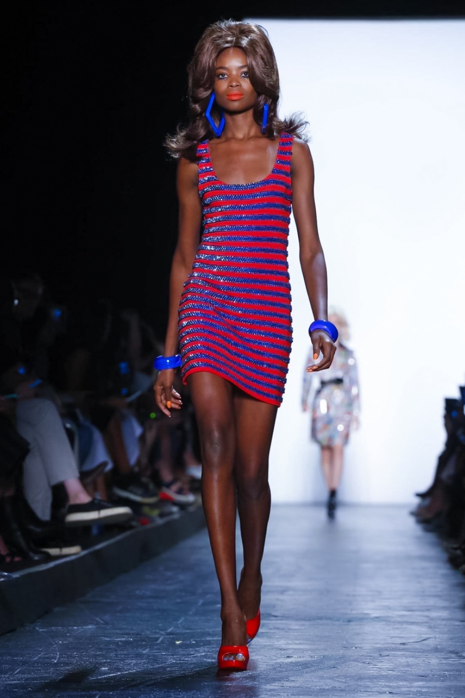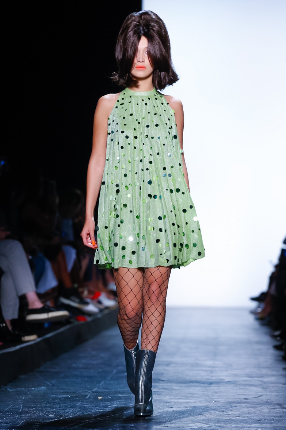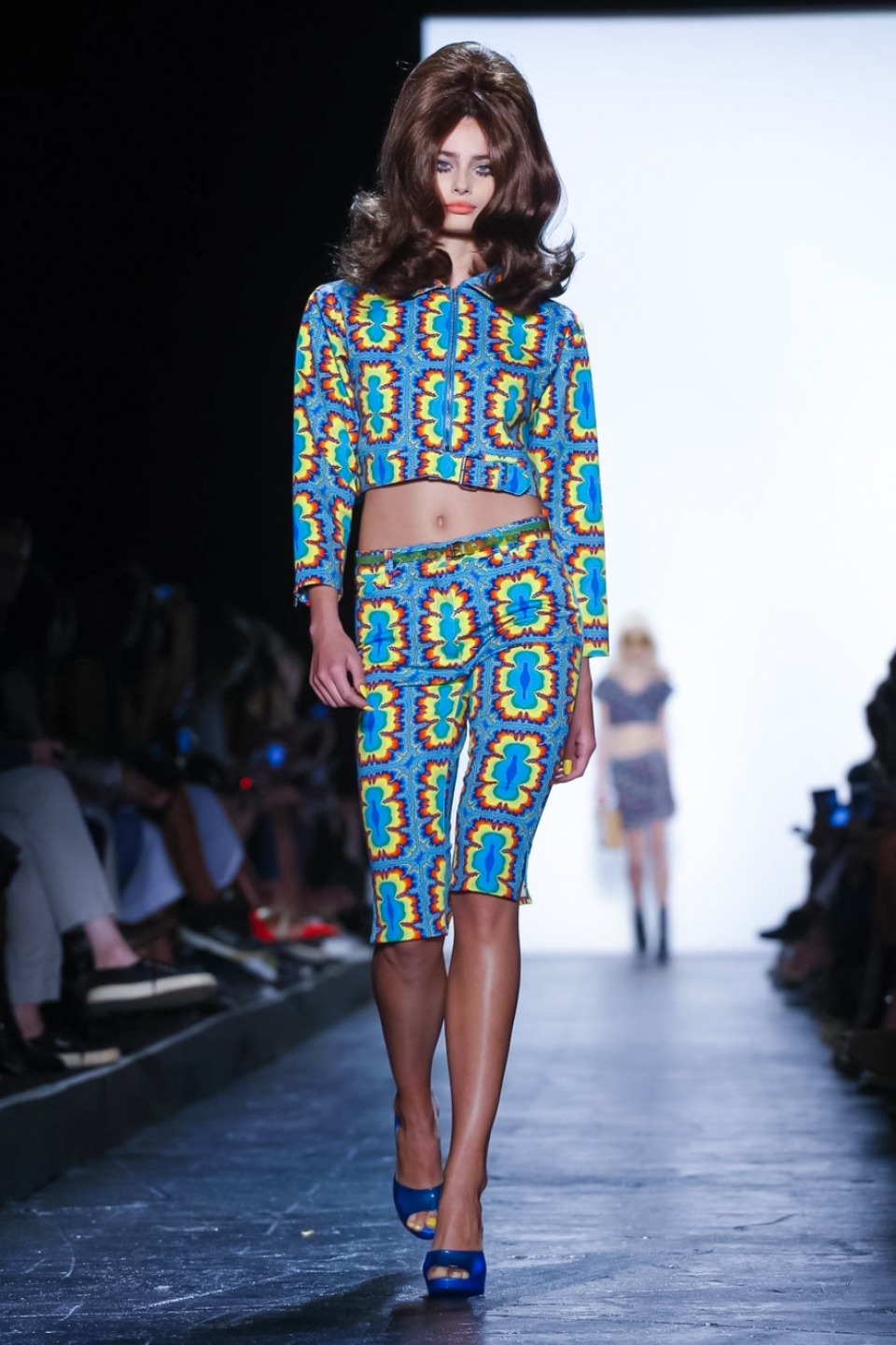 it seems Jeremy Scott noted inspiration from the club scene and John Waters films with his colorful mix of shift dresses, crop tops, bikinis and retro-flavored separates. Models including Gigi Hadid, Stella Maxwell as well as Bella Hadid, each walked out with matching bouffant, super-teased wigs, orange lips and glued on nails with long talons.