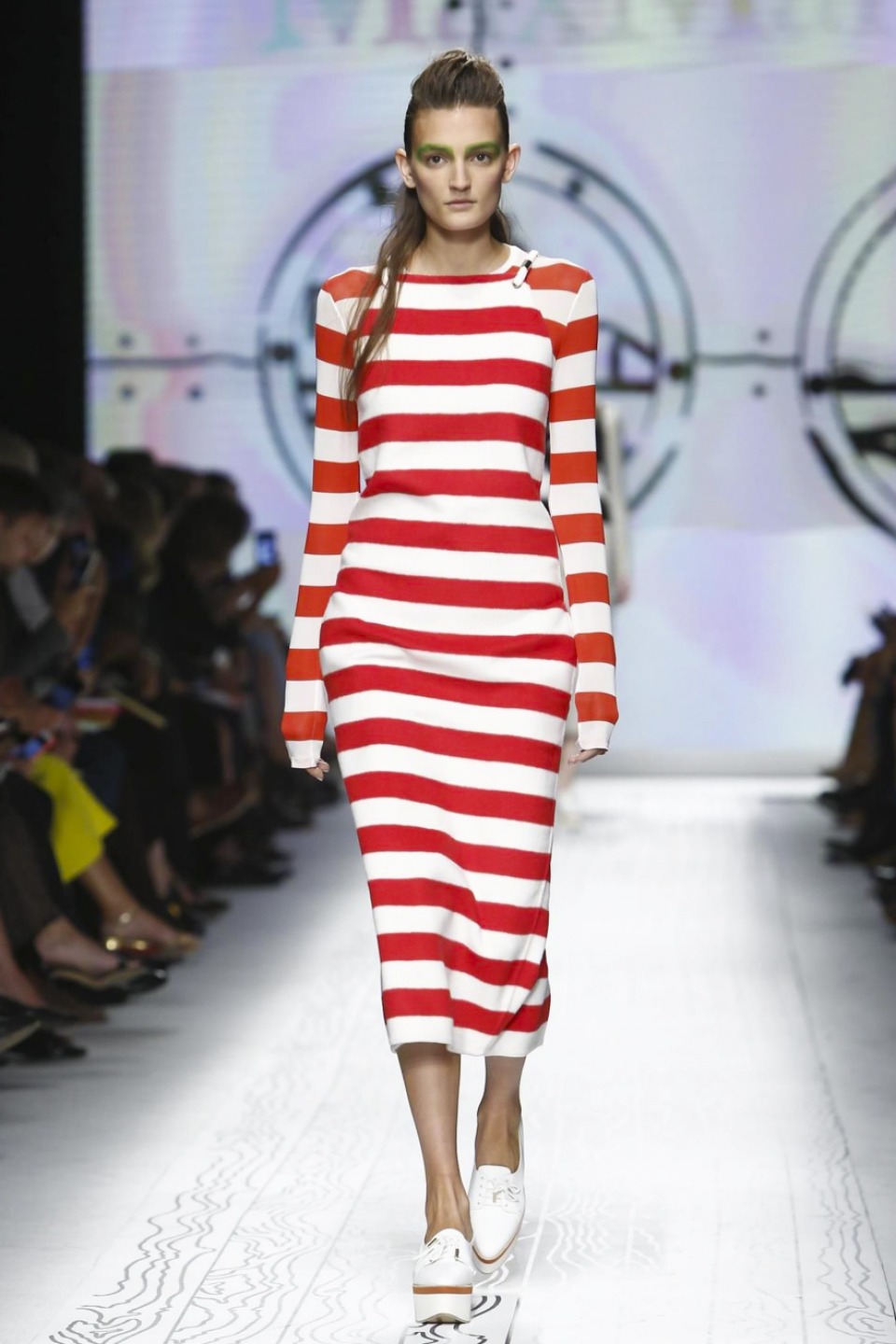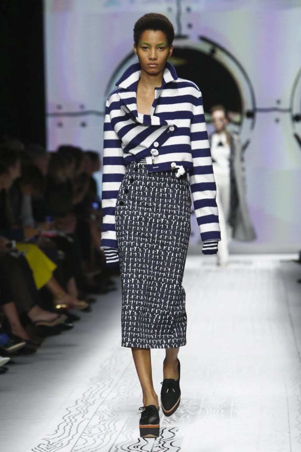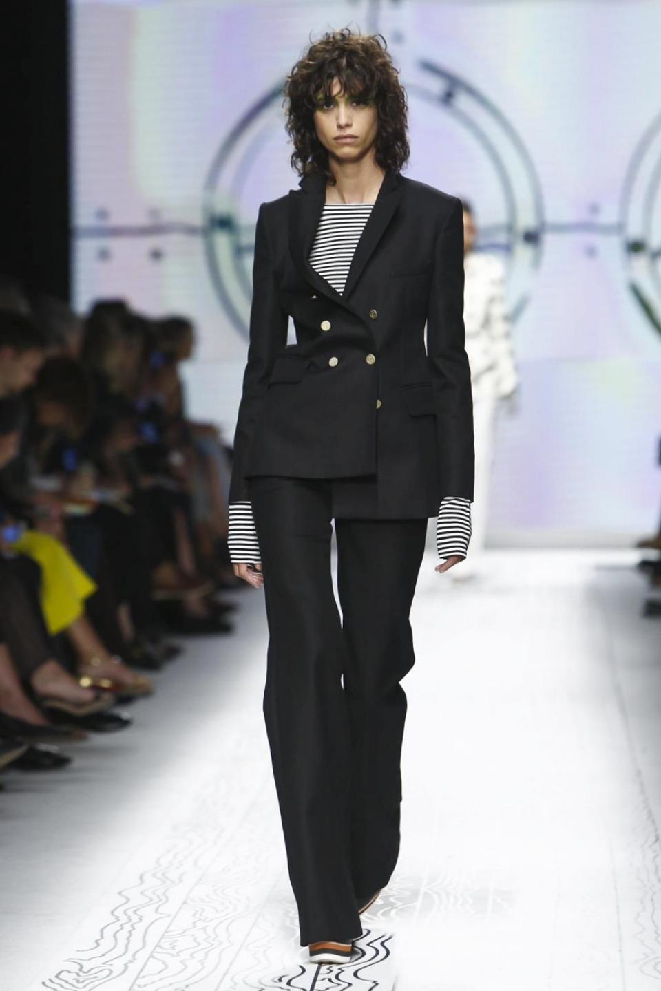 This season the muse role is played by sailors of the sea. A masculine genre, which alsways looks great on confident women who prefer comfort over frivolous trends. But what is really enticing about the mariner theme itself, is that it conjures a spirit of travel, new beginnings, and escapism. Huge duffle sacks were ready for a summer voyage , rope cord fastened through the necklines and trousers were brass-buttoned for On The Town Appeal. Stripes in red and blue of course ticked the nautical box; and T-shirts sported inky porthole illustrations.