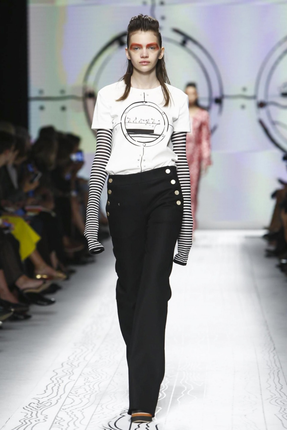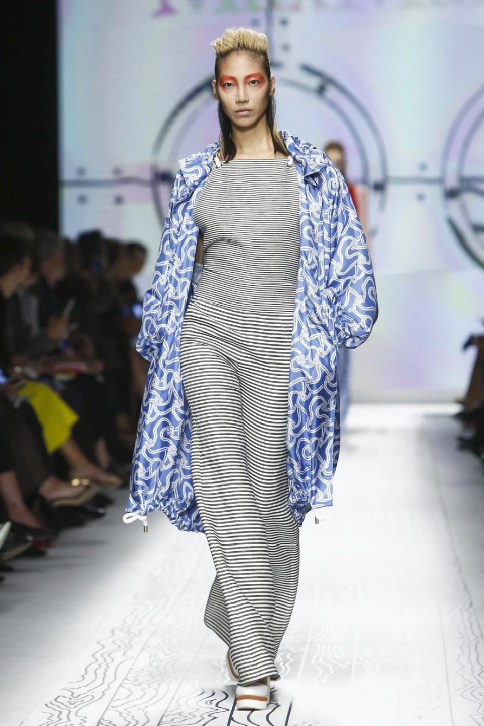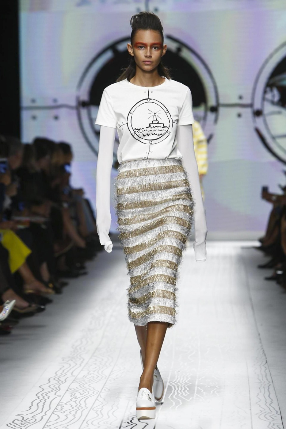 This season the muse role is played by sailors of the sea. A masculine genre, which alsways looks great on confident women who prefer comfort over frivolous trends. But what is really enticing about the mariner theme itself, is that it conjures a spirit of travel, new beginnings, and escapism. Huge duffle sacks were ready for a summer voyage , rope cord fastened through the necklines and trousers were brass-buttoned for On The Town Appeal. Stripes in red and blue of course ticked the nautical box; and T-shirts sported inky porthole illustrations.