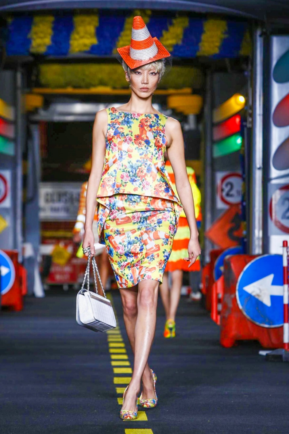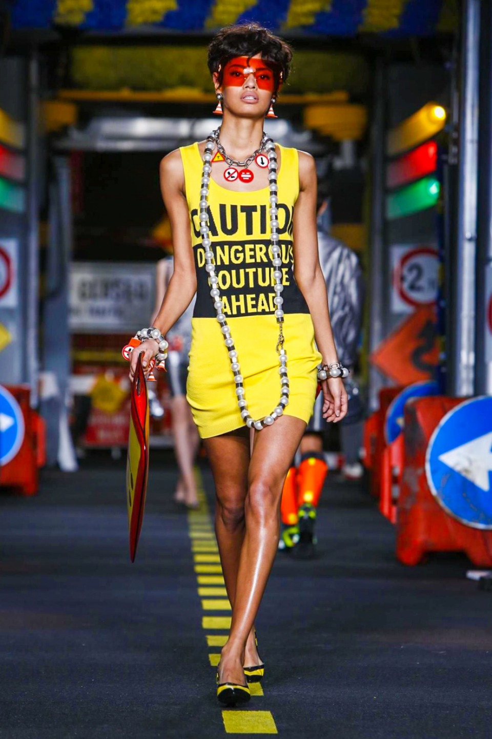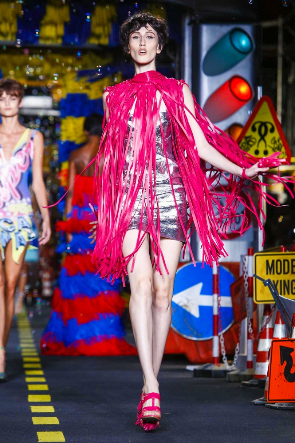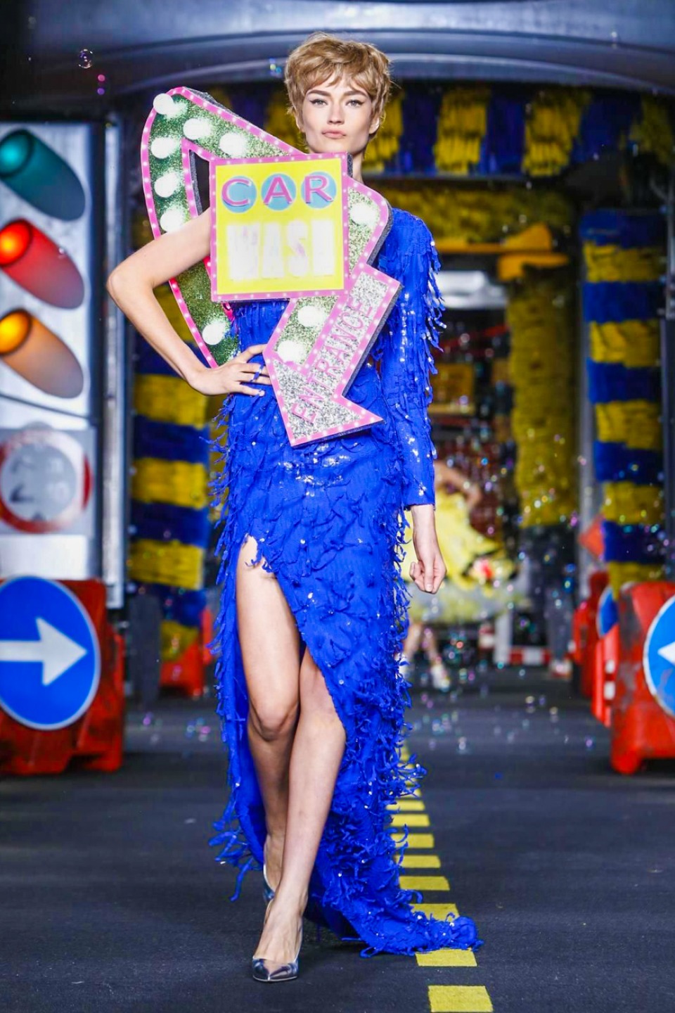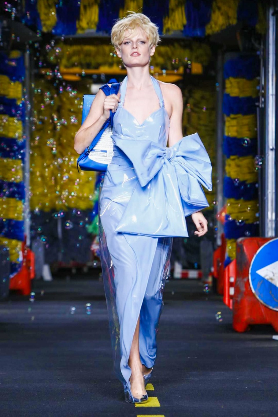 One is sure, Jeremy Scott has a lot of fun at Moschino. Season by season, the ideas get zanier, but the productions keep getting bigger. The Spring/Summer 2015 theme of Moschino by Jeremy Scott is a “ Car-Wash“ Couture. Traffic cones, barricades, and a genuine car wash that sprayed bubbles instead of water were installed on the runway. “No Parking, Couture Zone,” one sign read; another: “Dangerous Couture Ahead.”