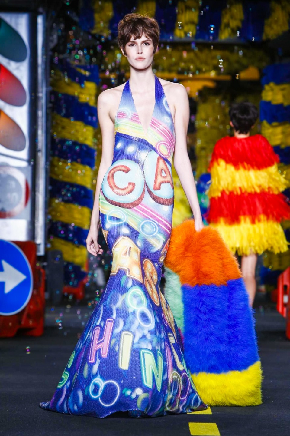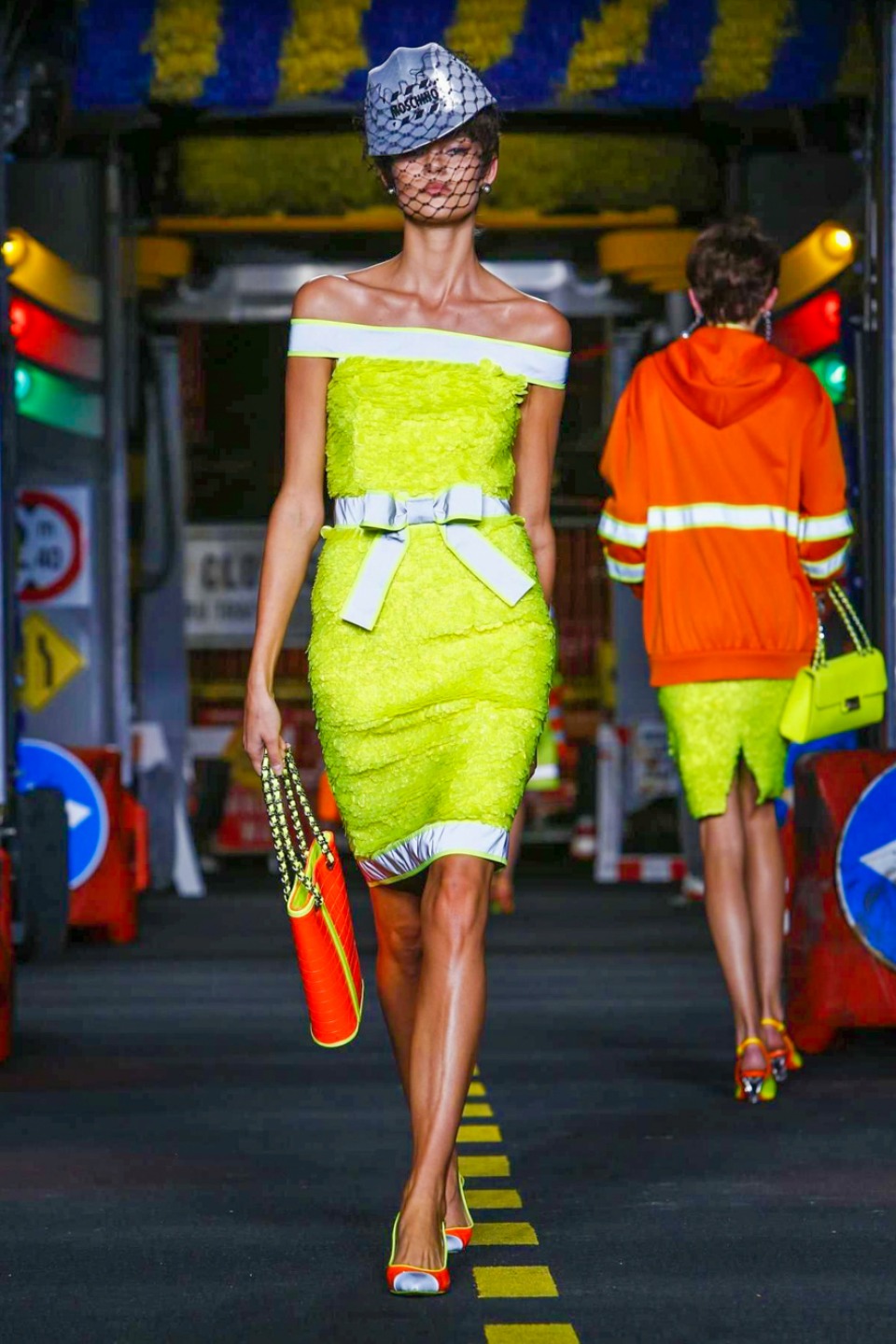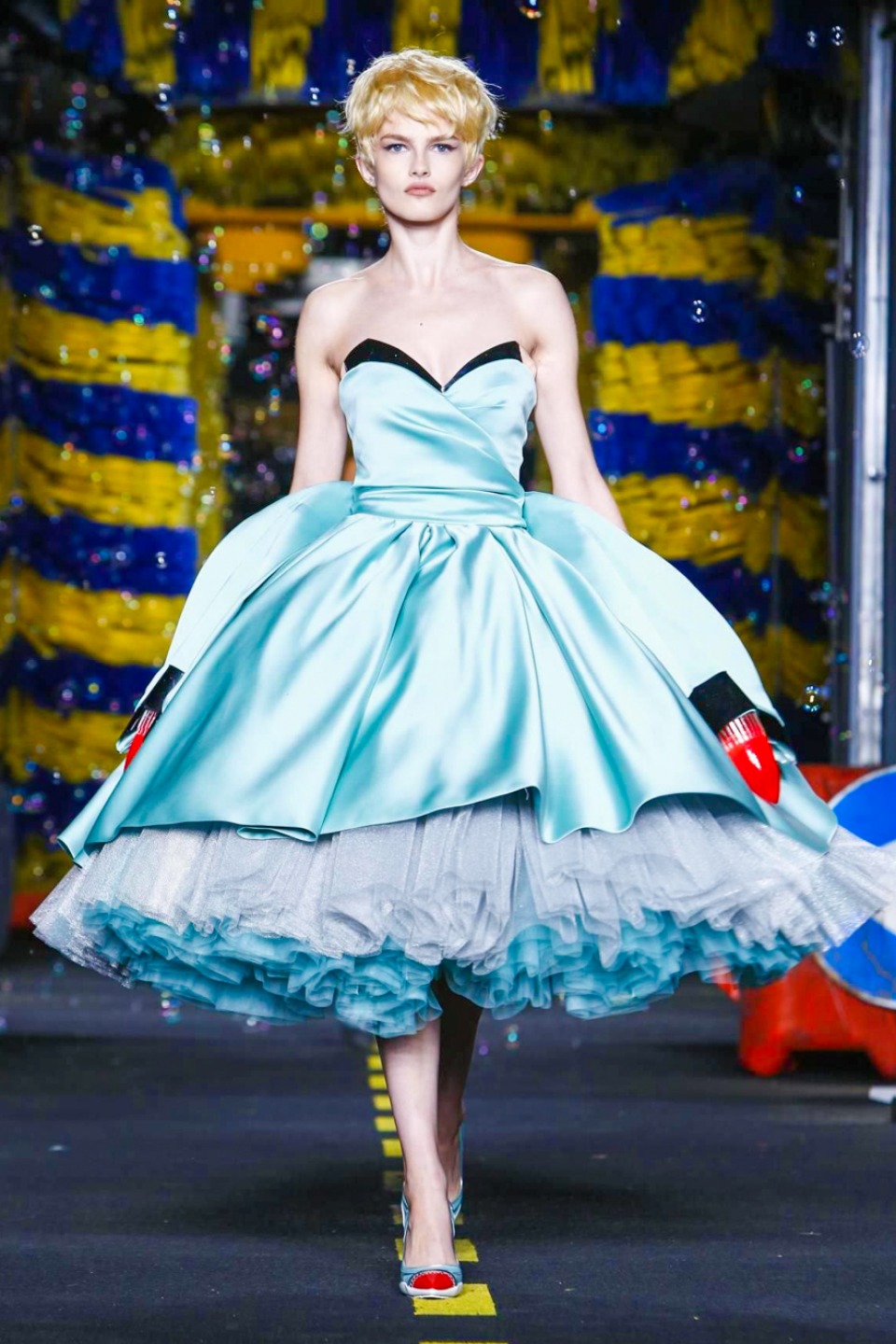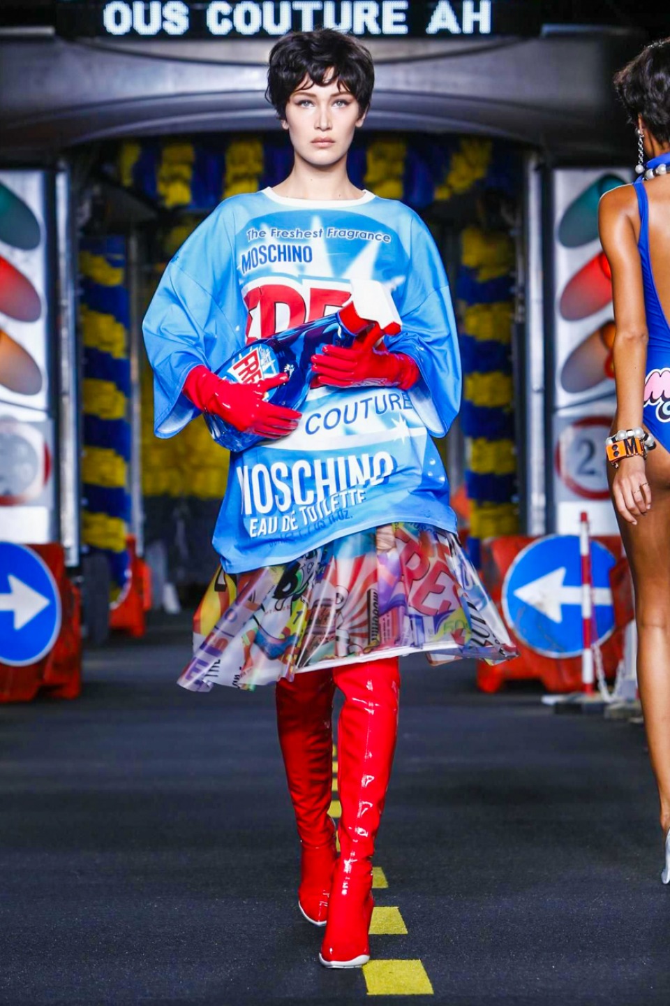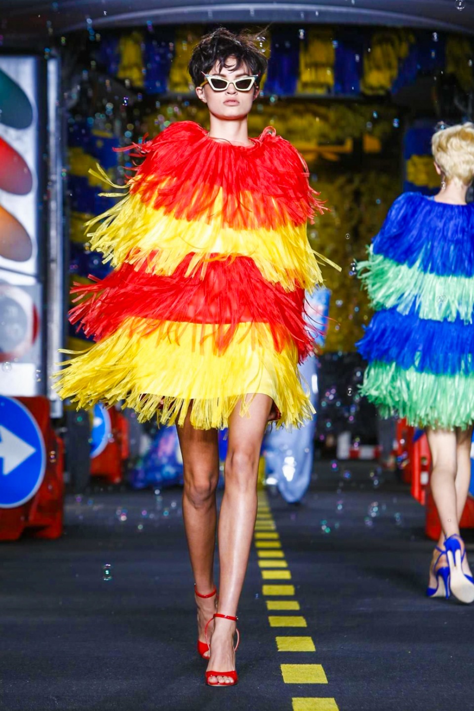 One is sure, Jeremy Scott has a lot of fun at Moschino. Season by season, the ideas get zanier, but the productions keep getting bigger. The Spring/Summer 2015 theme of Moschino by Jeremy Scott is a “ Car-Wash“ Couture. Traffic cones, barricades, and a genuine car wash that sprayed bubbles instead of water were installed on the runway. “No Parking, Couture Zone,” one sign read; another: “Dangerous Couture Ahead.”