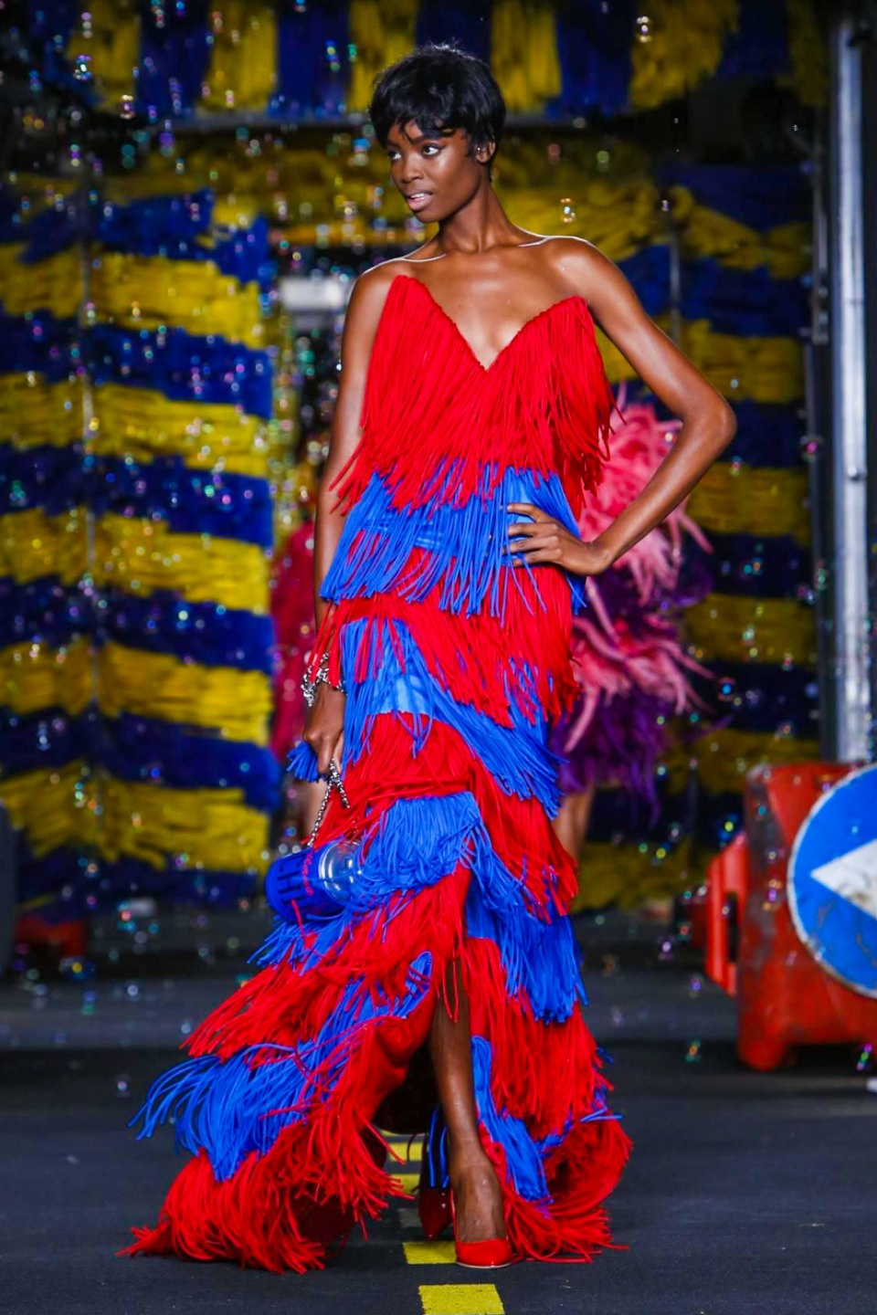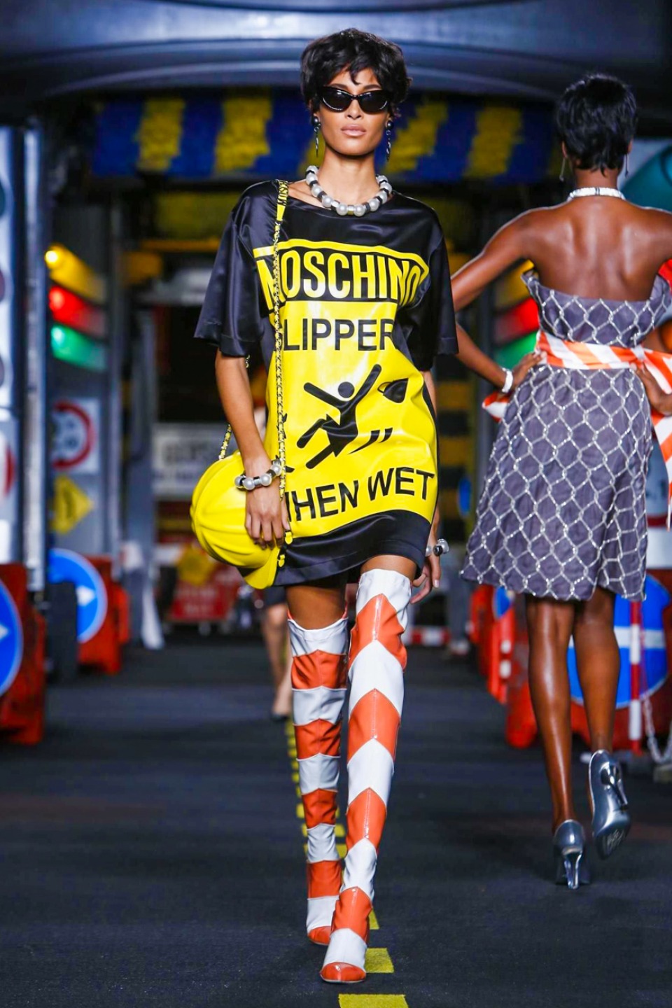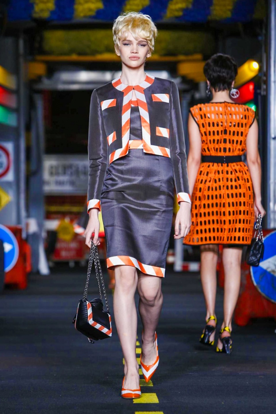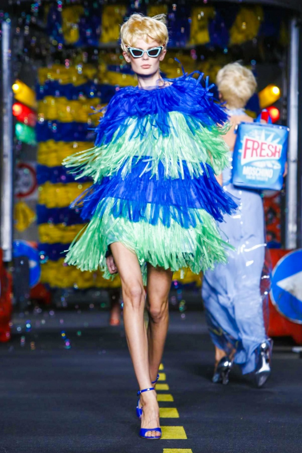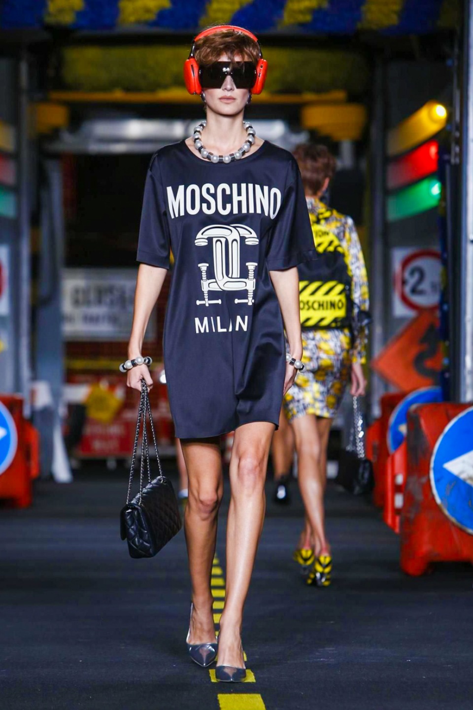 One is sure, Jeremy Scott has a lot of fun at Moschino. Season by season, the ideas get zanier, but the productions keep getting bigger. The Spring/Summer 2015 theme of Moschino by Jeremy Scott is a “ Car-Wash“ Couture. Traffic cones, barricades, and a genuine car wash that sprayed bubbles instead of water were installed on the runway. “No Parking, Couture Zone,” one sign read; another: “Dangerous Couture Ahead.”