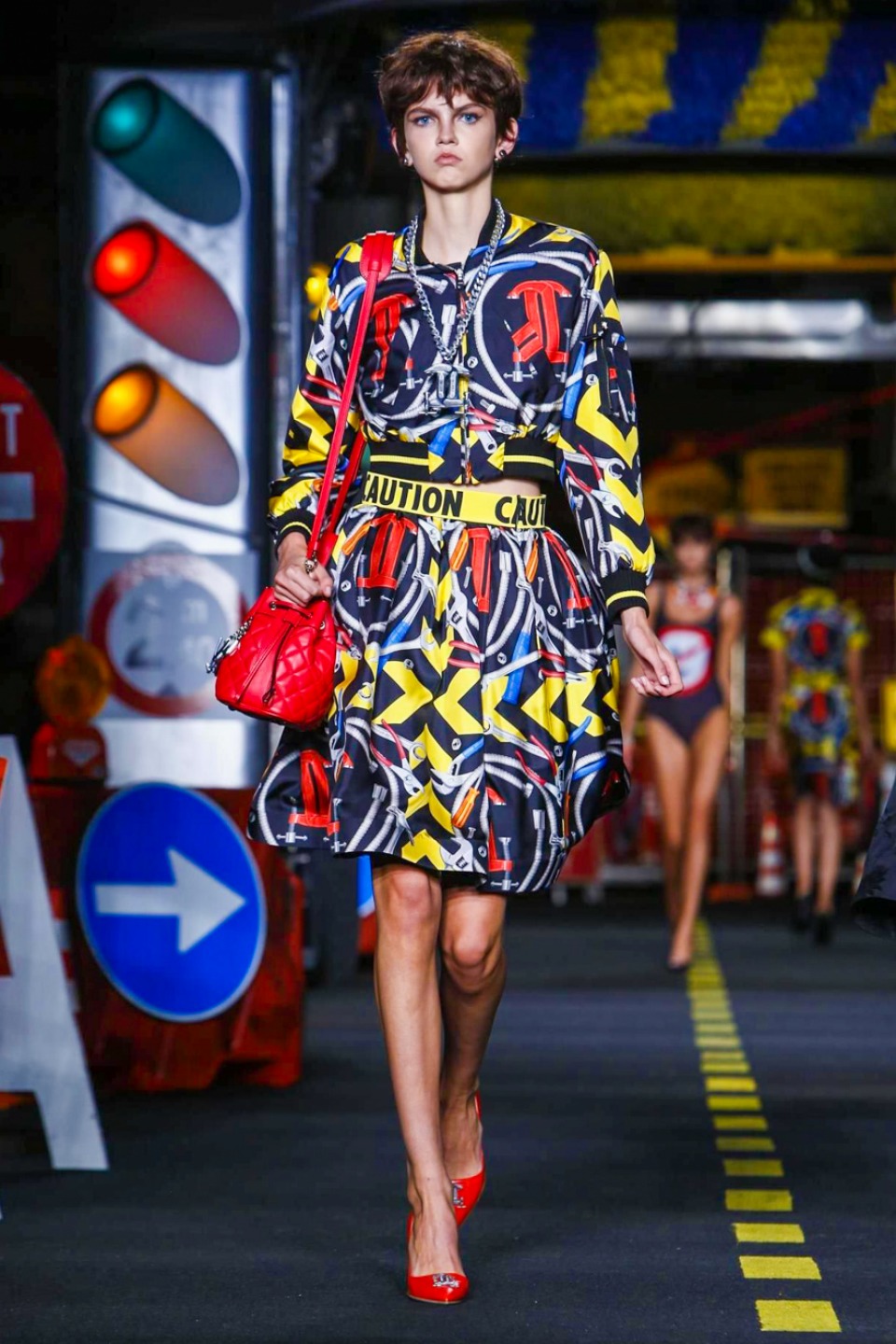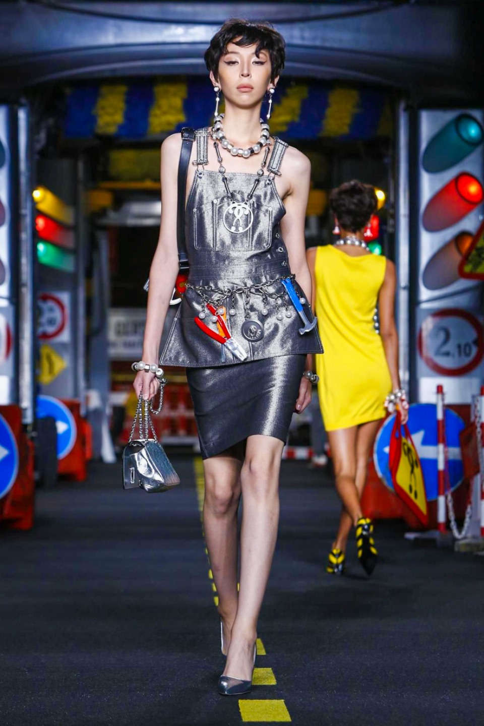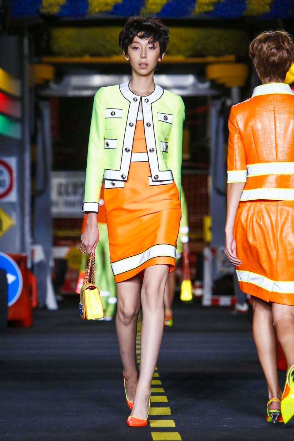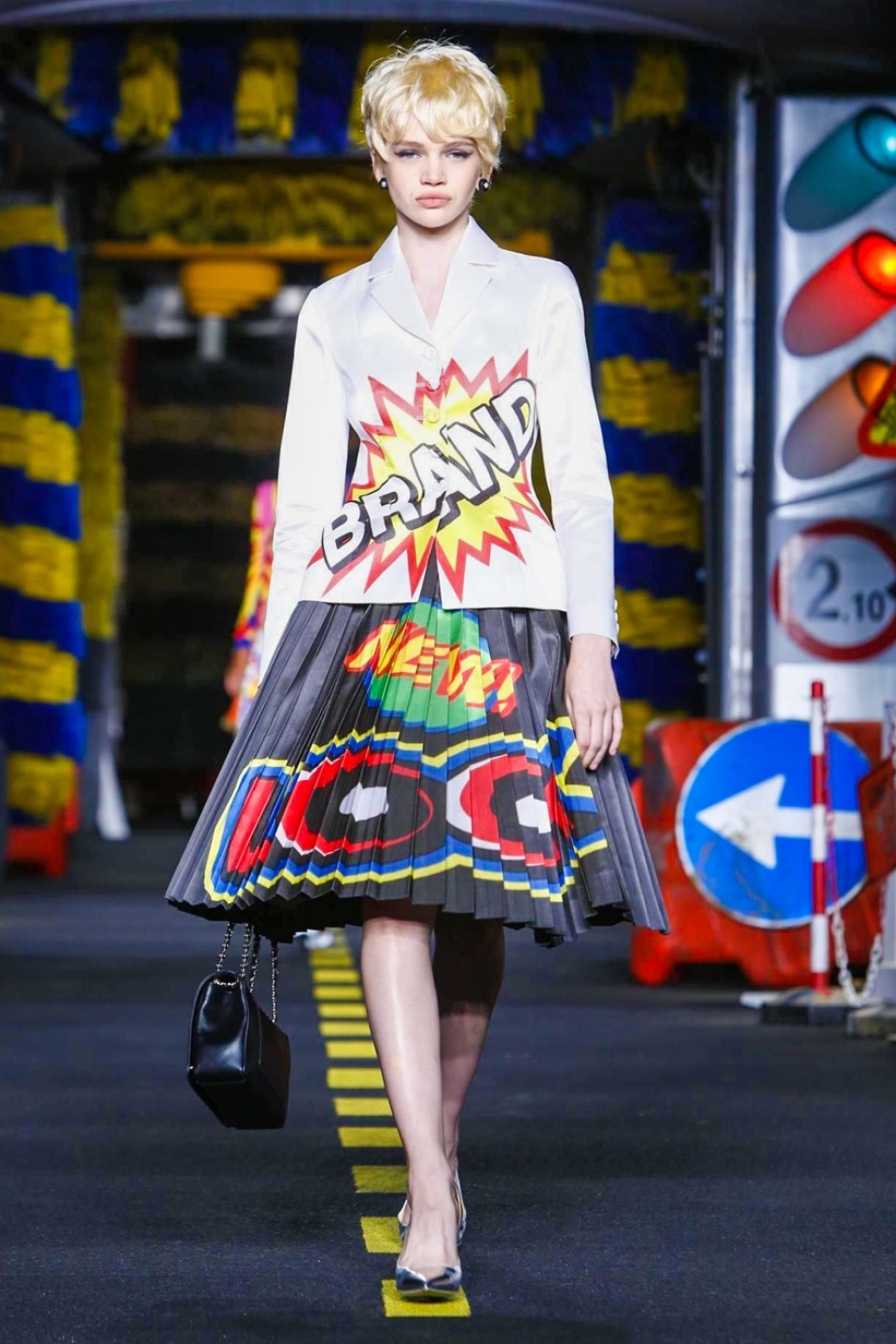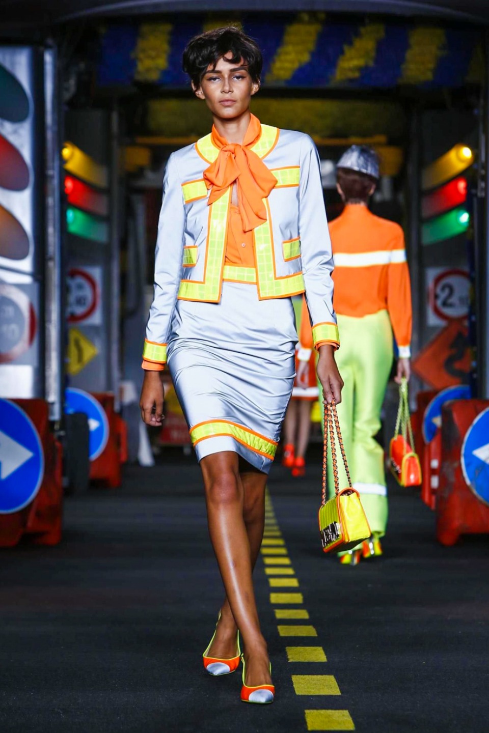One is sure, Jeremy Scott has a lot of fun at Moschino. Season by season, the ideas get zanier, but the productions keep getting bigger. The Spring/Summer 2015 theme of Moschino by Jeremy Scott is a “ Car-Wash“ Couture. Traffic cones, barricades, and a genuine car wash that sprayed bubbles instead of water were installed on the runway. “No Parking, Couture Zone,” one sign read; another: “Dangerous Couture Ahead.”