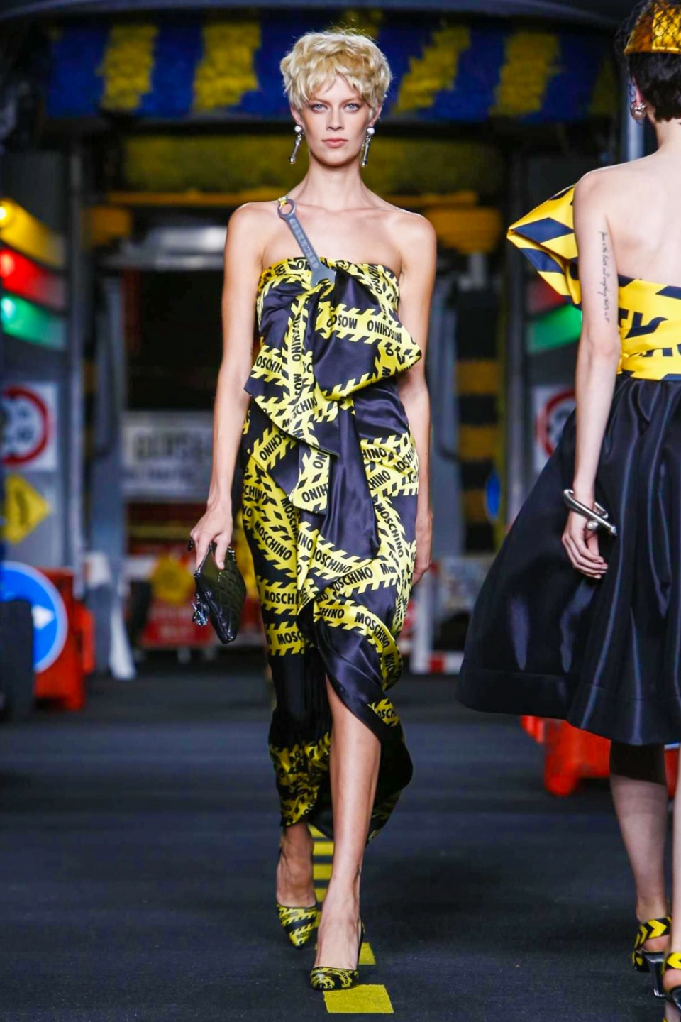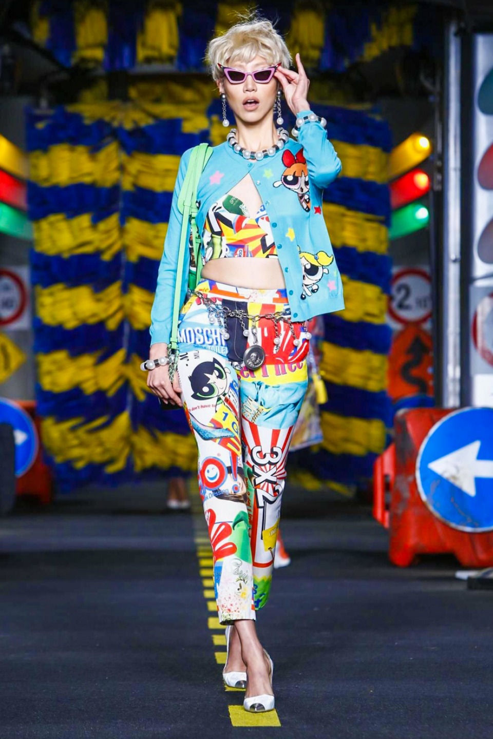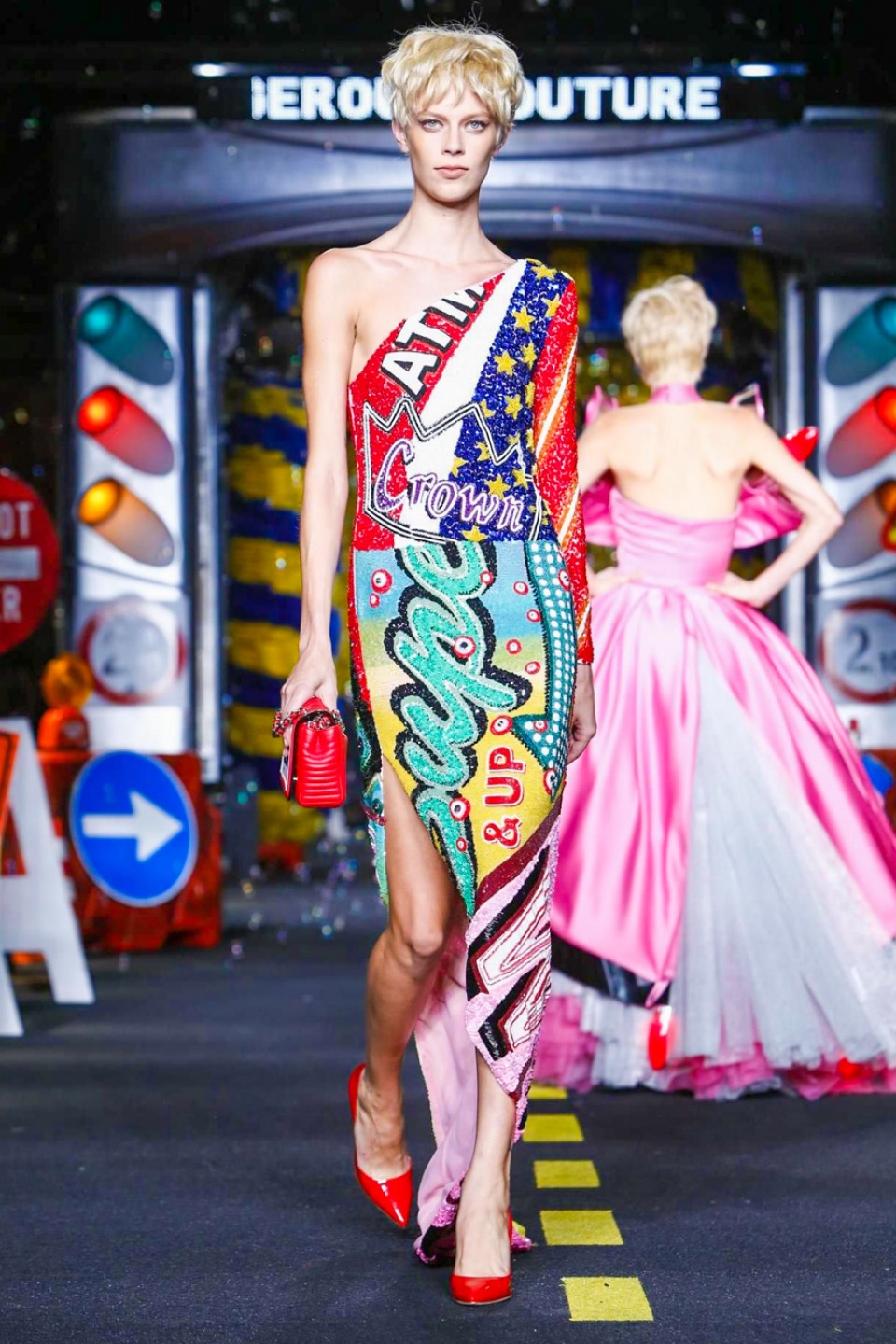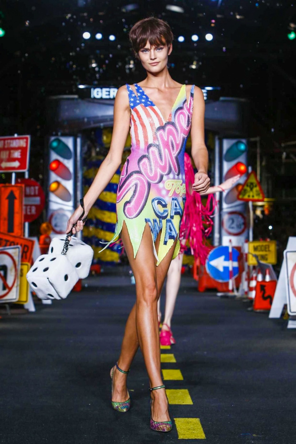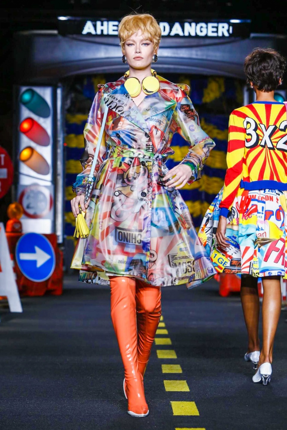 One is sure, Jeremy Scott has a lot of fun at Moschino. Season by season, the ideas get zanier, but the productions keep getting bigger. The Spring/Summer 2015 theme of Moschino by Jeremy Scott is a “ Car-Wash“ Couture. Traffic cones, barricades, and a genuine car wash that sprayed bubbles instead of water were installed on the runway. “No Parking, Couture Zone,” one sign read; another: “Dangerous Couture Ahead.”