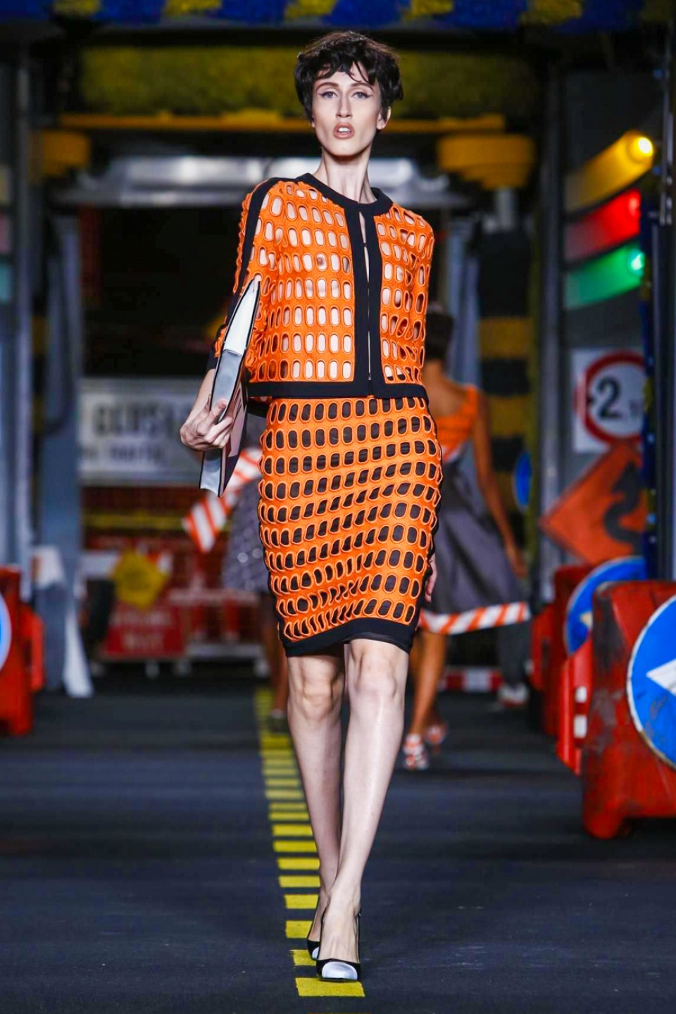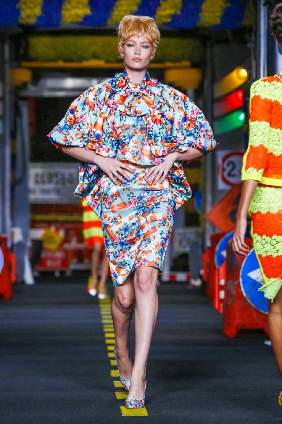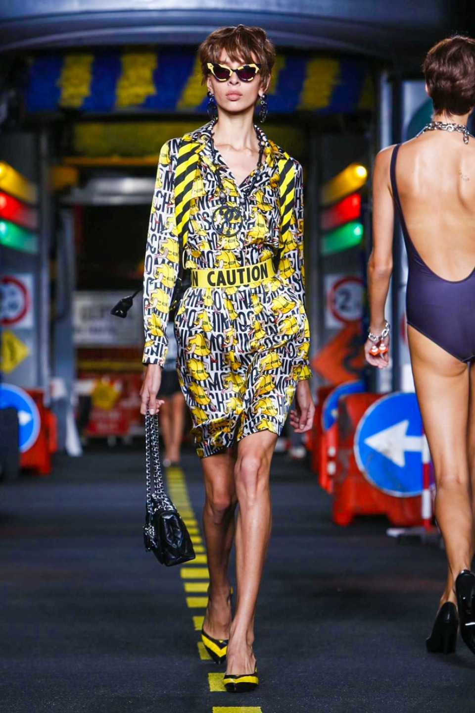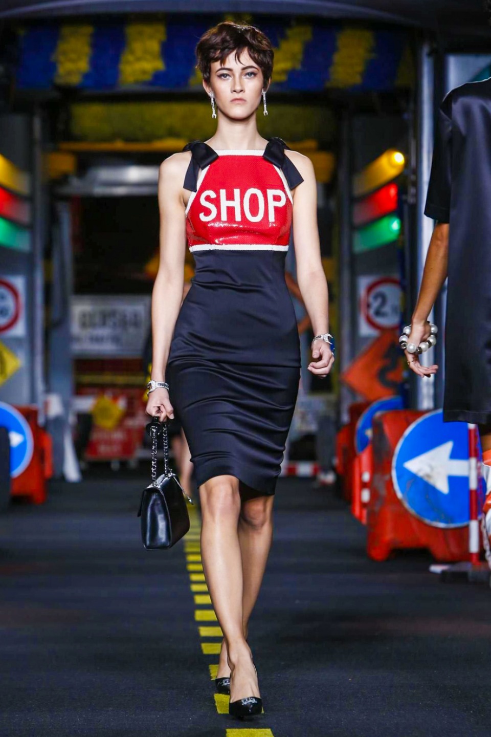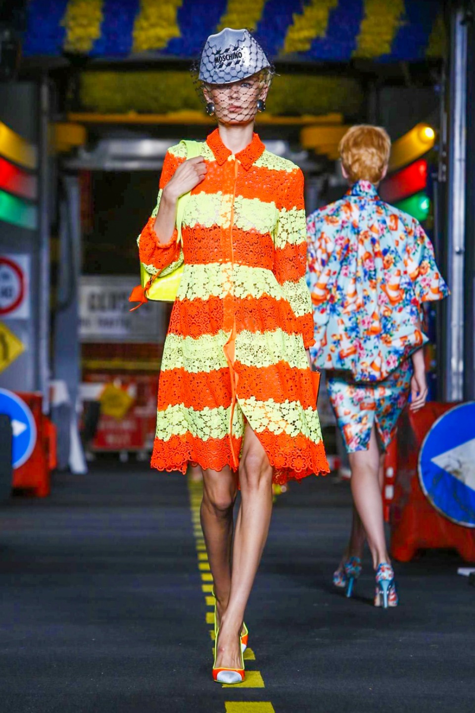 One is sure, Jeremy Scott has a lot of fun at Moschino. Season by season, the ideas get zanier, but the productions keep getting bigger. The Spring/Summer 2015 theme of Moschino by Jeremy Scott is a “ Car-Wash“ Couture. Traffic cones, barricades, and a genuine car wash that sprayed bubbles instead of water were installed on the runway. “No Parking, Couture Zone,” one sign read; another: “Dangerous Couture Ahead.”