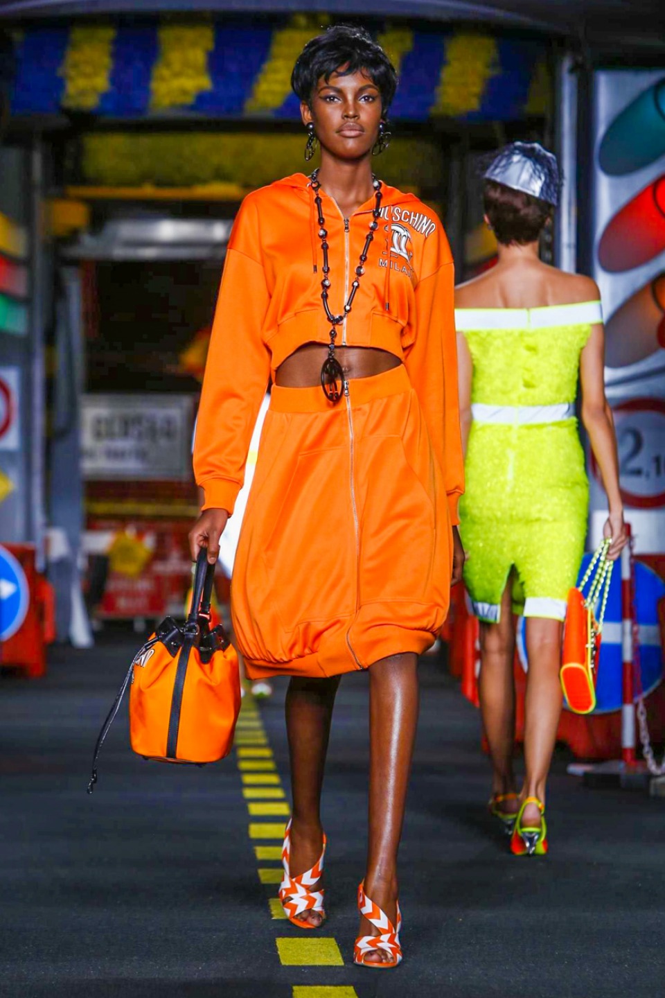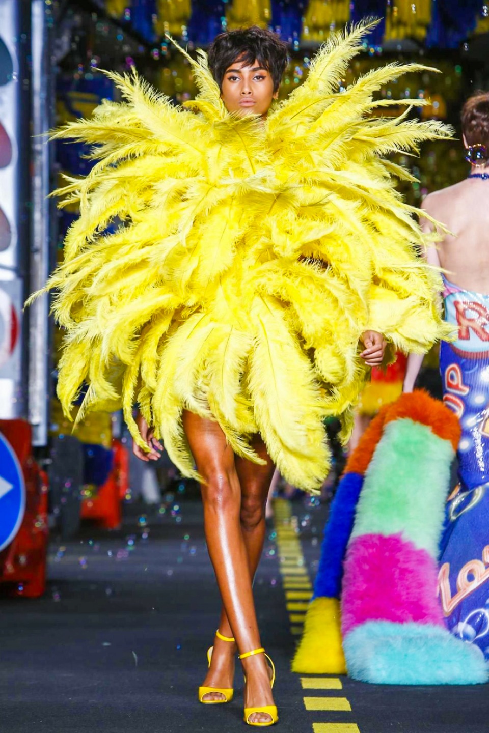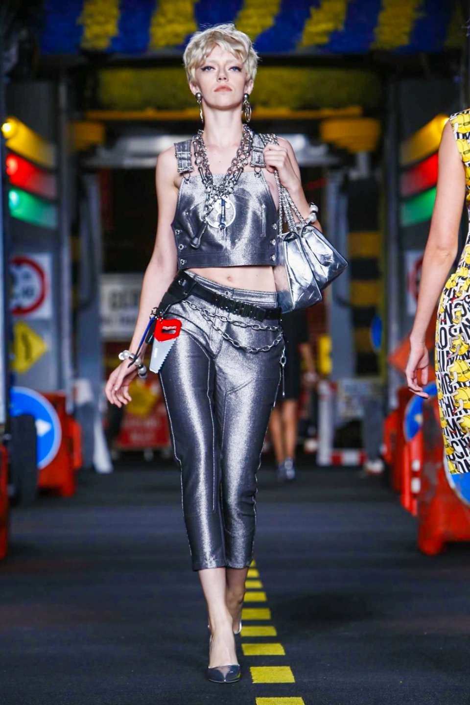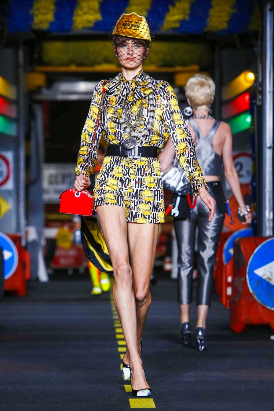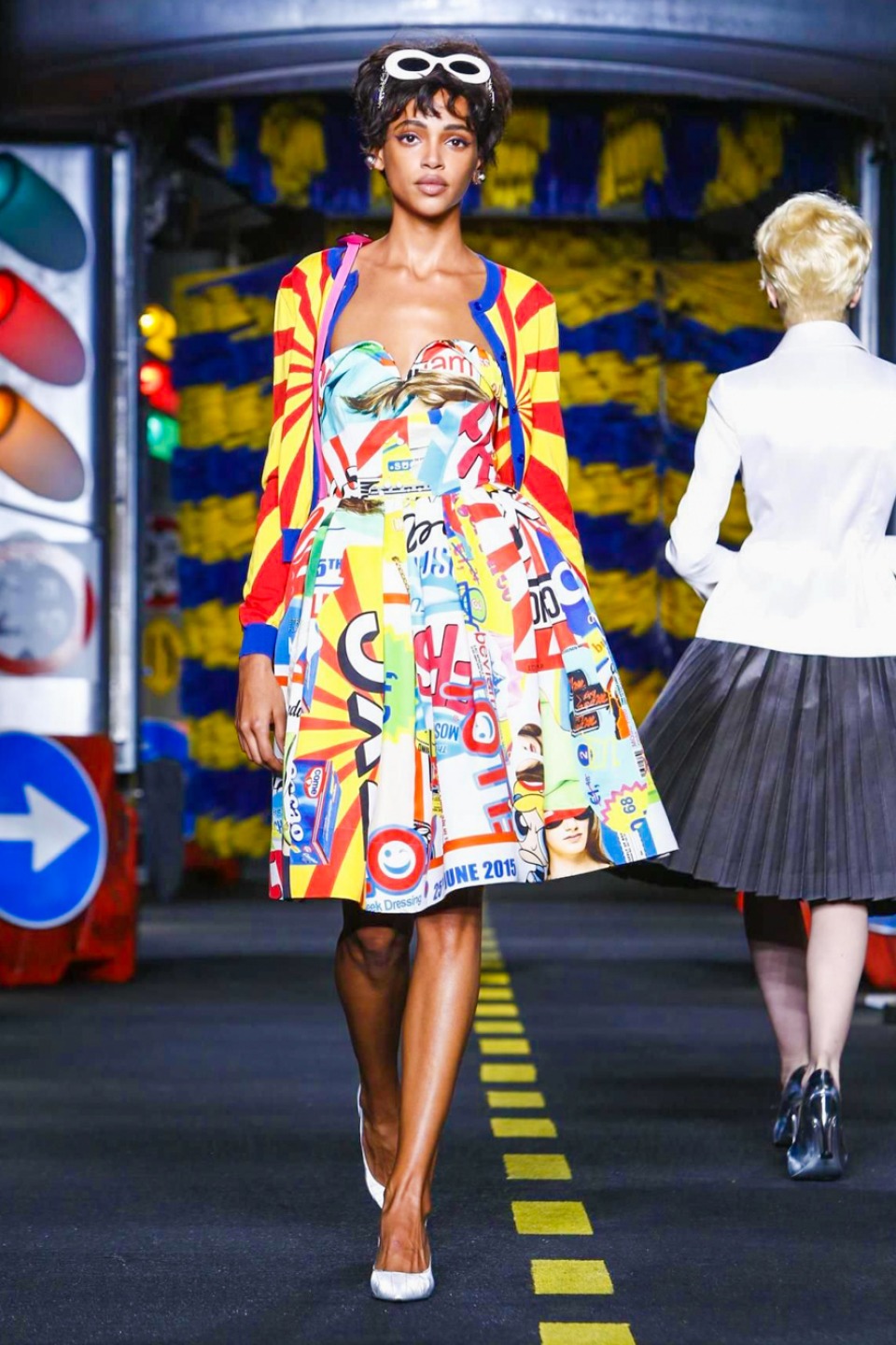 One is sure, Jeremy Scott has a lot of fun at Moschino. Season by season, the ideas get zanier, but the productions keep getting bigger. The Spring/Summer 2015 theme of Moschino by Jeremy Scott is a “ Car-Wash“ Couture. Traffic cones, barricades, and a genuine car wash that sprayed bubbles instead of water were installed on the runway. “No Parking, Couture Zone,” one sign read; another: “Dangerous Couture Ahead.”