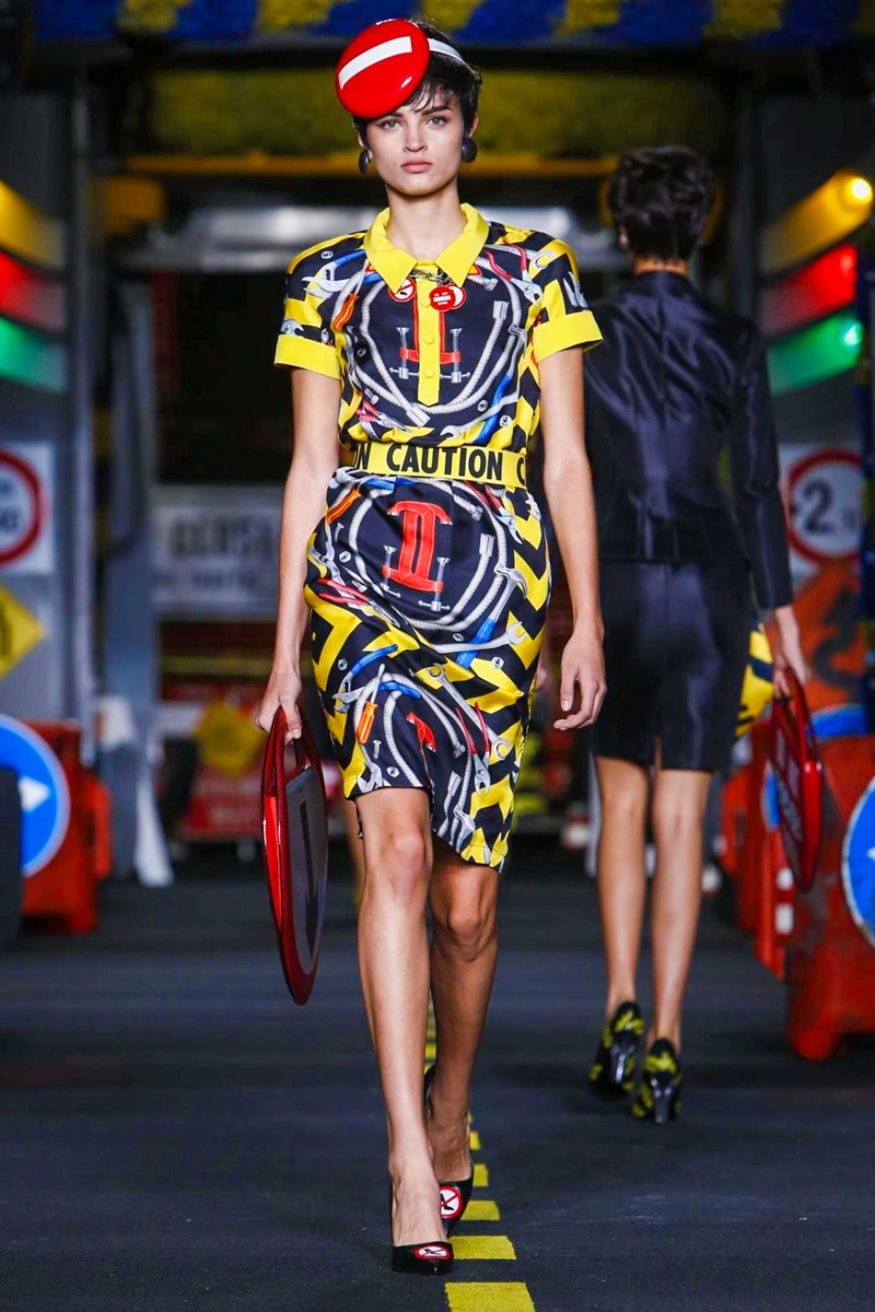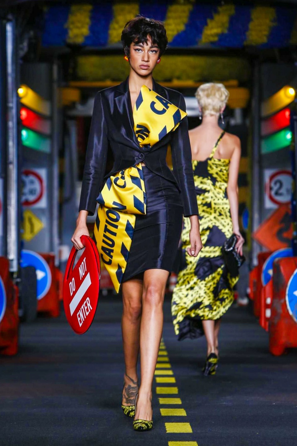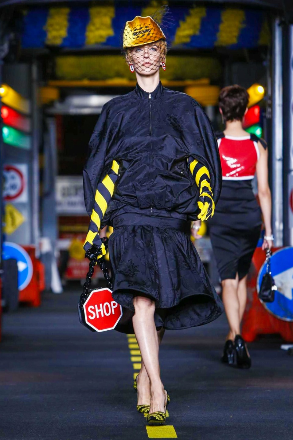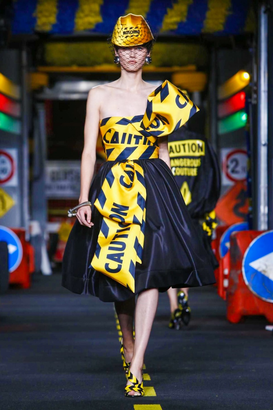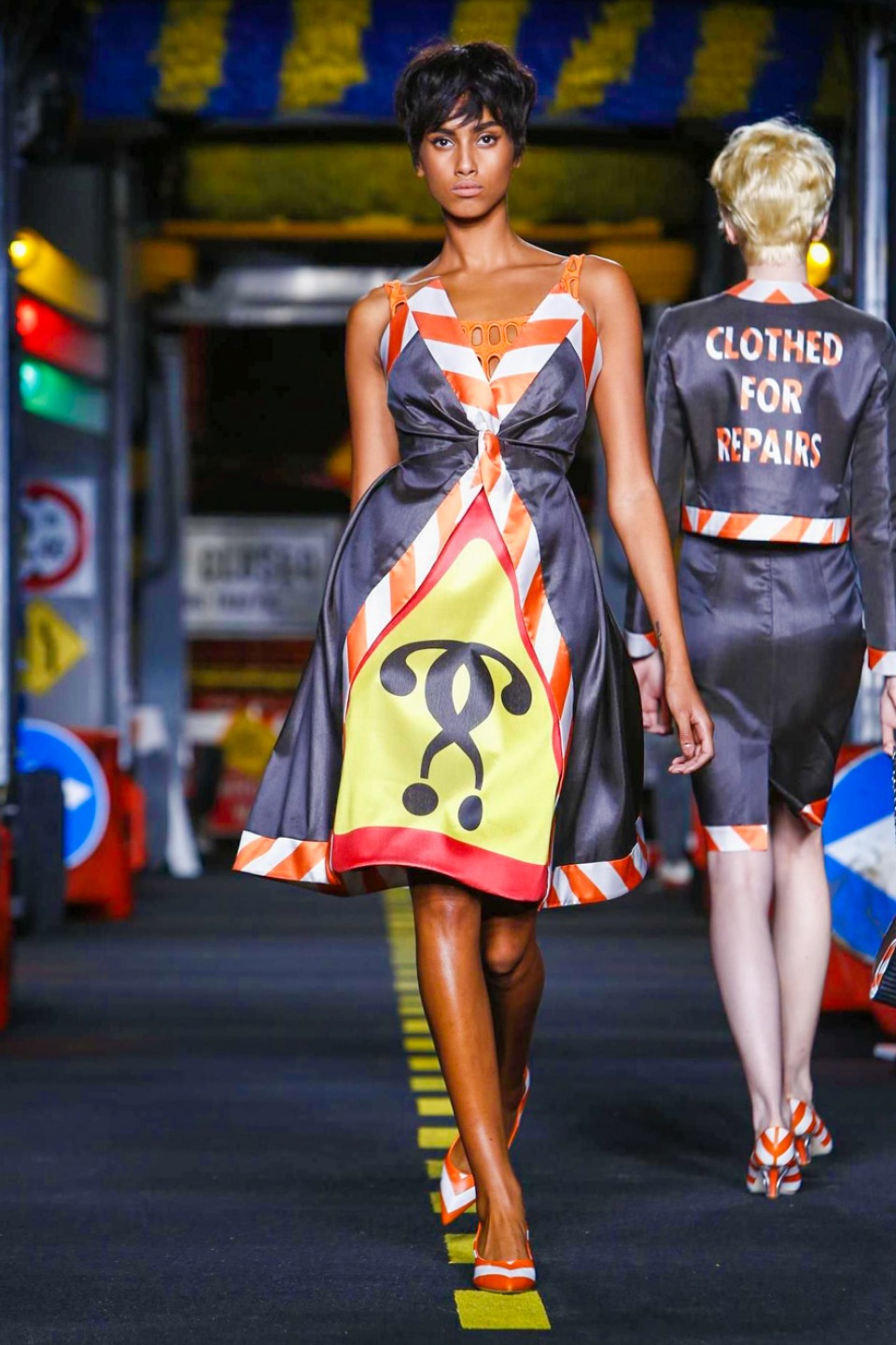 The models appeared wearing skirt suits crafted from dayglo safety vest material topped off with reflective trim.The full-skirted trench coat with a warning sign on the back as “Open Trench” , silk dresses printed in the black and yellow barricade tape stripes or adorned in street sign motifs with clever plays on traditional warning messages like “Caution Couture Ahead,” black Dress with iconic red octagon on the chest printed “Shop,” instead *Stop* , jackets silk Dresses and ball gowns with awesome stripse such “Clothed For Repairs.”