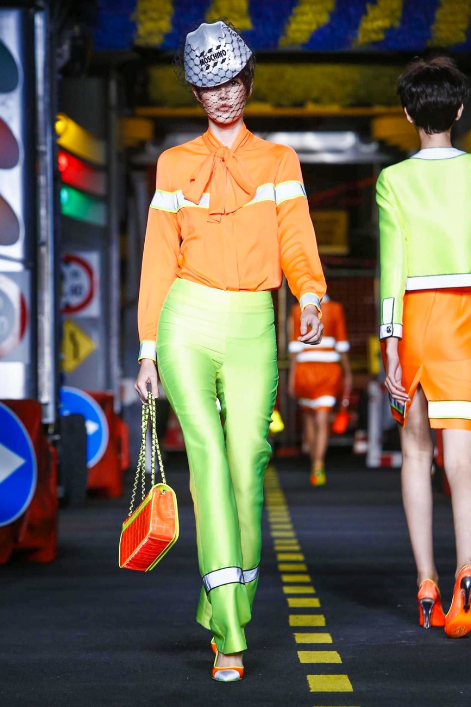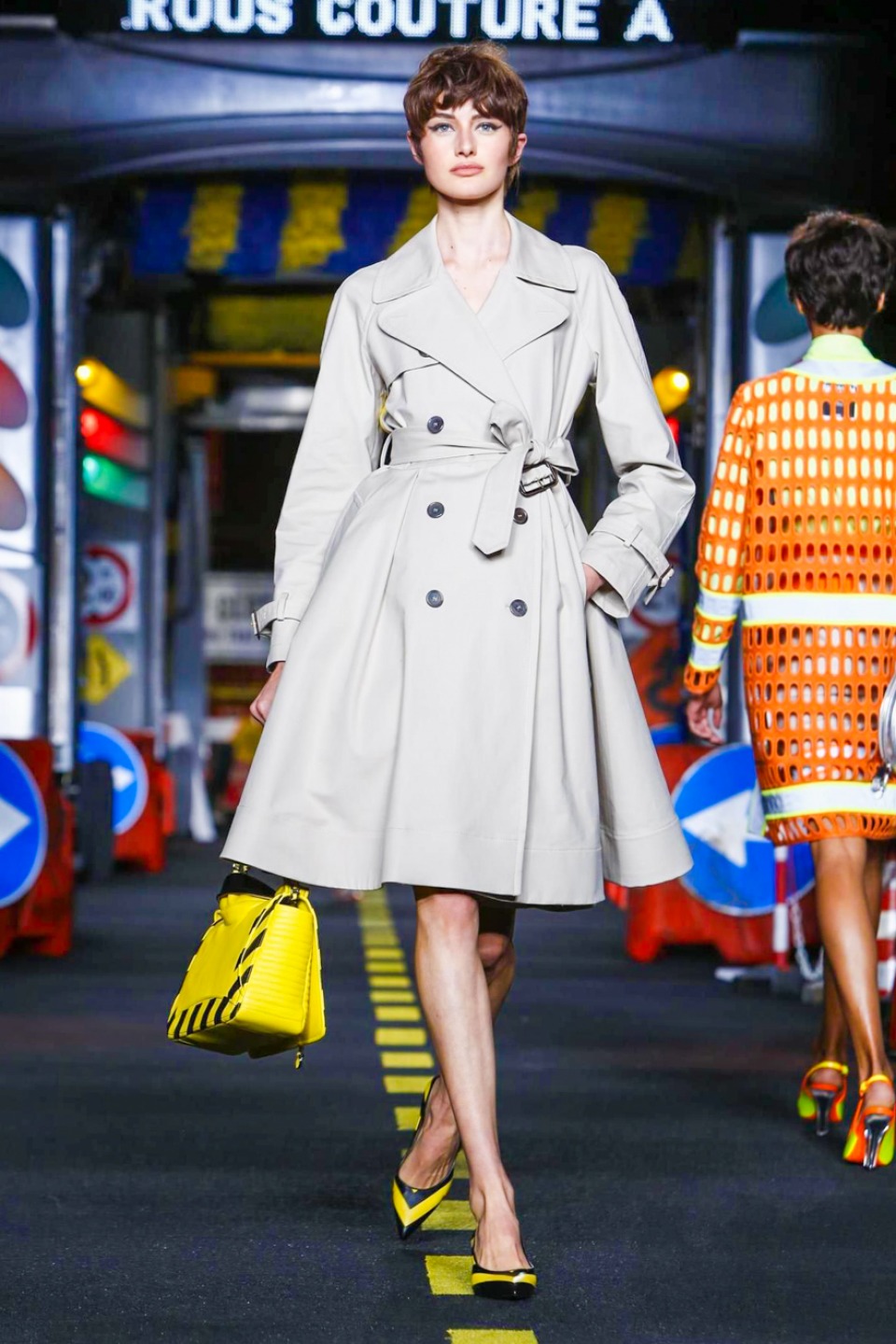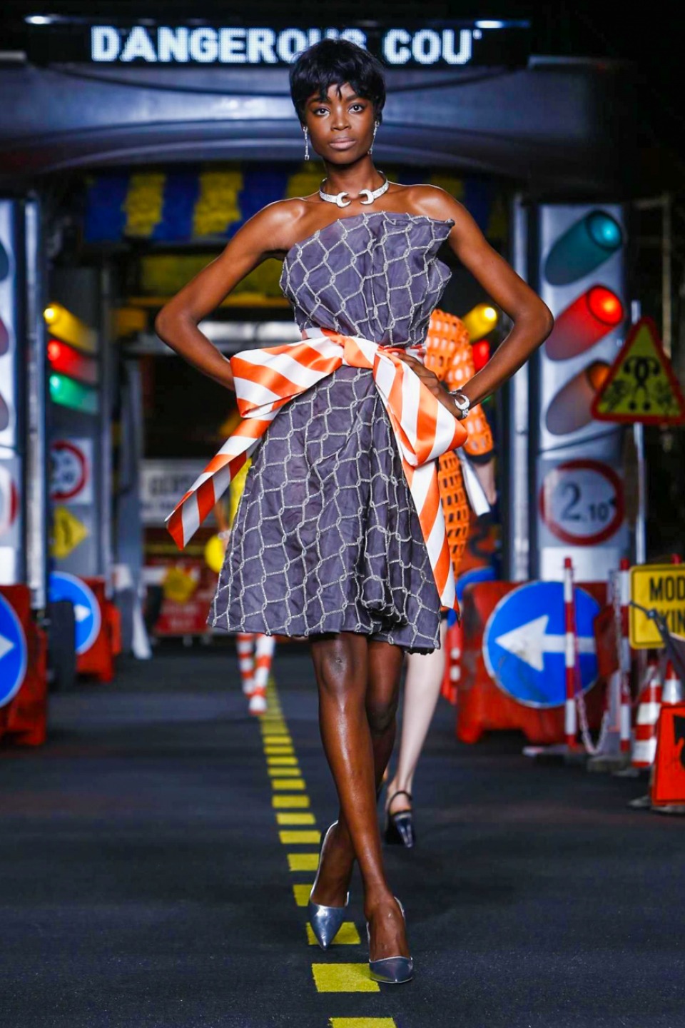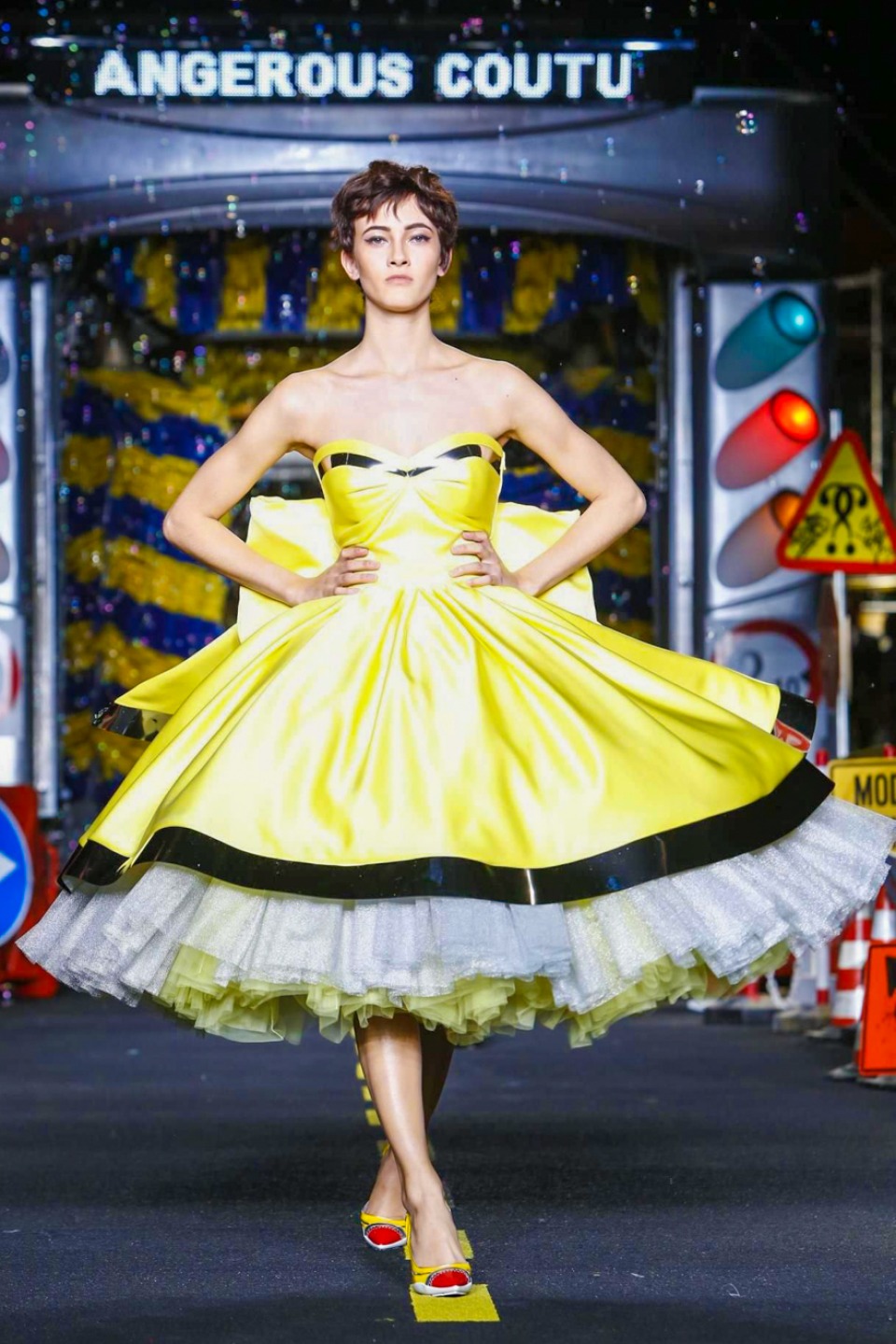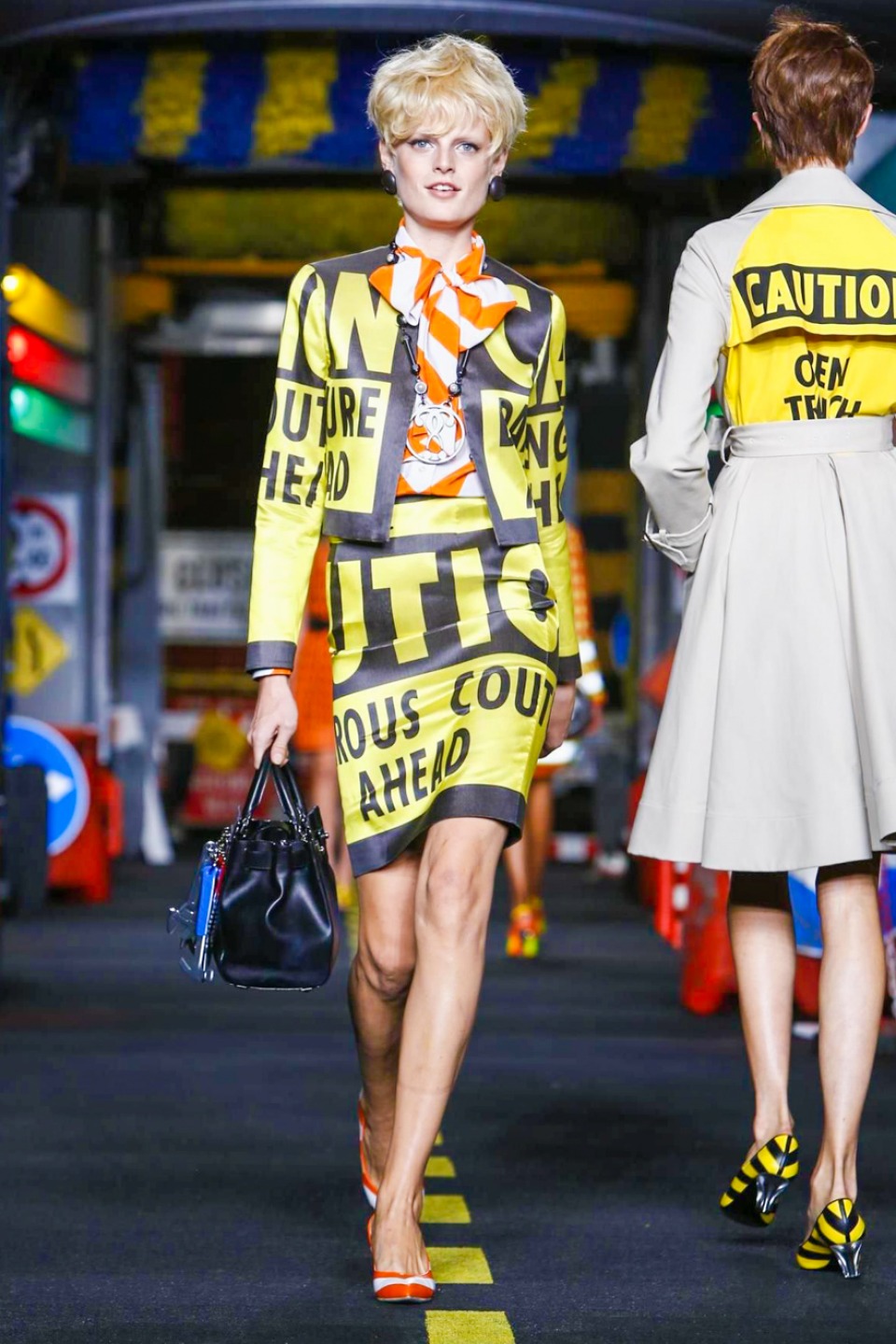The models appeared wearing skirt suits crafted from dayglo safety vest material topped off with reflective trim.The full-skirted trench coat with a warning sign on the back as “Open Trench” , silk dresses printed in the black and yellow barricade tape stripes or adorned in street sign motifs with clever plays on traditional warning messages like “Caution Couture Ahead,” black Dress with iconic red octagon on the chest printed “Shop,” instead *Stop* , jackets silk Dresses and ball gowns with awesome stripse such “Clothed For Repairs.”