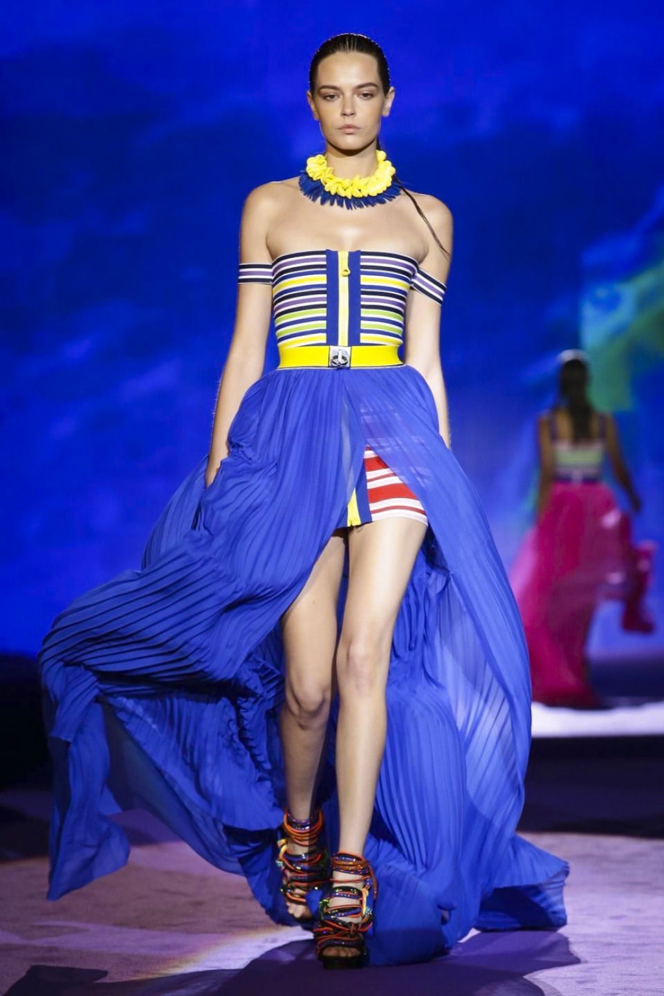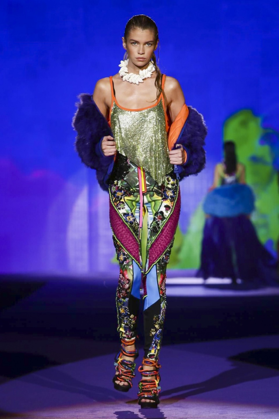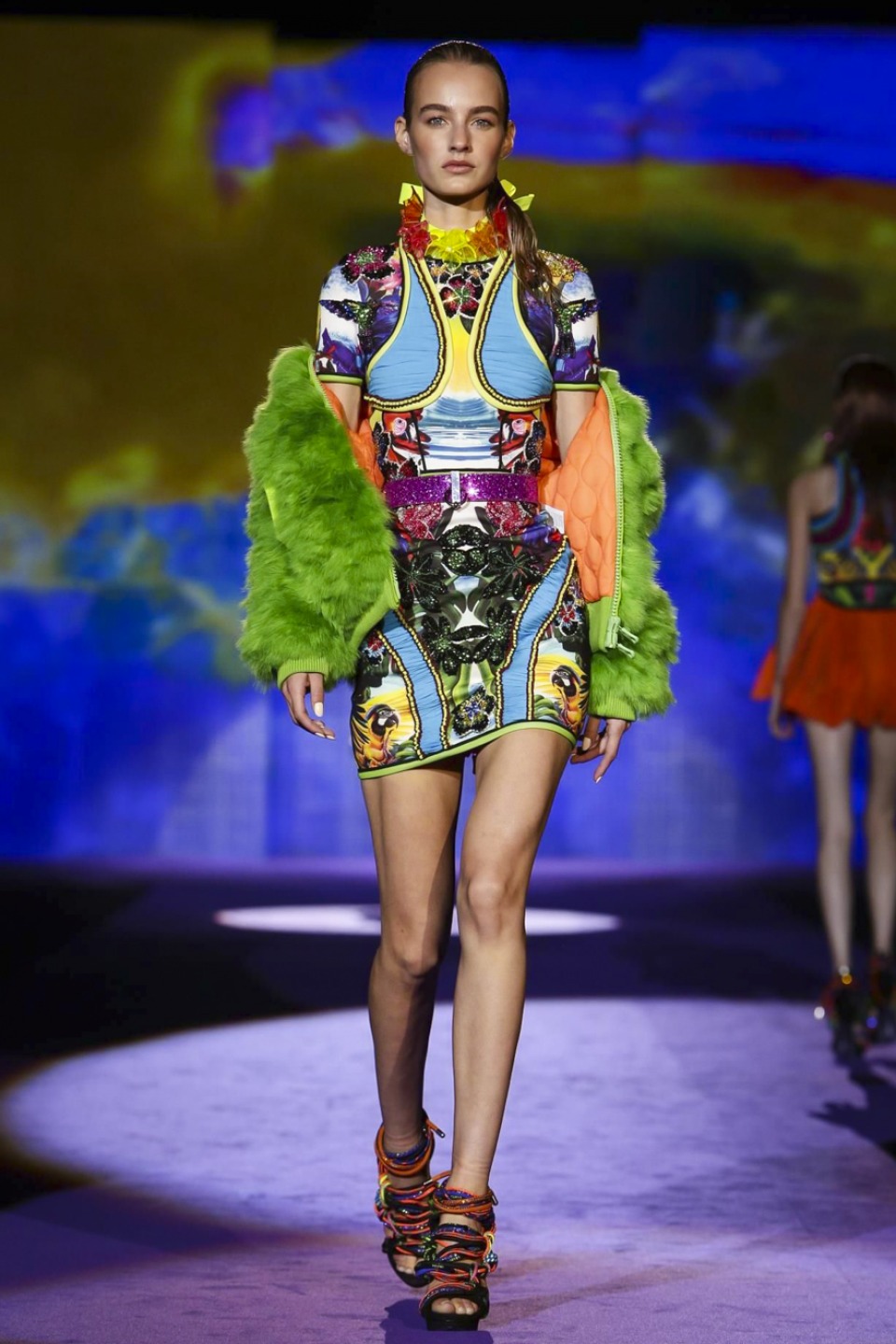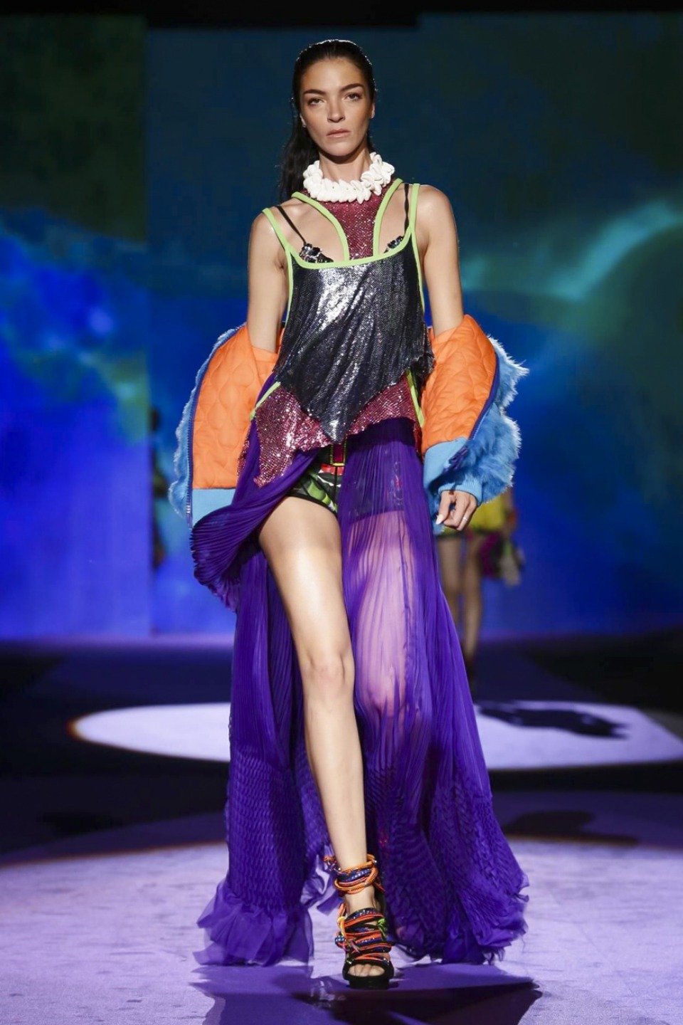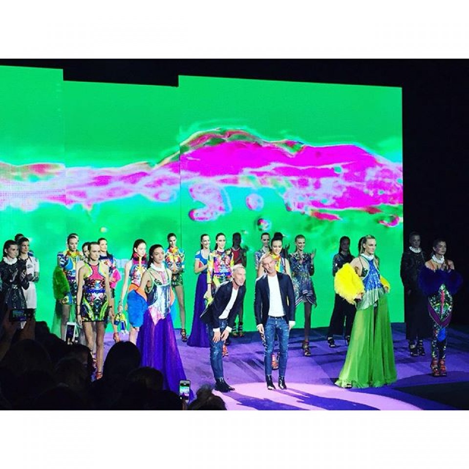 Dean and Dan Caten’s new collection for women picked up where their spring/summer 2016 menswear show their left off- at the beach. DJ played Chicks on Speed’s „Super Surfer Girl“ .Waves splashed on the backdrop of the otherwise stark set and out strutted Mariacarla Boscono in a cutout maillot and hip-slung boy pants, a tangle of colorful climbing ropes harnessing her torso. This hasn’t been a big week for bathing suits, but the Catens gave us several different varieties, from sporty one-pieces to slinky little bikinis strung up with crystals. Sexy has more or less gone out of fashion in Milan, but not DSquared2. Aside from those boyish trousers and a couple of pairs of high-waisted, tie-dyed jeans, the look here was seriously leggy. Pleated chiffon maxi skirts split open in the front, and otherwise it was all minis. Leather bandage dresses. Knit tube dresses worn two at a time. And, best of all, clingy scuba Dresses in tropical prints with bold swipes of color and three-dimensional embroideries. I wished me to see more denim, a few pairs of bold jeans which twins Caten are designed so good.Anyway,t his collection showcased the Catens’s strengths: sexy, athletic silhouettes; special denim; their insatiable eye for color. It also exposed a weakness: their too-strappy, overly high platform shoes.