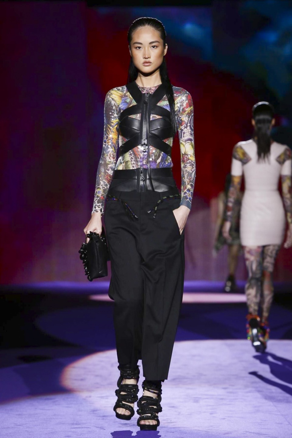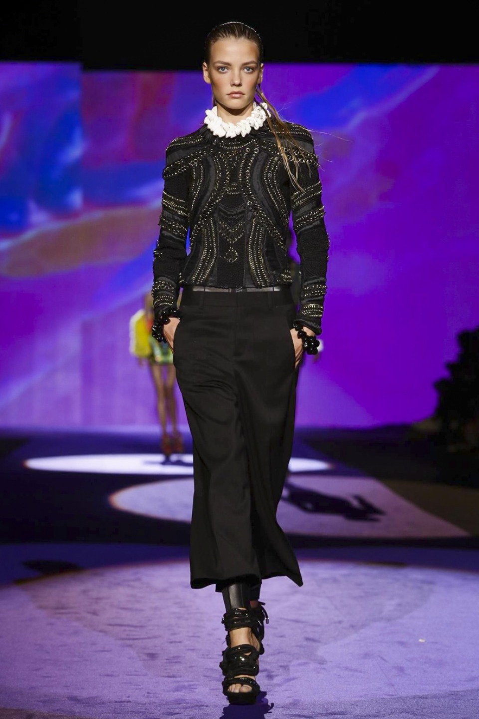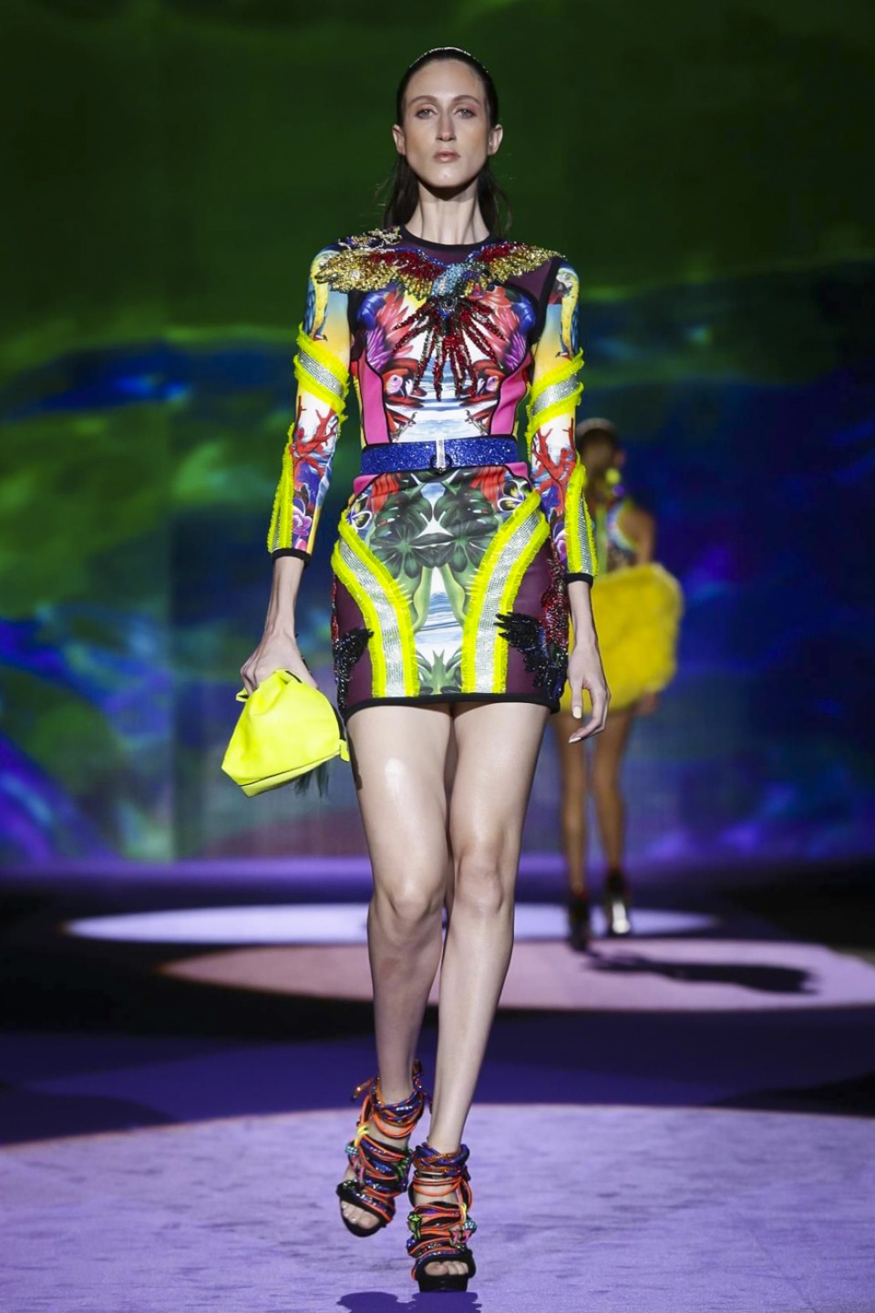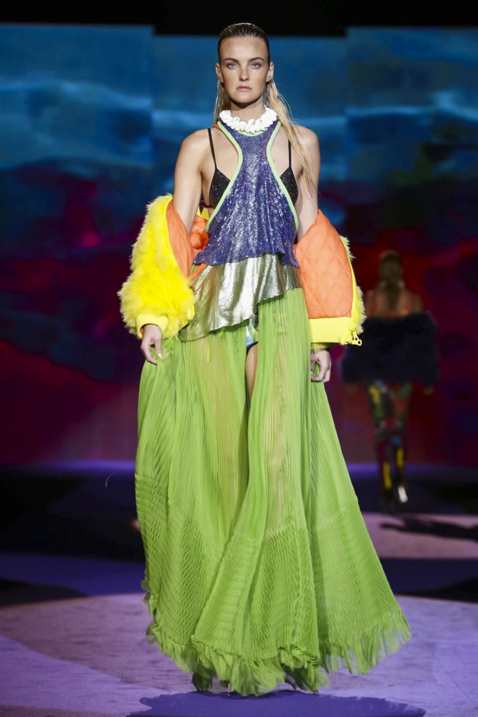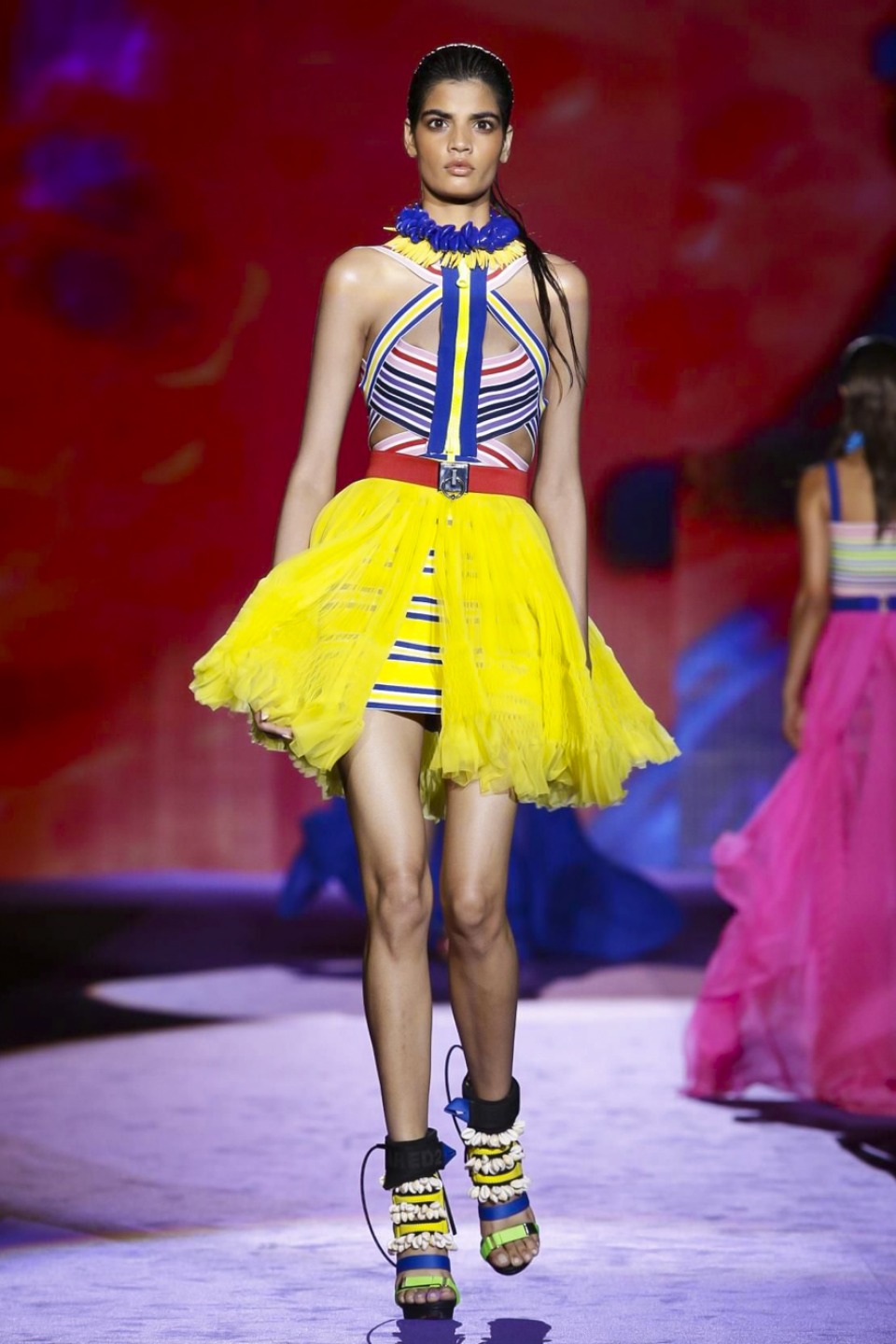 Dean and Dan Caten’s new collection for women picked up where their spring/summer 2016 menswear show their left off- at the beach. DJ played Chicks on Speed’s „Super Surfer Girl“ .Waves splashed on the backdrop of the otherwise stark set and out strutted Mariacarla Boscono in a cutout maillot and hip-slung boy pants, a tangle of colorful climbing ropes harnessing her torso. This hasn’t been a big week for bathing suits, but the Catens gave us several different varieties, from sporty one-pieces to slinky little bikinis strung up with crystals. Sexy has more or less gone out of fashion in Milan, but not DSquared2. Aside from those boyish trousers and a couple of pairs of high-waisted, tie-dyed jeans, the look here was seriously leggy. Pleated chiffon maxi skirts split open in the front, and otherwise it was all minis. Leather bandage dresses. Knit tube dresses worn two at a time. And, best of all, clingy scuba Dresses in tropical prints with bold swipes of color and three-dimensional embroideries. I wished me to see more denim, a few pairs of bold jeans which twins Caten are designed so good.Anyway,t his collection showcased the Catens’s strengths: sexy, athletic silhouettes; special denim; their insatiable eye for color. It also exposed a weakness: their too-strappy, overly high platform shoes.