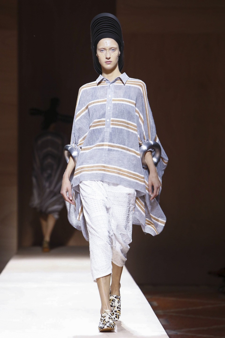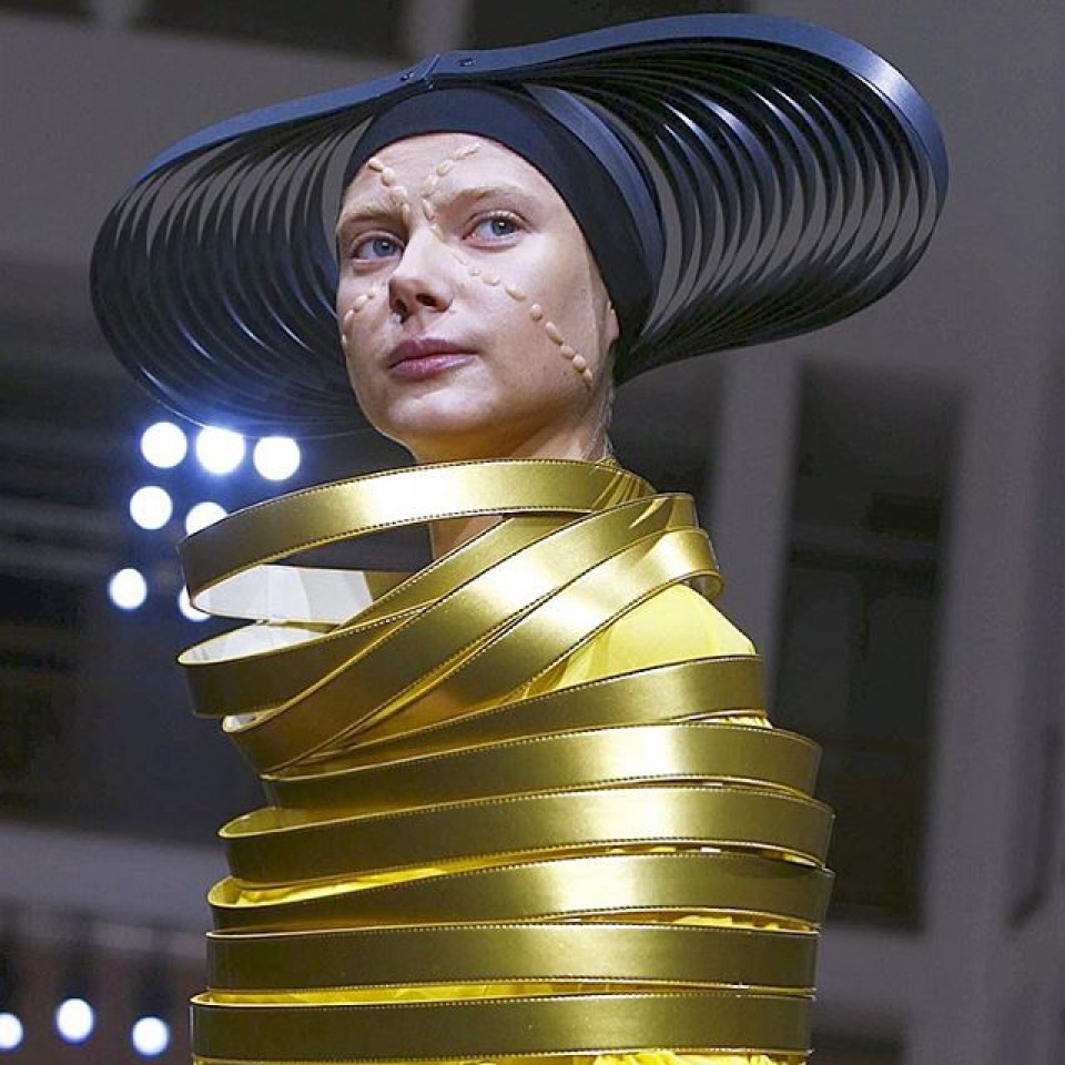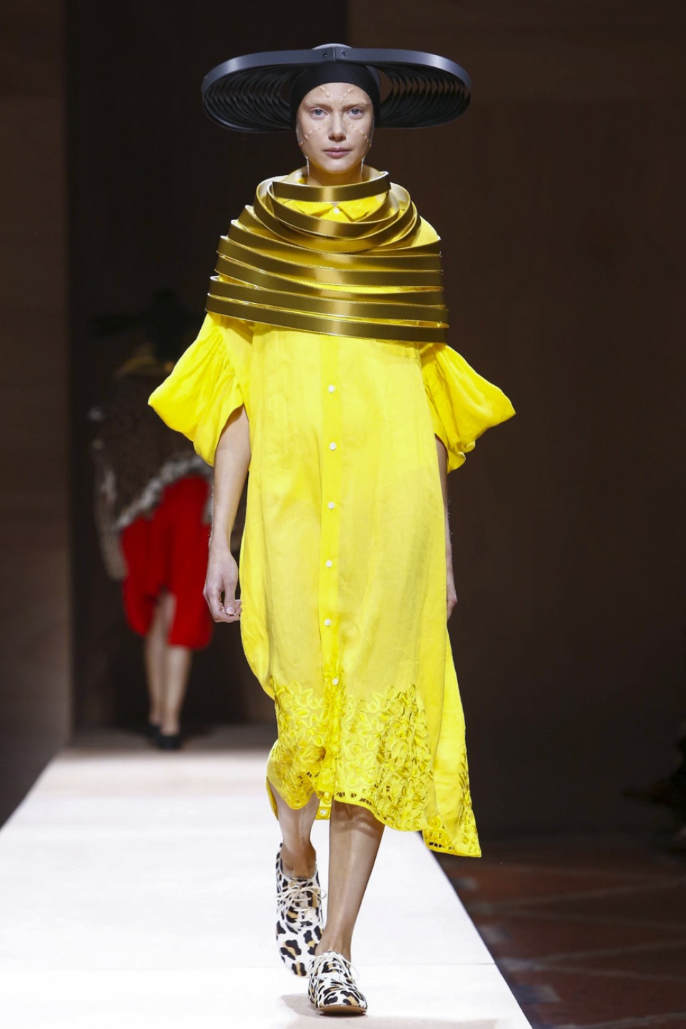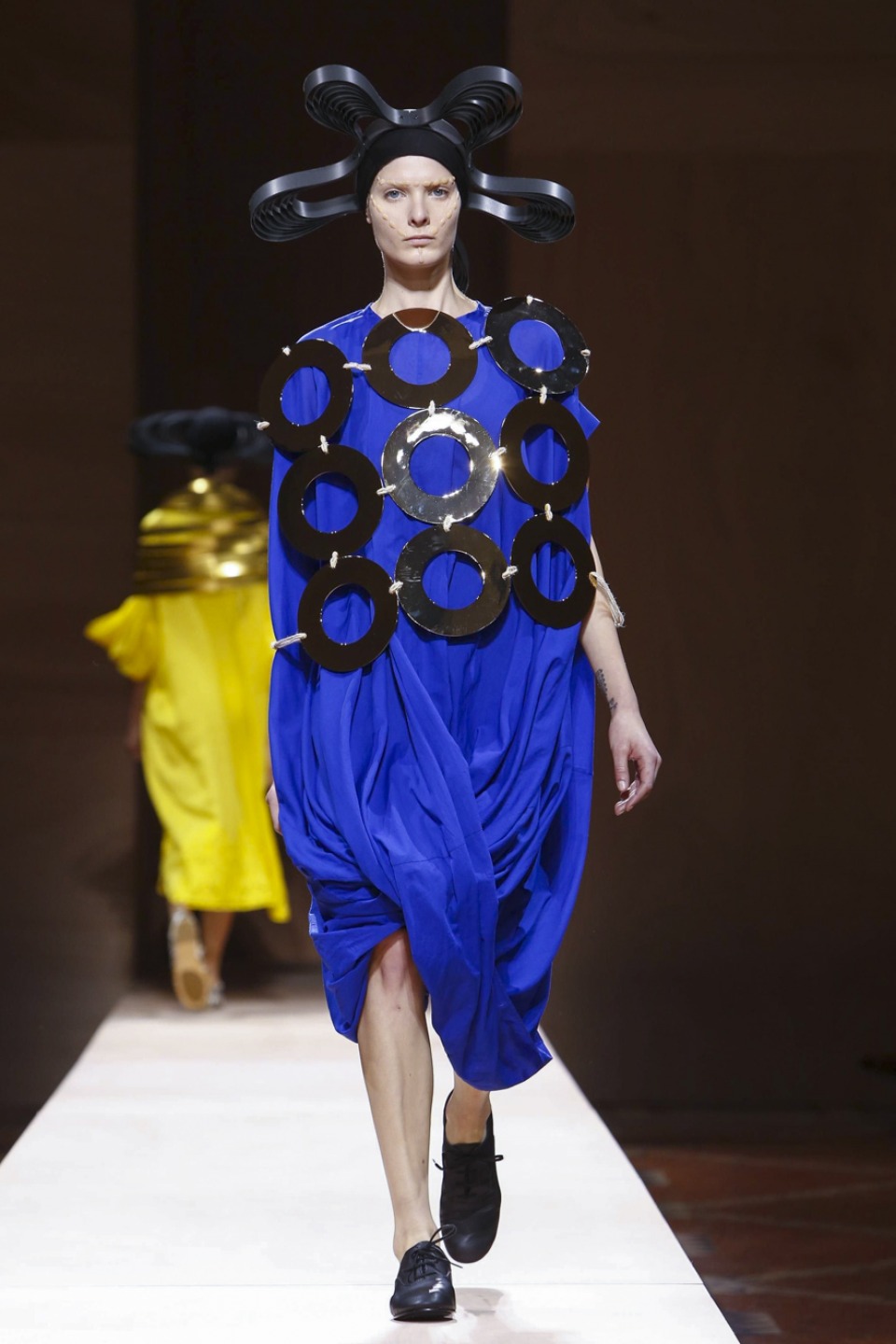 Vivienne Westwood has made a habit of using her fashion shows as a platform for activism. This season, she was championing two related causes. On the runway she paid homage to Venice, a city that, perhaps due to climate change, is sinking even faster than it was before. Venice is a good theme for Westwood—her shows tend to have a certain carnival atmosphere in their mix of the decadent and the louche. You’d have expected a Vivienne Westwood Save Venice! collection to feature quite a few of her signature evening dresses, with their bouffant skirts and baroque swirls of sculptural draping but instead of cocktail looks, she emphasized rather plainspoken daywear silhouettes, shown on male as well as female models, in a gesture that read less political than as an homage to the Venetian tradition of the masque. The cross-dressing theme was echoed as well in the array of tailored items, in particular suits that looked oversize and mannish, with trousers cut to appear as though they’d been cinched up spontaneously to fit a woman’s smaller frame. That was one of Westwood’s dramatic flourishes; others included poufed sleeves and hardware and crystal embellishment sewn onto jackets. Westwood made a few very spectacular pieces, such as the extra-long coats worn high overhead and a bodysuit of sequin-dripping net that conjured a very fancy birdcage. Of course those looks had quite an impact on the runway.