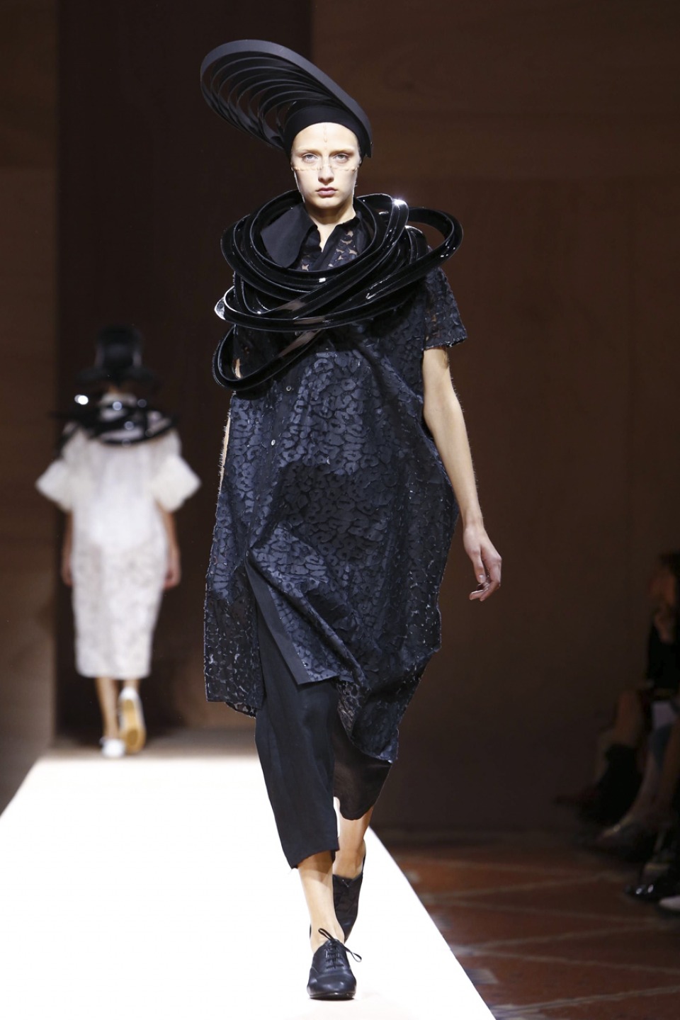 Great designers’ greatness is stamped on our memory by the signature codes they leave behind them. Hence, when other designers succeed the house’s founder, they face a challenge: a delicate wrestle between the codes they have signed up to inherit and the urge to express their own point of view. Their own codes and Puglisi has his code,in fact Fausto Puglisi chose to focus on a set of sweetly provocative floral macramé looks, all froth and of-that-era liberation touched with a softened space Age futurism.Impressively, Puglisi re-established a connection with the Swiss factory that made Ungaro’s ’60s pieces to create a wonderfully psychedelic lace macramé of ochre flowers and paisley petals used in his last capelet—teamed with matching thigh-highs and a long loose skirt. The netted-check that ran throughout the collection, even down to the weave of the pressed-foam ruffles that edged many of these Looks, A harder, more Puglisi-ish preoccupation—expressed itself in the ringlet bonding on black vinyl and hot pink skirts, and as suspension on floral-scattered bustiers. “A little bit bondage, maybe, but also in romantic attitude. This is not a collection for wallflowers or delicate petals—but for a woman in search of punchy, in-your-face prettiness, it will have allure.
