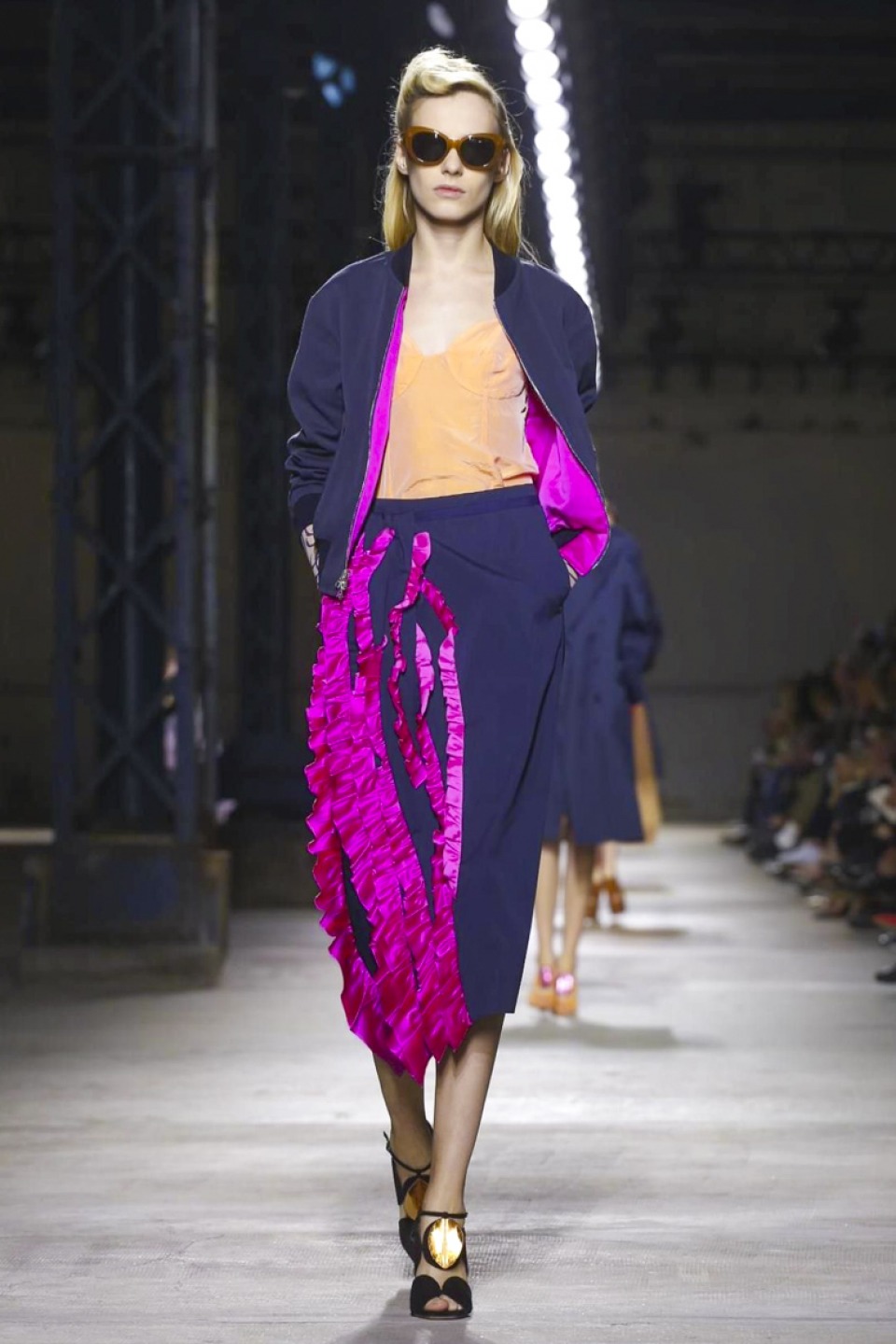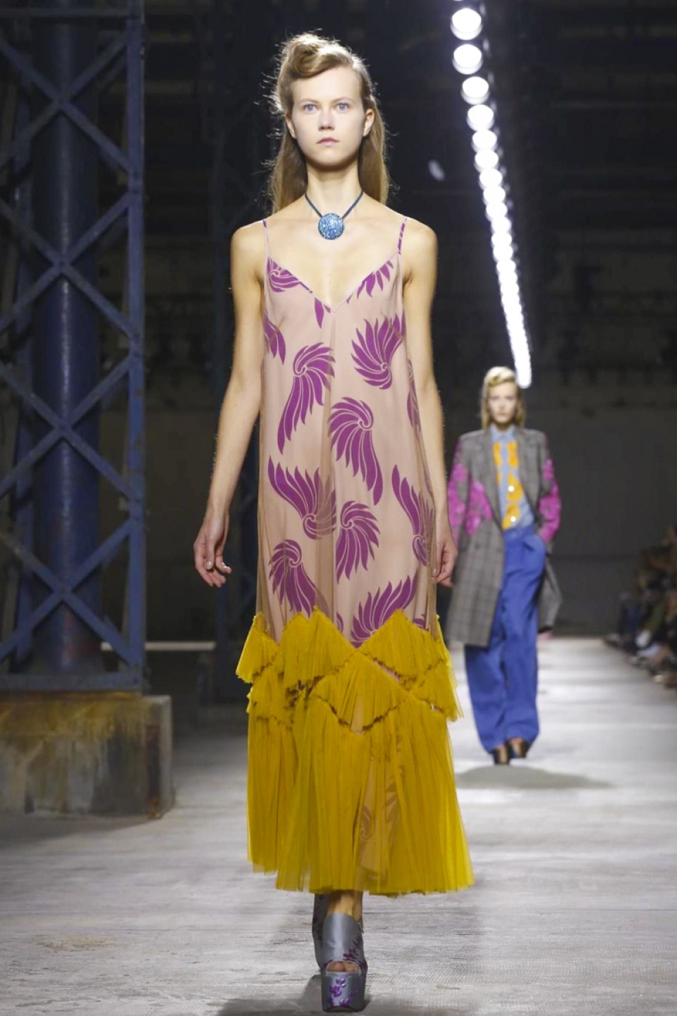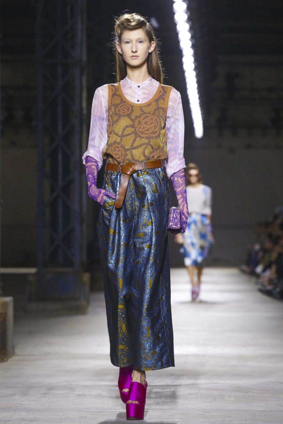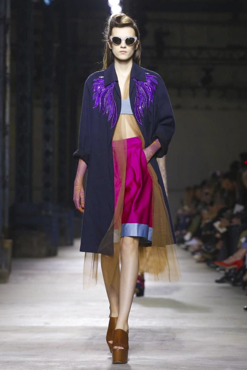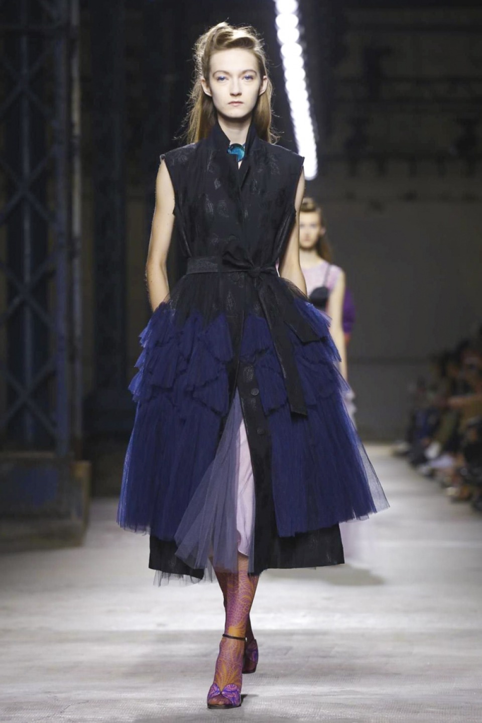 Clashing teal with mustard, purple with hot pink, orange with gold, and ,and and…, it was a positive riot of juxtapositions ,and that’s before the fabrics even come into it. Raised jacquards, satin ruffles, embellished tweed checks and lashings of pleated, tiered and frilled tulle – it was the grown-up equivalent of raiding the dressing-up box, although under Noten’s watchful eye, the result looks really good.