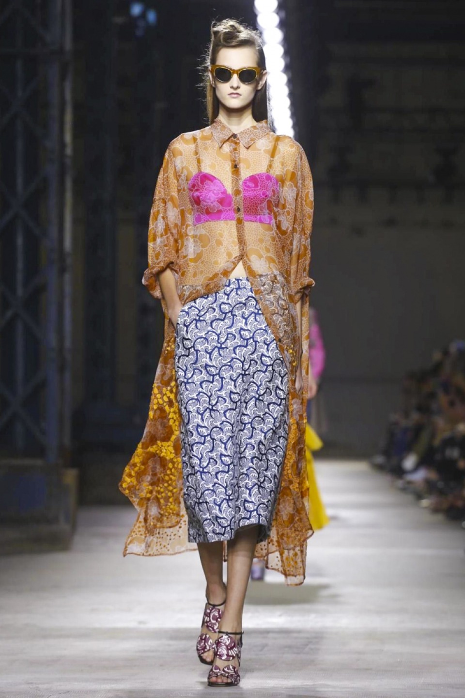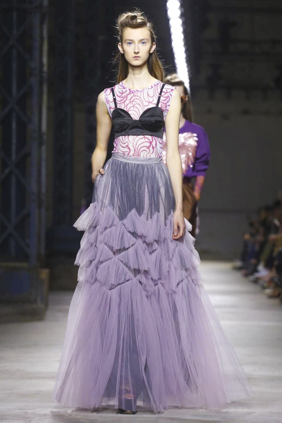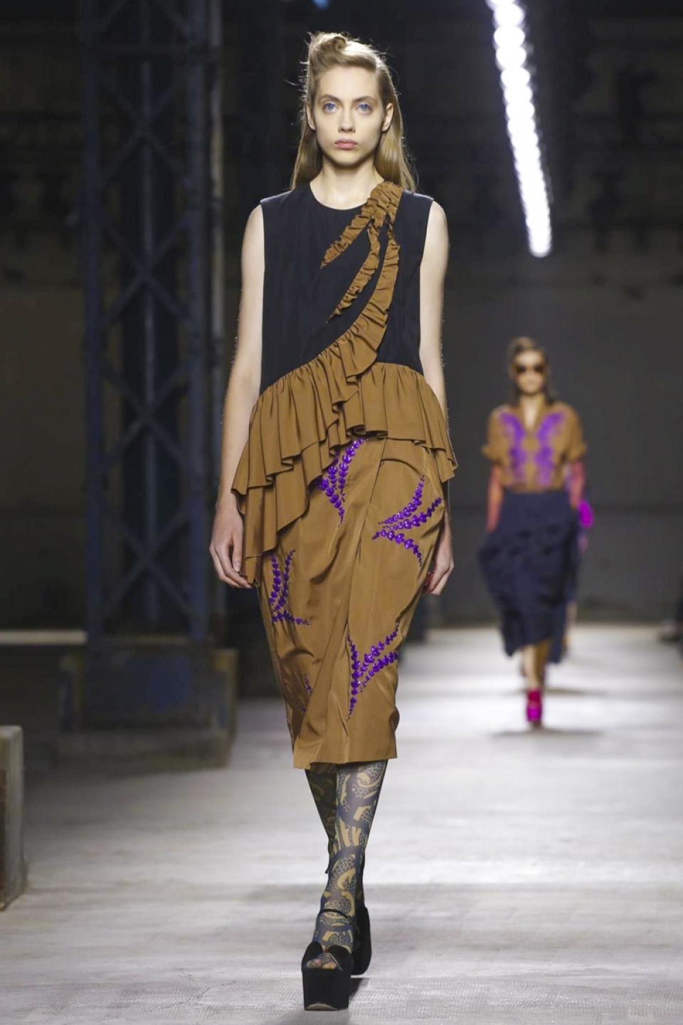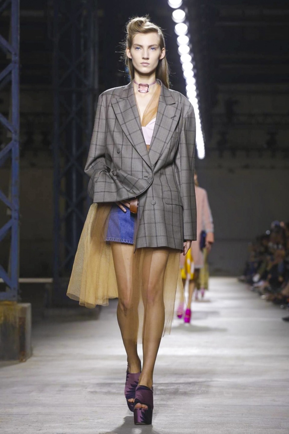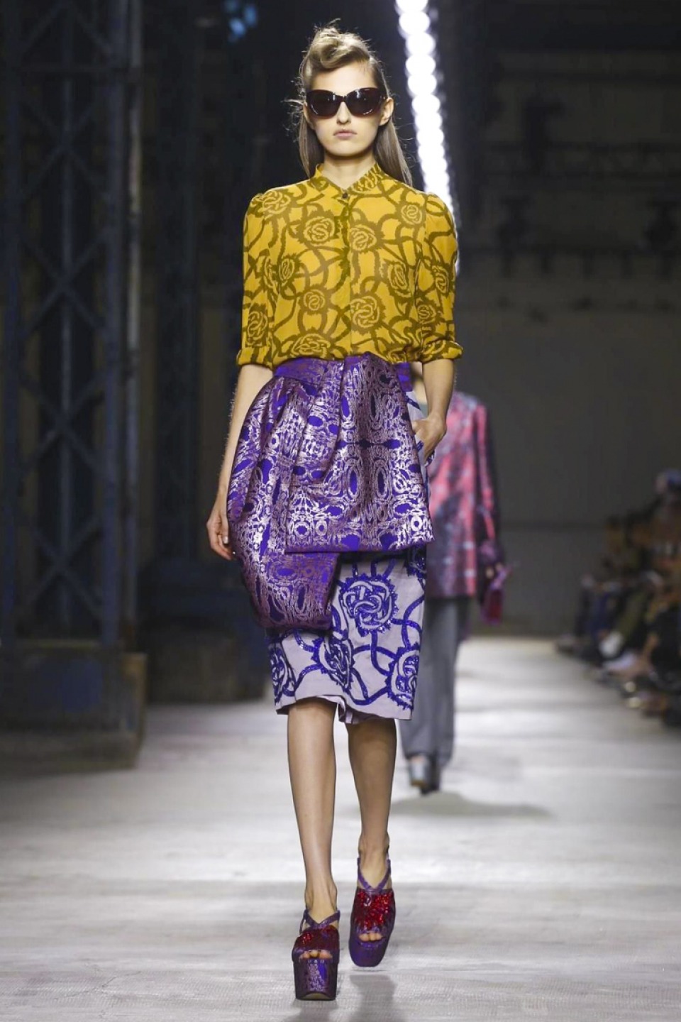 Clashing teal with mustard, purple with hot pink, orange with gold, and ,and and…, it was a positive riot of juxtapositions ,and that’s before the fabrics even come into it. Raised jacquards, satin ruffles, embellished tweed checks and lashings of pleated, tiered and frilled tulle – it was the grown-up equivalent of raiding the dressing-up box, although under Noten’s watchful eye, the result looks really good.