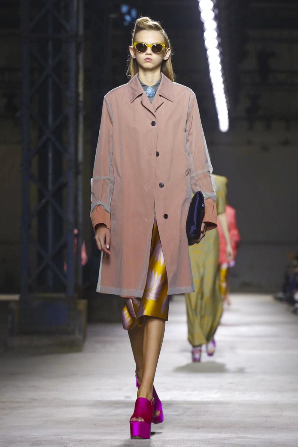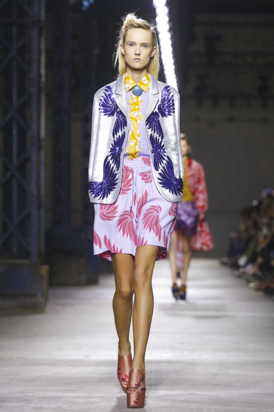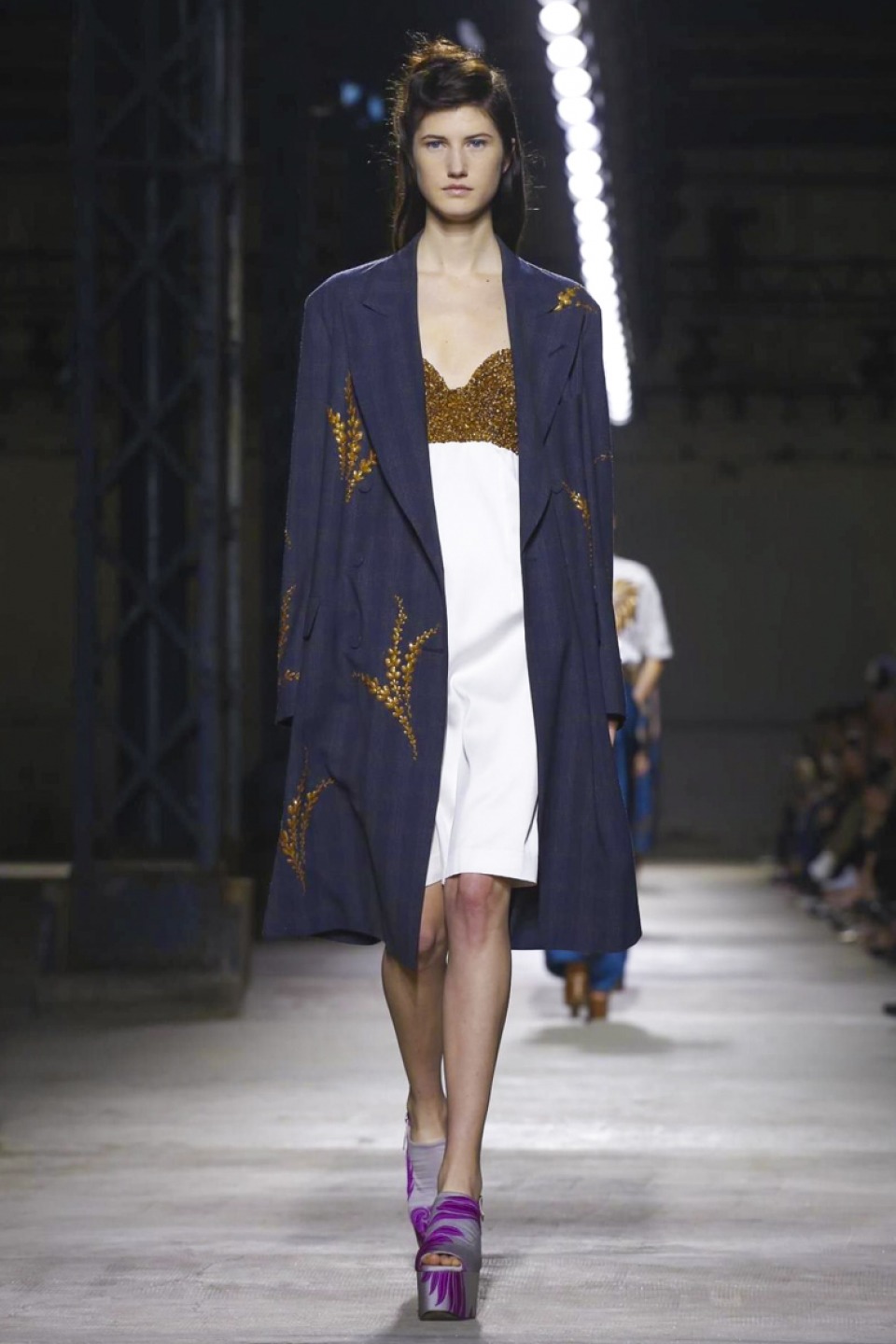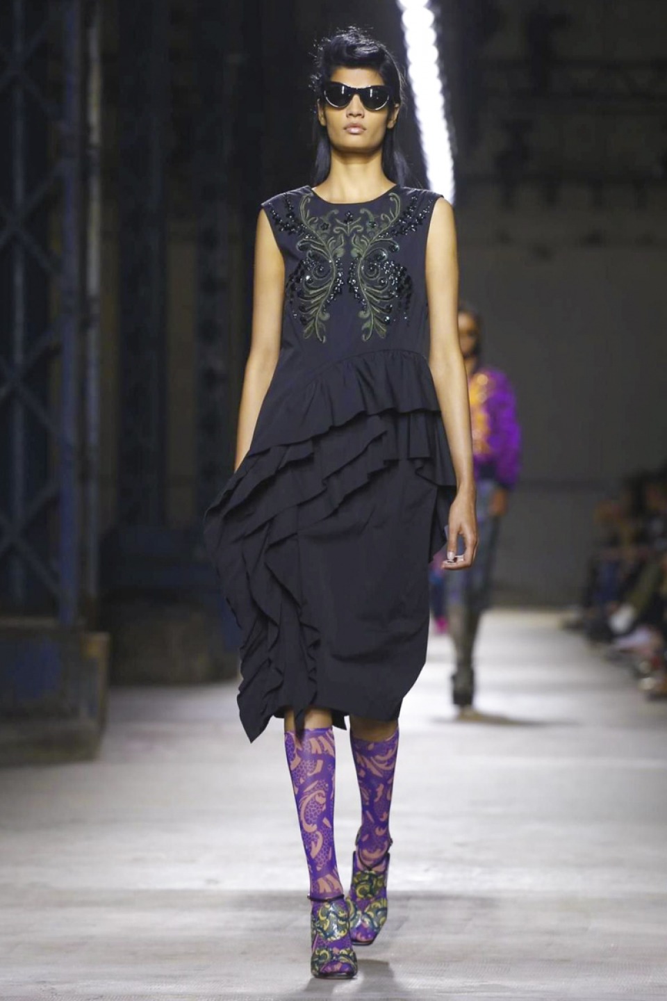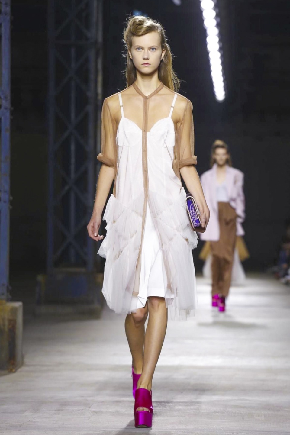 Clashing teal with mustard, purple with hot pink, orange with gold, and ,and and…, it was a positive riot of juxtapositions ,and that’s before the fabrics even come into it. Raised jacquards, satin ruffles, embellished tweed checks and lashings of pleated, tiered and frilled tulle – it was the grown-up equivalent of raiding the dressing-up box, although under Noten’s watchful eye, the result looks really good.