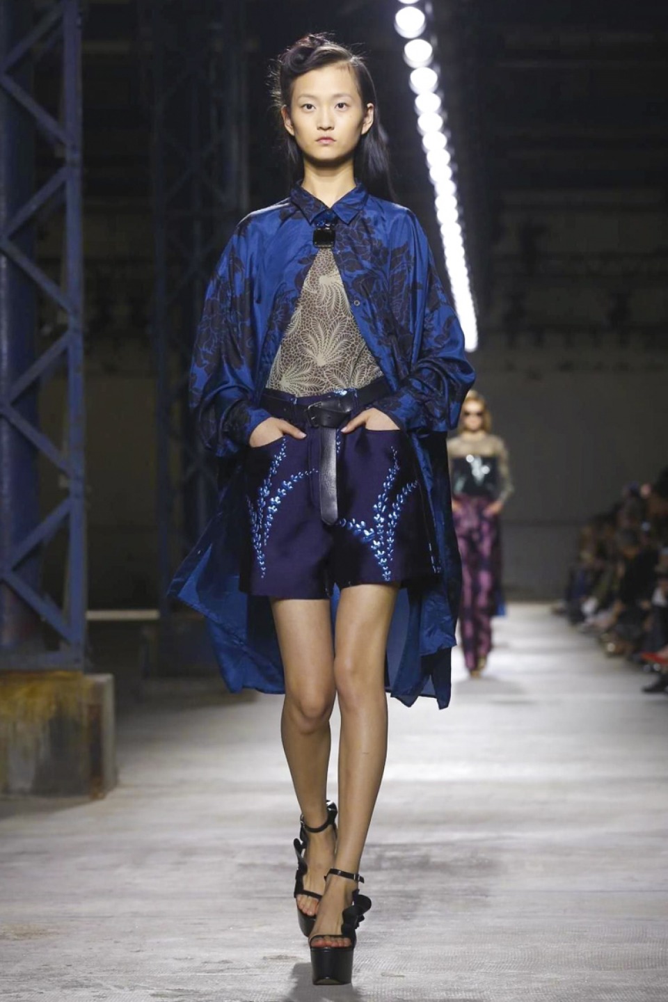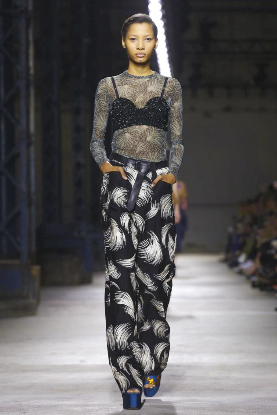 His upcoming collaboration with H&M made him comb his own Balmain archives, reminding him of the wealth of material that was “the result of four years of hard work,” he said. Four years is a long time in his industry and as a result he deemed it time to introduce new ideas for spring and to broaden the Balmain DNA. that most prominently manifested in tiered ruffles (flounce is shaping up to be a big story next season): they cascaded on trousers, along sleeves, and bib-fronts adding a romantic femininity to the fierce sex appeal of the whip-stitching, fishnets and strong shoulders also out in force. This new found softness also rippled through via a pretty pastel palette – the nude tones, like the new silhouettes, all served to temper Balmain’s customary opulence.