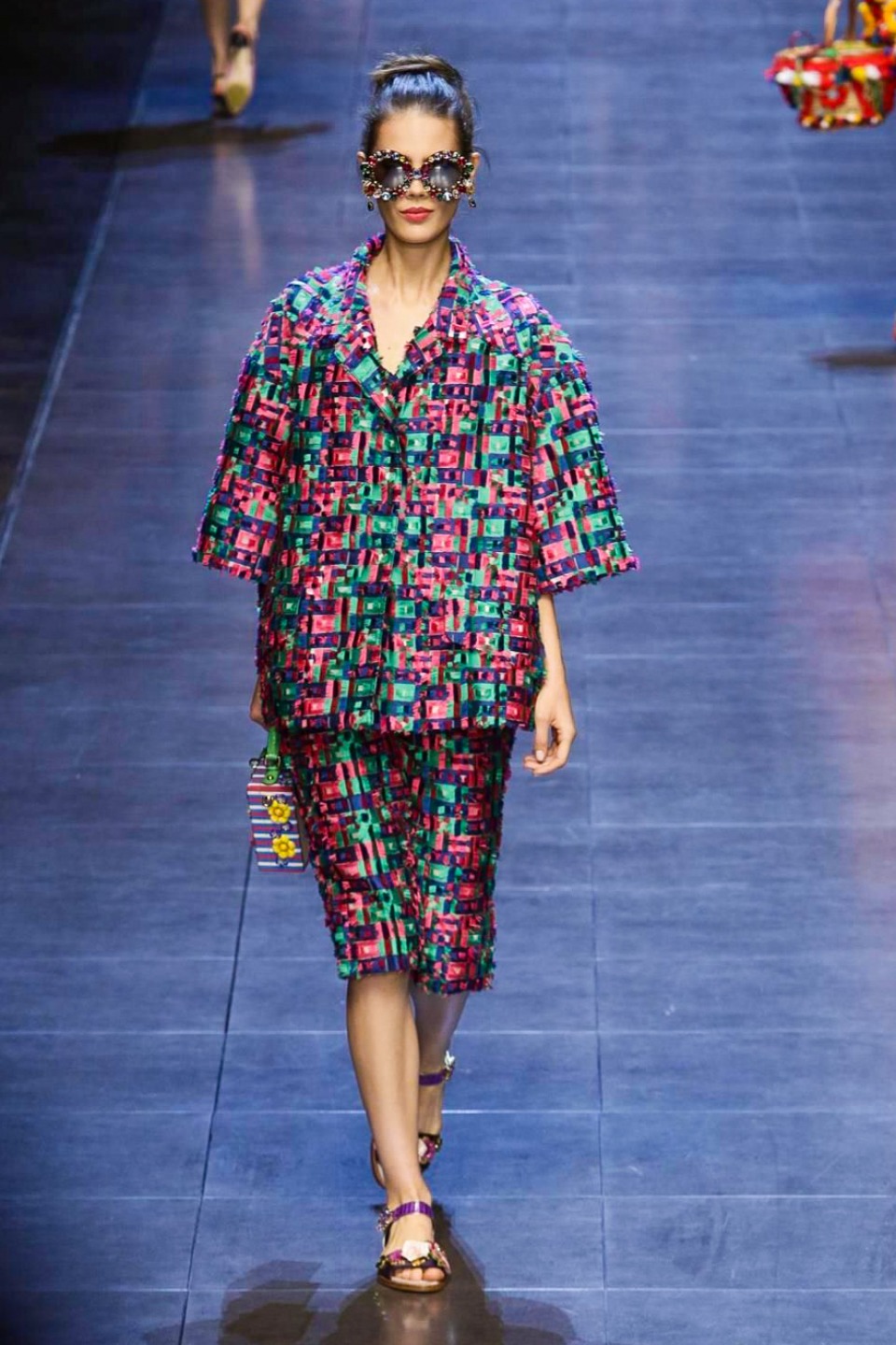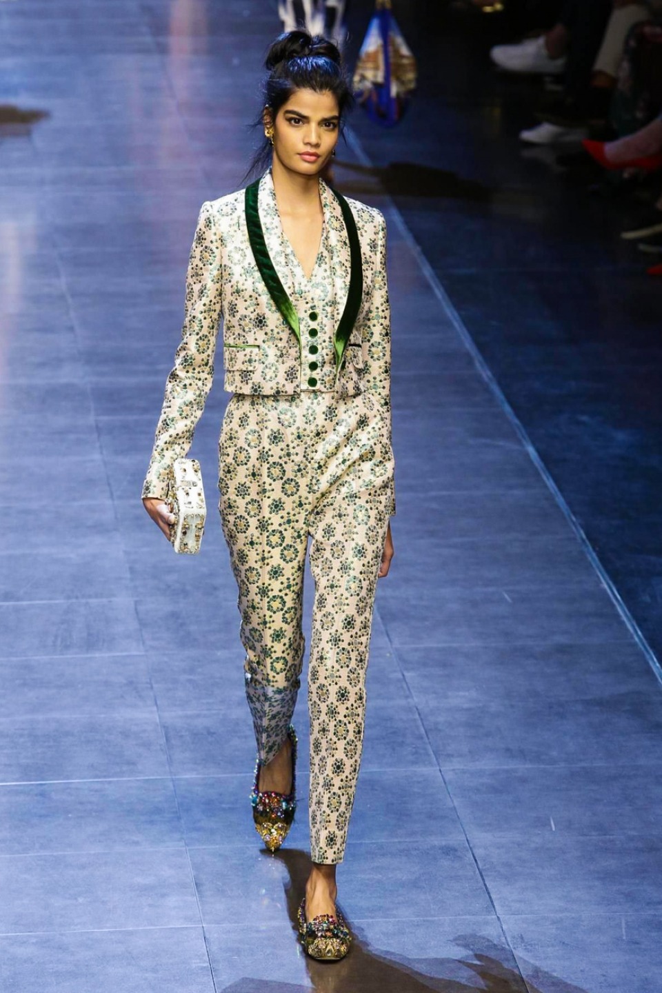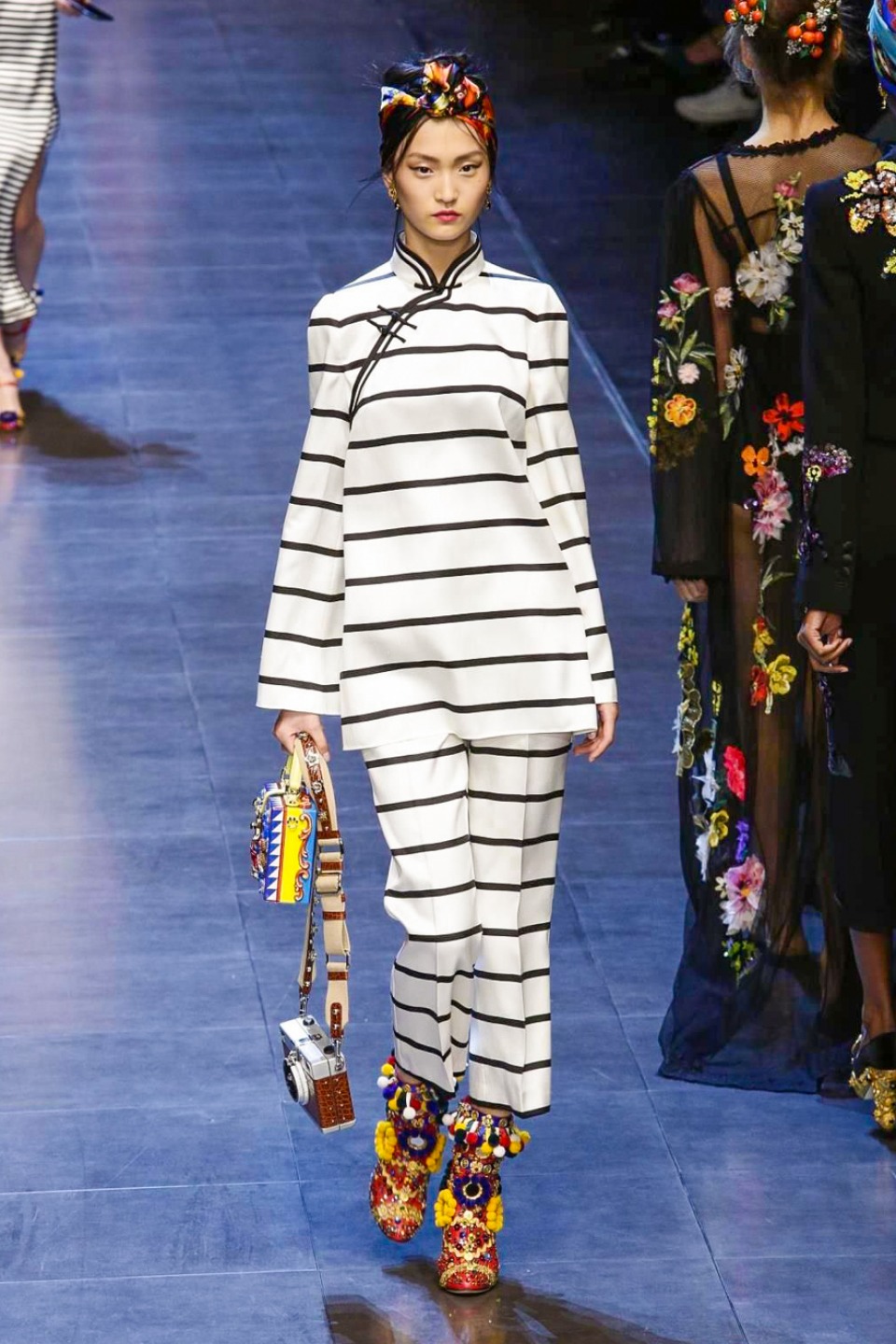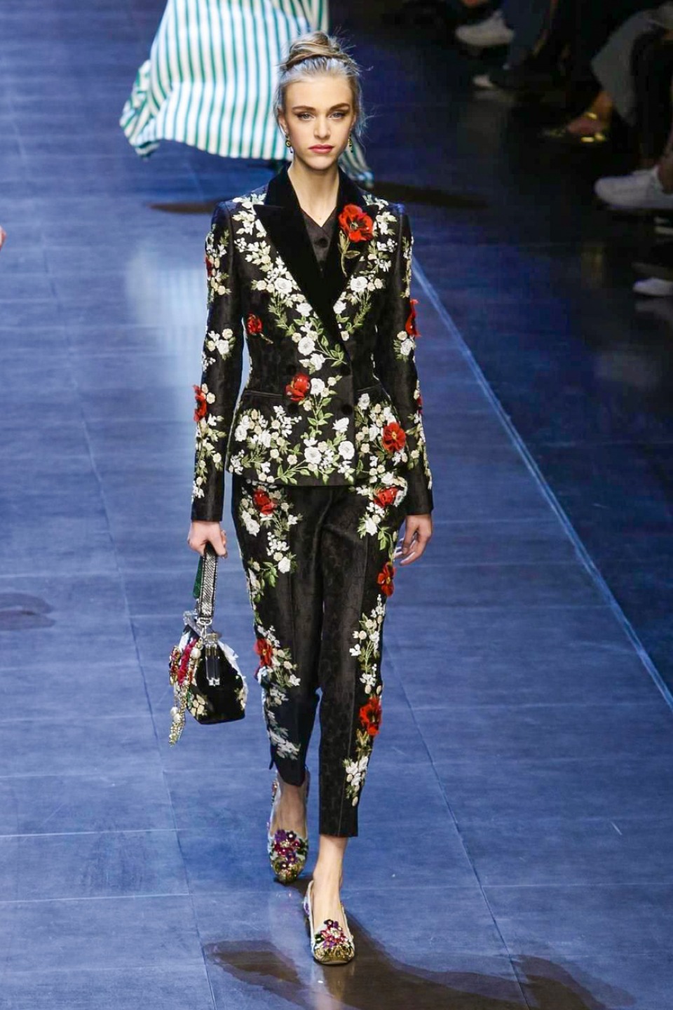 „Italia is Love“, the show was called – and it was a world tour of references: Peruvian pom-poms, chinoiserie dresses, riviera style, Italian tradition – all transposed the Dolce & Gabbana way. So color, embellishment, print, and texture were not in short supply. Many pieces featured pictures of Italian landmarks and phrases like „Italia Forever“ and „Italia is love,“ which was also seen on the invitations and on a sign at the top of the runway set. Floral prints, embroidery and appliqués were used heavily; there were also lots of landscape prints and what looked like painted-on brush strokes. Dresses and skirts made up the majority of the collection, but there were also several fun suits and a couple of pajama-inspired looks. Statement accessories — from gigantic bejeweled sunglasses to headpieces covered in fruit to embellished, on-theme handbags — abounded as usual.. For the finale, models changed into matching dresses that mimicked postcards from various Italian cities and charged the runway en masse, snapping more selfies along the way. All the Dolce & Gabbana DNA was there as it always is – it was just about another way in showing it off: the social network.
