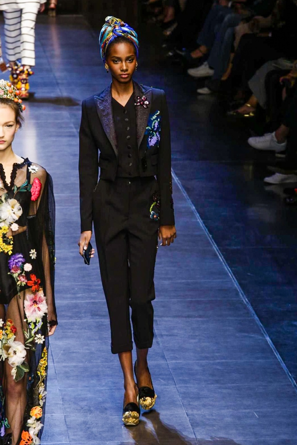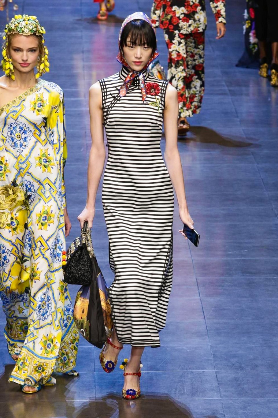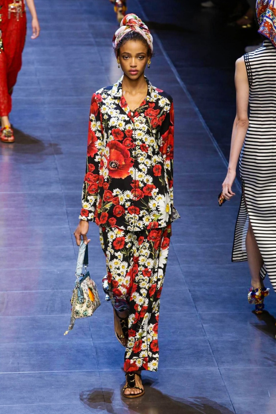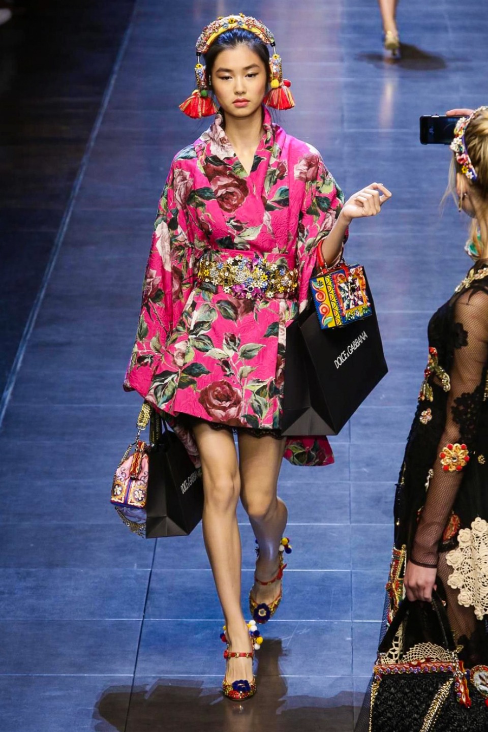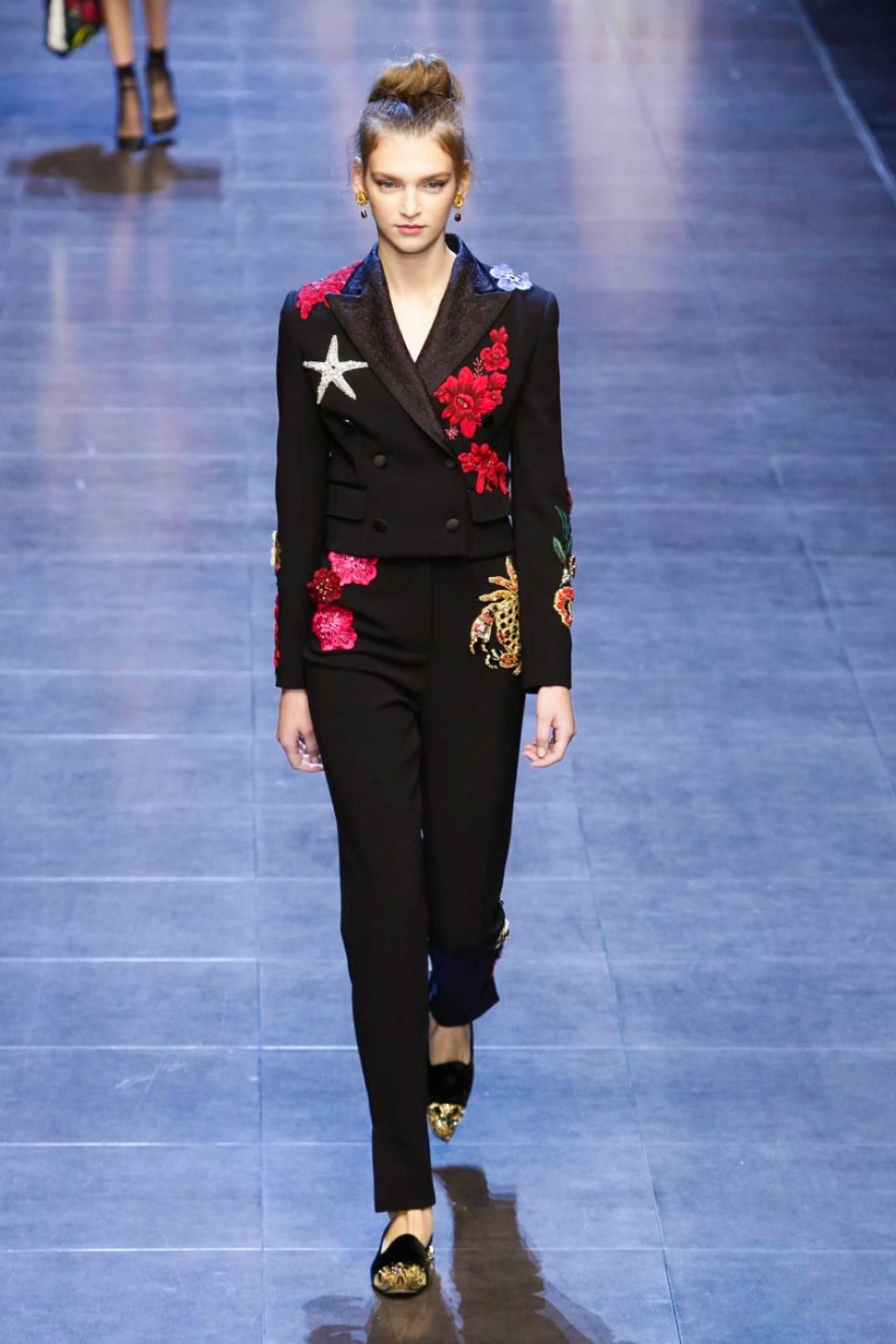 „Italia is Love“, the show was called – and it was a world tour of references: Peruvian pom-poms, chinoiserie dresses, riviera style, Italian tradition – all transposed the Dolce & Gabbana way. So color, embellishment, print, and texture were not in short supply. Many pieces featured pictures of Italian landmarks and phrases like „Italia Forever“ and „Italia is love,“ which was also seen on the invitations and on a sign at the top of the runway set. Floral prints, embroidery and appliqués were used heavily; there were also lots of landscape prints and what looked like painted-on brush strokes. Dresses and skirts made up the majority of the collection, but there were also several fun suits and a couple of pajama-inspired looks. Statement accessories — from gigantic bejeweled sunglasses to headpieces covered in fruit to embellished, on-theme handbags — abounded as usual.. For the finale, models changed into matching dresses that mimicked postcards from various Italian cities and charged the runway en masse, snapping more selfies along the way. All the Dolce & Gabbana DNA was there as it always is – it was just about another way in showing it off: the social network.