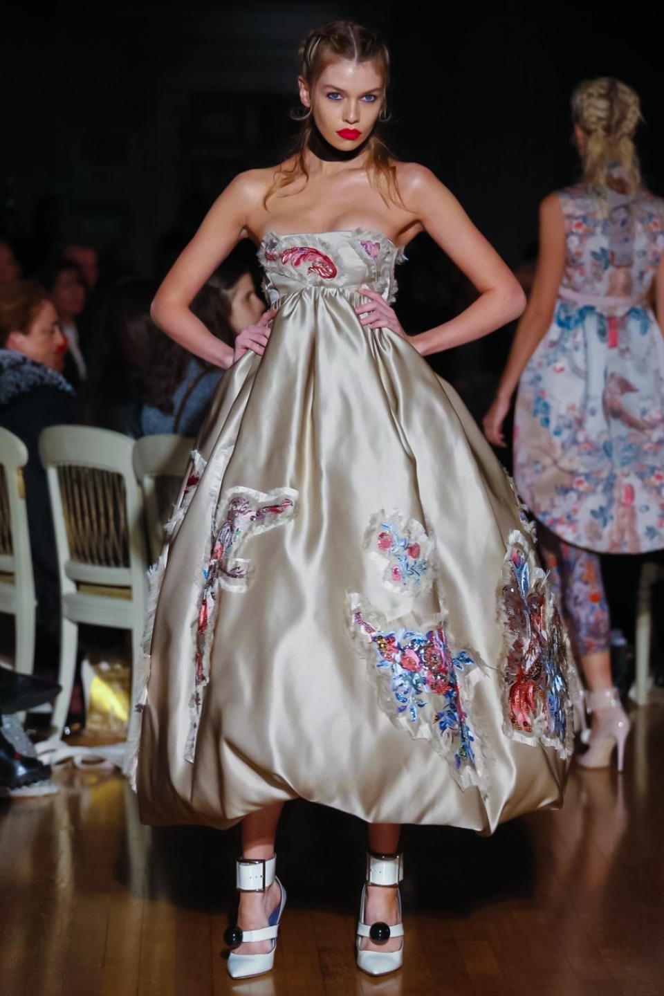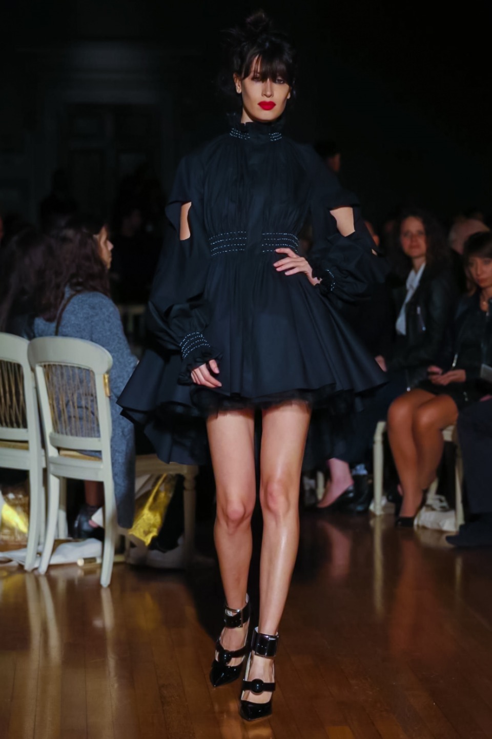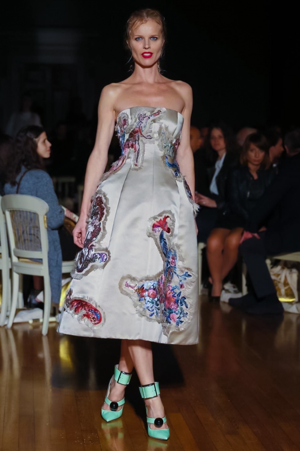 Even Deacon’s calmer exits were still statement-making, as in a body-hugging, bias cut gown with a train, or a silk petticoat dress with tiered, billowing skirts. The collection was beautiful and arresting, and while its historical opulence overwhelmed real-world dressing, this also gave it an otherworldly, romantic Appeal.