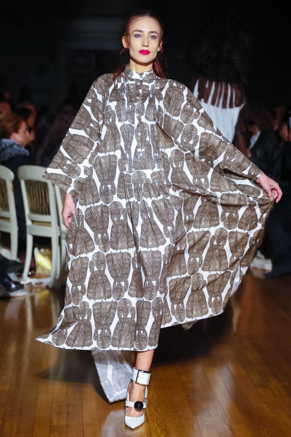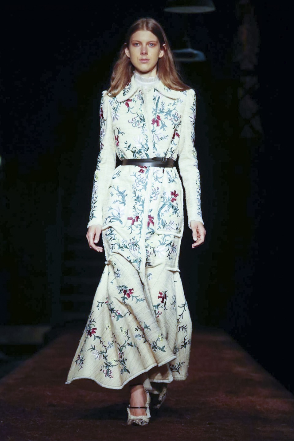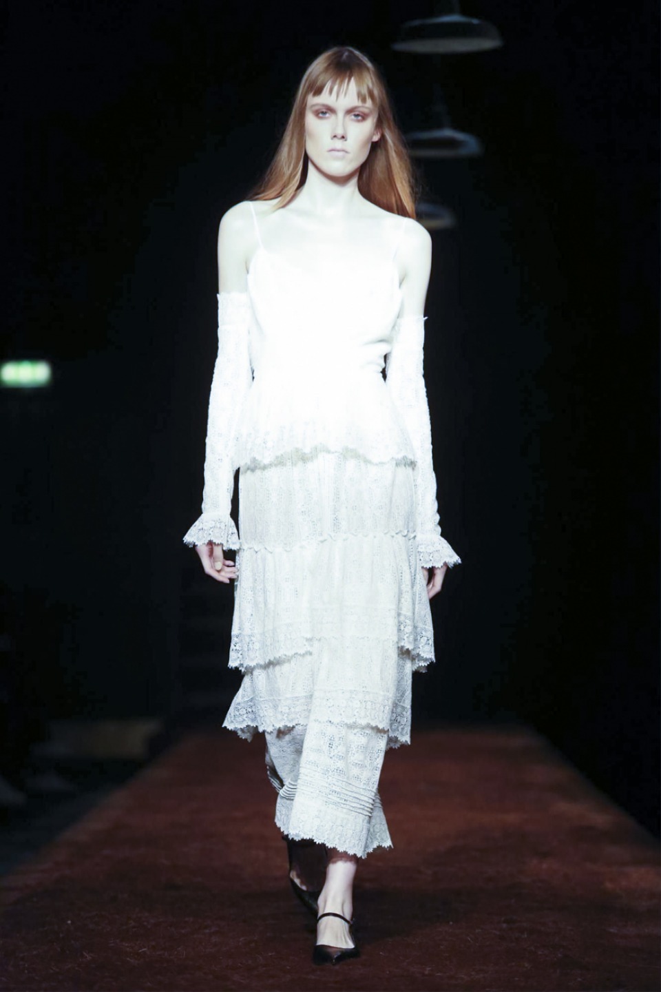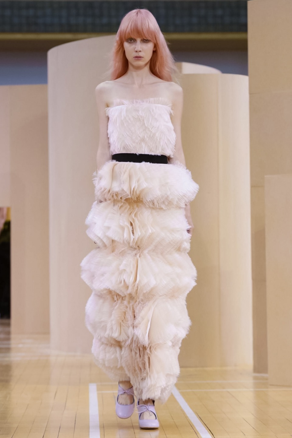 Even Deacon’s calmer exits were still statement-making, as in a body-hugging, bias cut gown with a train, or a silk petticoat dress with tiered, billowing skirts. The collection was beautiful and arresting, and while its historical opulence overwhelmed real-world dressing, this also gave it an otherworldly, romantic Appeal.