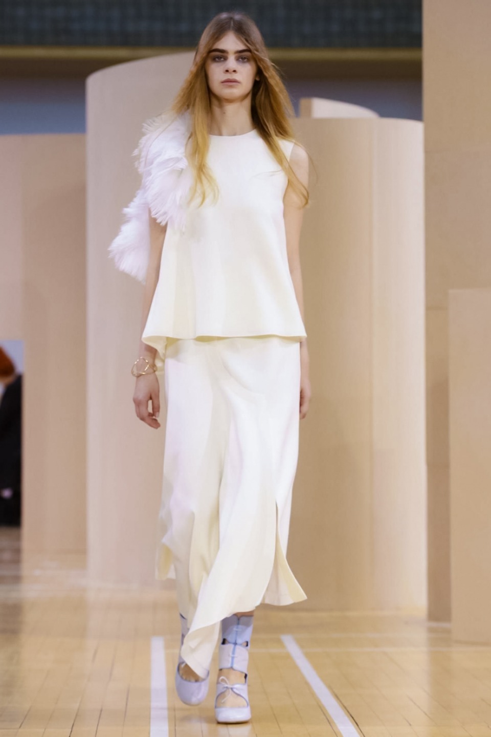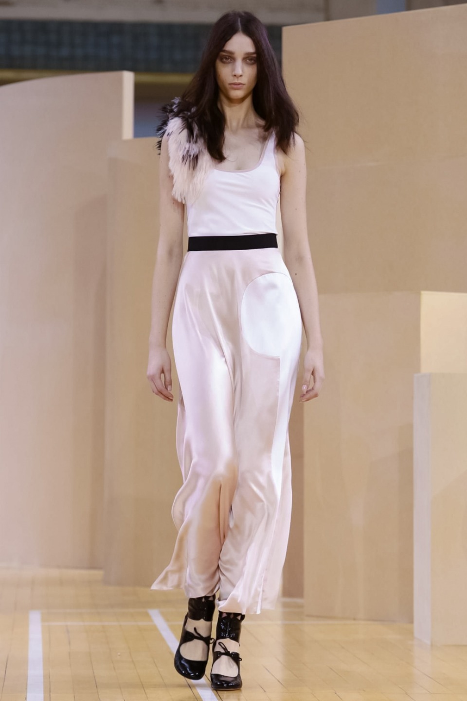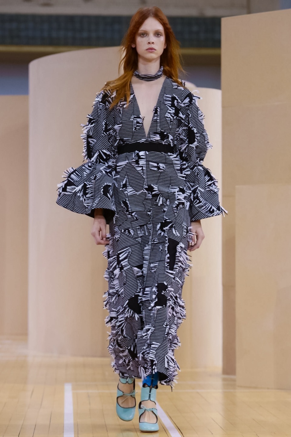 To celebrate her milestone 10th anniversary at London Fashion, Roksanda looked to the work of sculptor Pascal Pierme and the light touch of Ikebana flower arranging and re-imagined it through her own impeccable vision. The models were her flowers, the clothes her sculptural signature. Set under high-vaulted deco arches, modernist curves and cubes of blush pink, MDF installations distorted the models’ walk around the venue, and brought the audience closer to the pieces.
