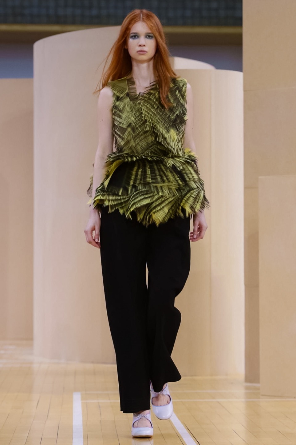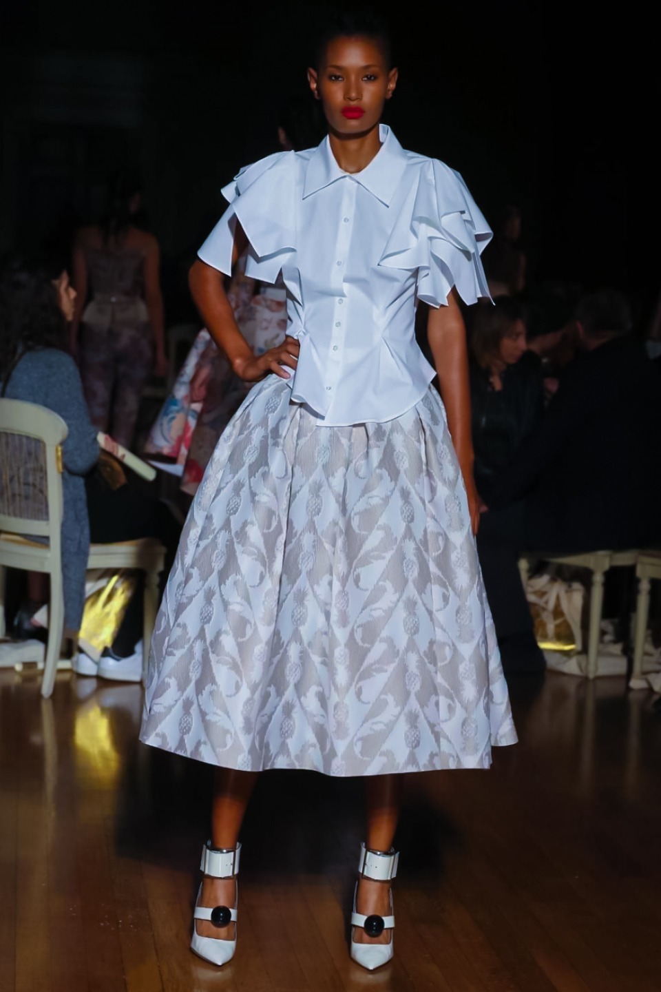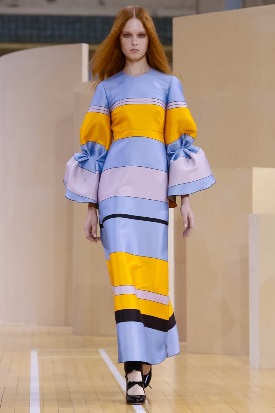 Sleeves were gathered like sweet wrappers, drop shoulders were full and softly ruffled, and pantsuits placed the ruffled waistband so high they became jumpsuits. Colours of ice blue, nude, acidic yellow and burnt orange are signatures of Roksanda, but this season she outlined and punctuated with black, and mixed block colour cutouts, panelling and applied architectural precision with their placement.
