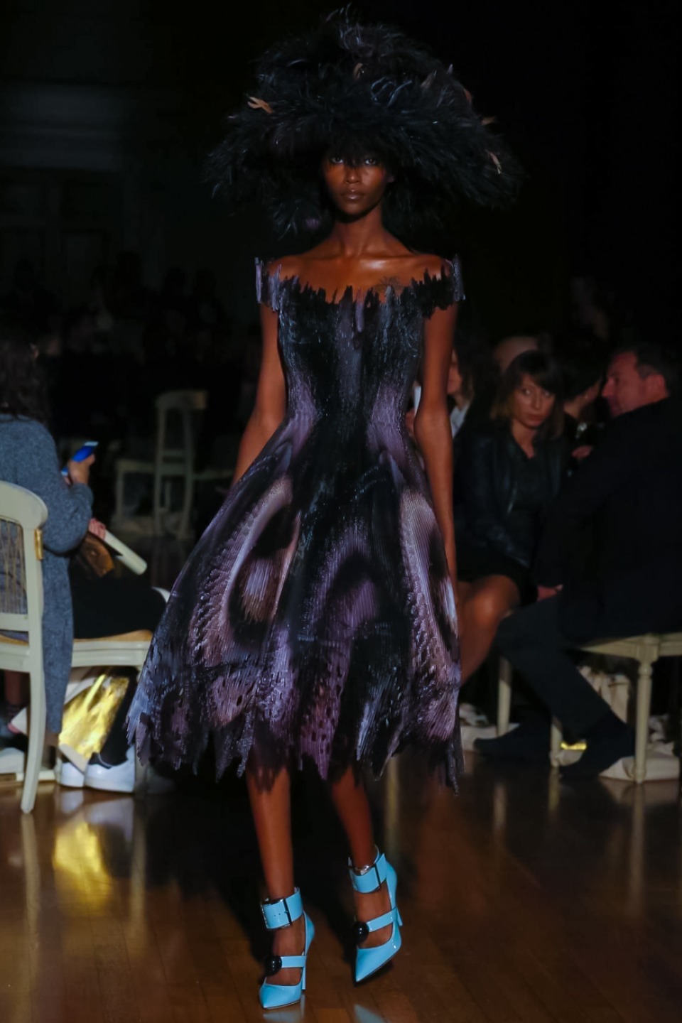 One satin bustier dress was structured with stiff panniers, and intricately embroidered with flowers, while another standout worn by Elson was done in a purple abstract print, with laser-cut edges that looked as if they had been charred by fire, and fan of material at the back that resembled unfurled peacock feathers.