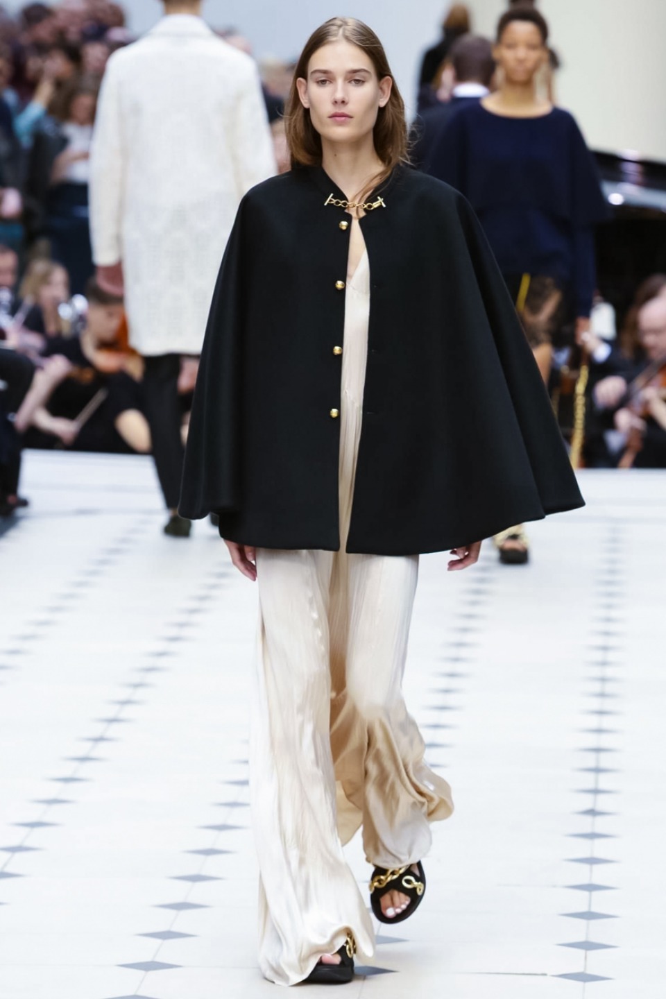 With such strong internal culture and iconography intact several seasons after her departure, Christopher Bailey probably felt it was high time for the brand to explore new propositions. The Burberry girl witnessed today had a streak of street realism. Her hair was at times an undercut, sometimes cropped and in other looks mildly textured, perhaps out-of-bed. Lips were in the statement shade of black rose. See-through English broderie dresses were worn under shrunken peacoats with gold military detail — you could almost hear the designer quipping „lingerie is the new outerwear“ for spring. Bridal silk satin maxi dresses suggested the notion of vintage outfitting, taking an old ’80s gown, possibly a family heirloom, and paring it down with sandals. Bailey’s girl is now a lot more rebellious than before.