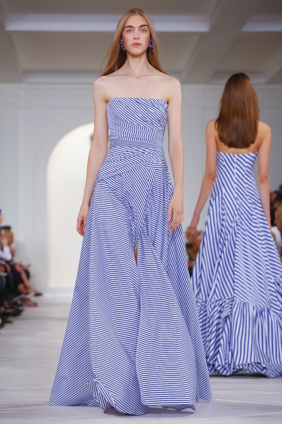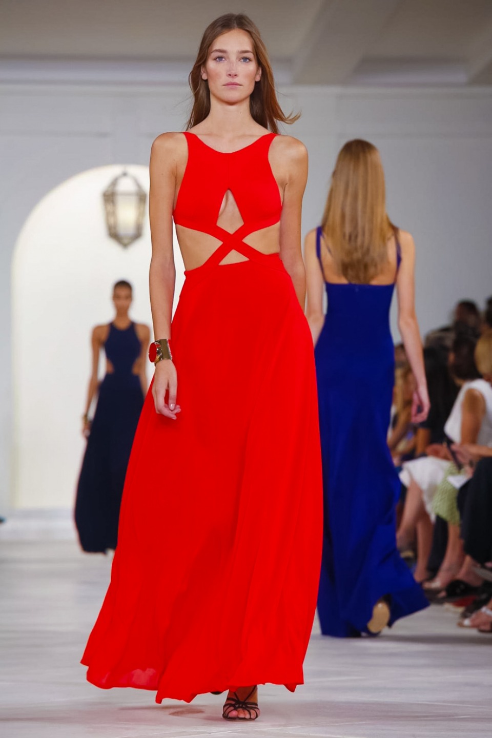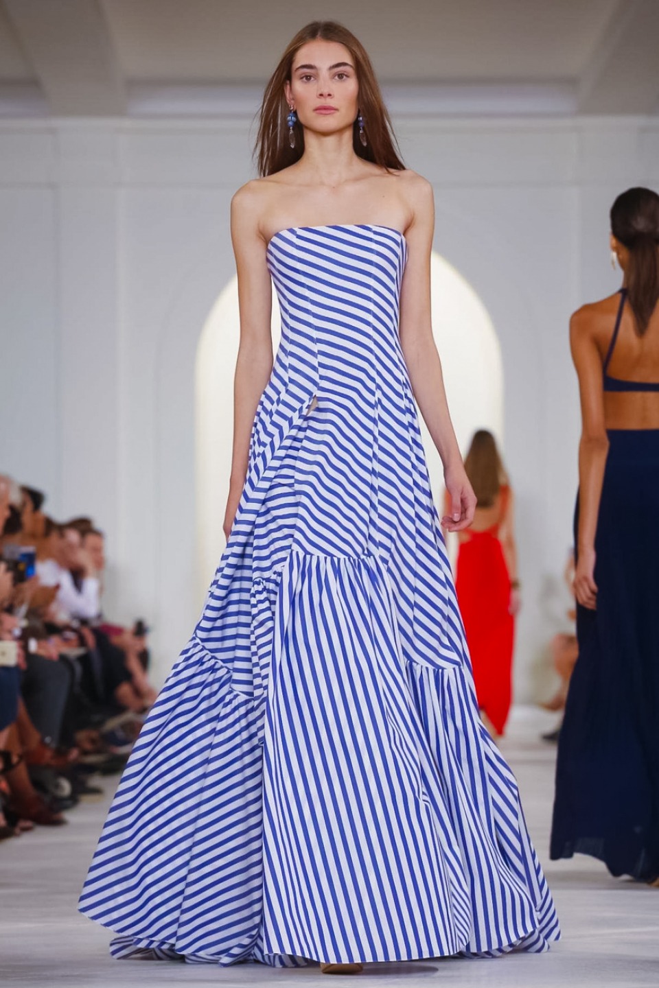 Ralph Lauren suggests bold graphic maxidresses, here they curved in lines of red and blue; wide palazzo pants and fine-knit bodysuits complete with cutouts. Of course, you’ll need a ballgown – in stripes – and plenty of preppy shirting, for which the designer is so well-known.