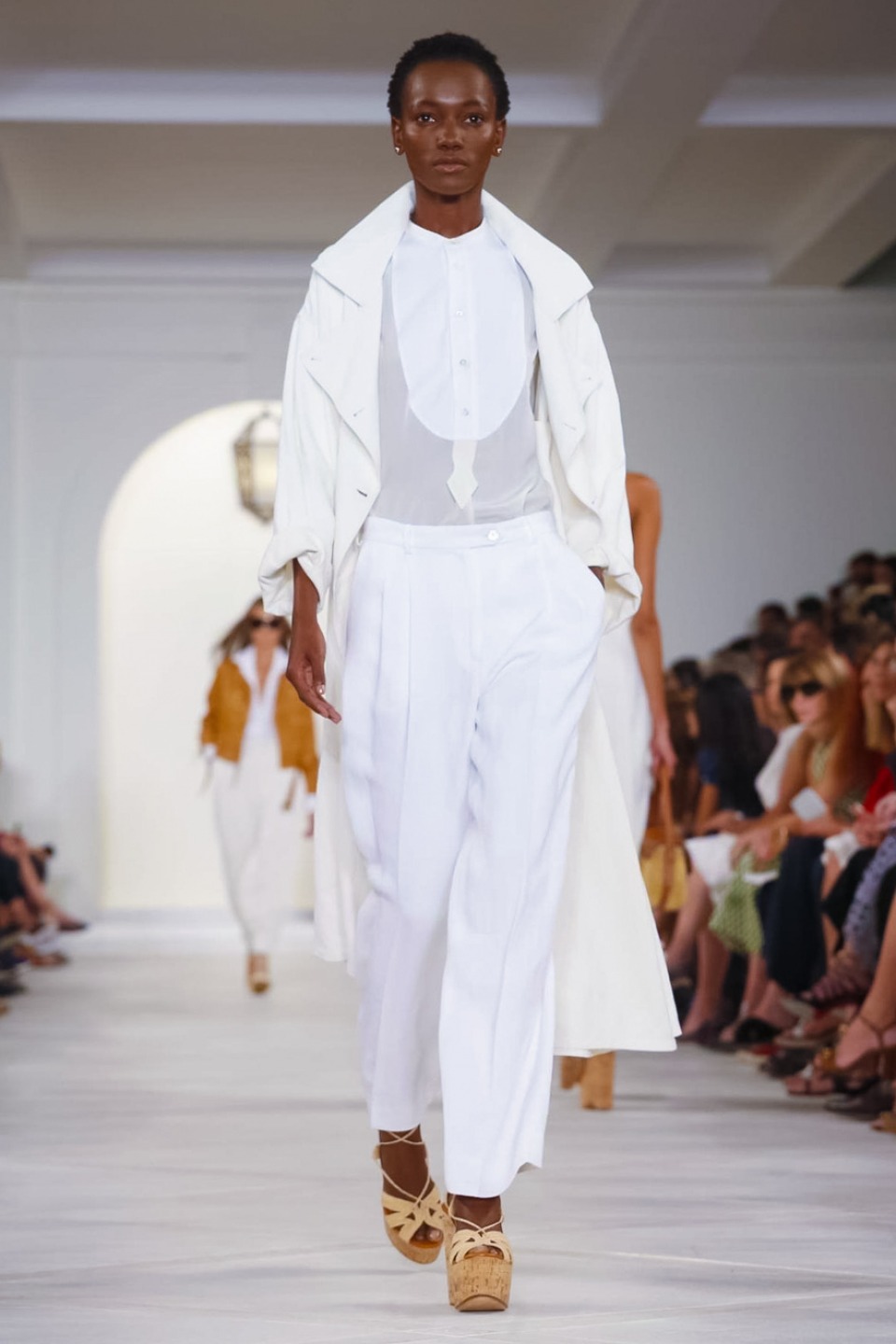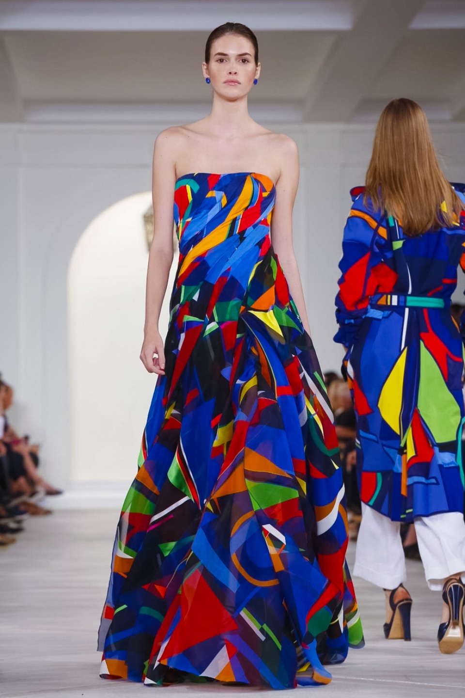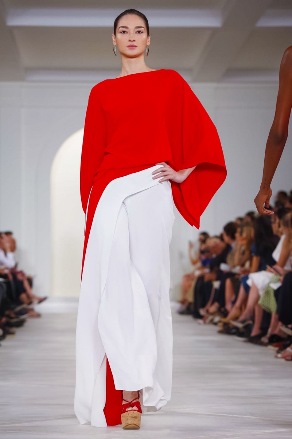Ralph Lauren suggests bold graphic maxidresses, here they curved in lines of red and blue; wide palazzo pants and fine-knit bodysuits complete with cutouts. Of course, you’ll need a ballgown – in stripes – and plenty of preppy shirting, for which the designer is so well-known.