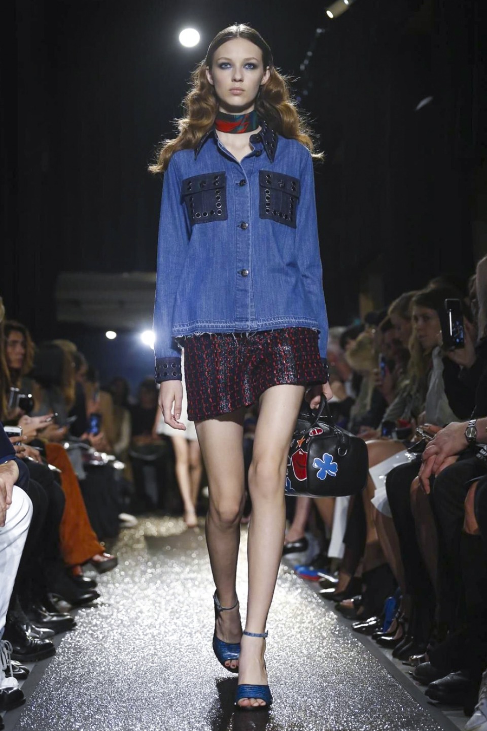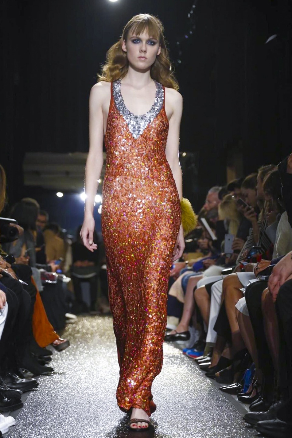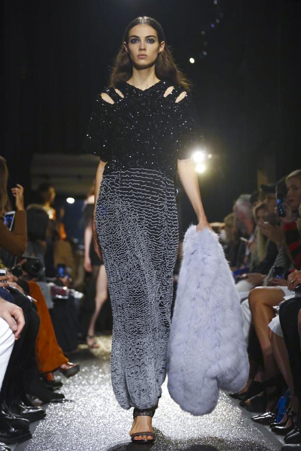 De Libran has a light touch, Rykiel’s signature stripes materialized in many different guises: on tweedy tailoring, knitted fur chubbies, a belted organza peasant dress and the bikini underneath it, even on a basic V-neck. As a female designer, she can romance an easy three-quarter-length denim skirt or an army parka just as well as she can a sequined minidress, but by the end of the collection, things were very Glamour- there were a final series of richly colored sequin gowns. They will shimmer and sparkle even in the darkest corner of a european’s famous nightclubs. And for those who prefer a more understated boit de nuit alternative, de Libran has got them covered. Wearing a pair of silk pajamas covered in a delicate bird motif to go out dancing all night just sounds like the chicest thing going.