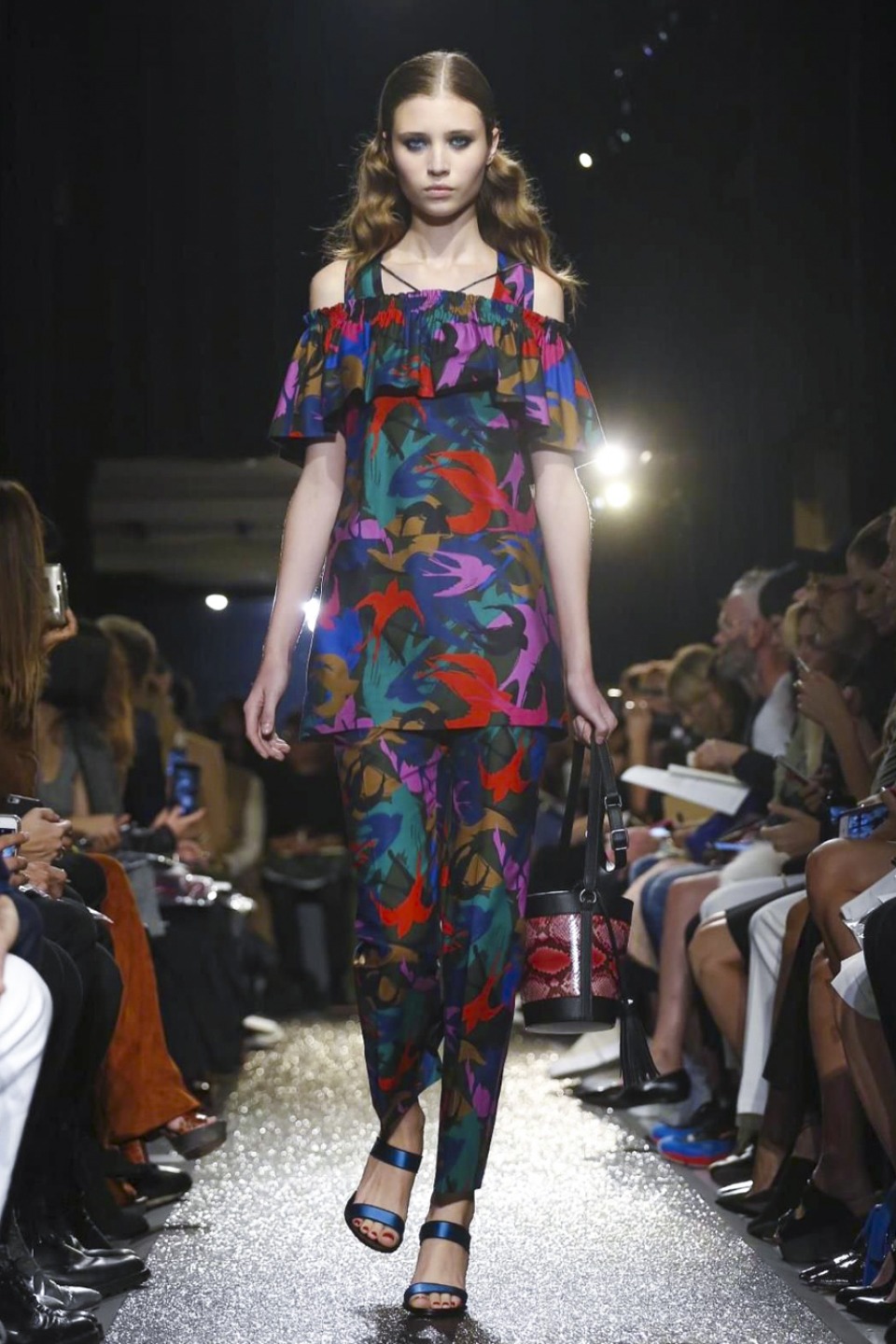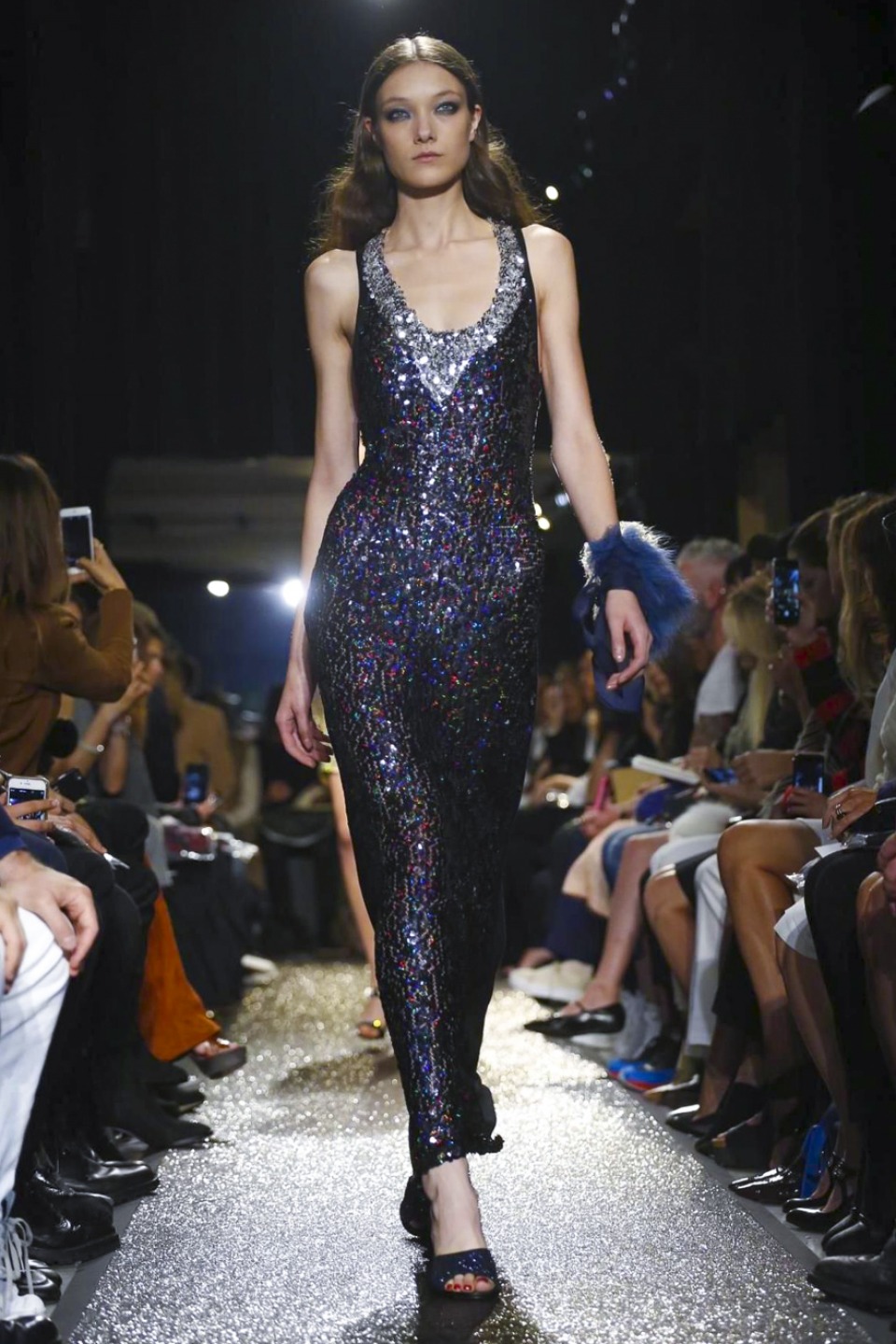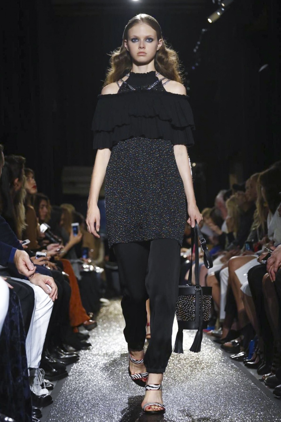 De Libran has a light touch, Rykiel’s signature stripes materialized in many different guises: on tweedy tailoring, knitted fur chubbies, a belted organza peasant dress and the bikini underneath it, even on a basic V-neck. As a female designer, she can romance an easy three-quarter-length denim skirt or an army parka just as well as she can a sequined minidress, but by the end of the collection, things were very Glamour- there were a final series of richly colored sequin gowns. They will shimmer and sparkle even in the darkest corner of a european’s famous nightclubs. And for those who prefer a more understated boit de nuit alternative, de Libran has got them covered. Wearing a pair of silk pajamas covered in a delicate bird motif to go out dancing all night just sounds like the chicest thing going.
