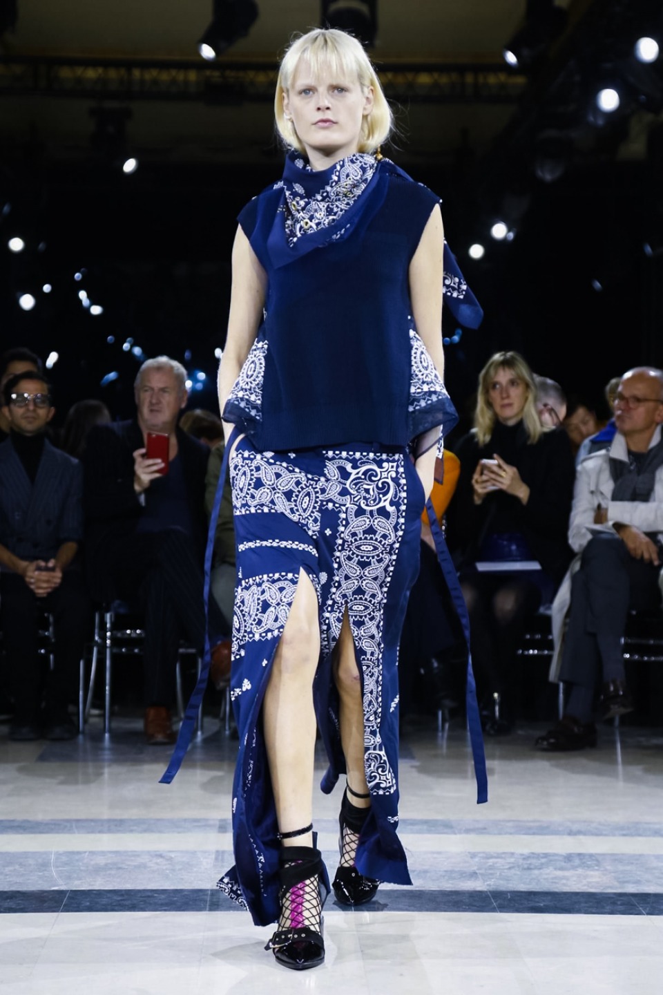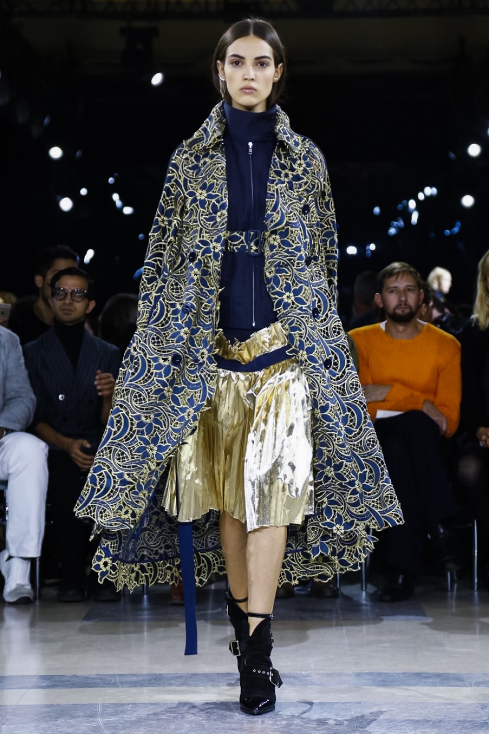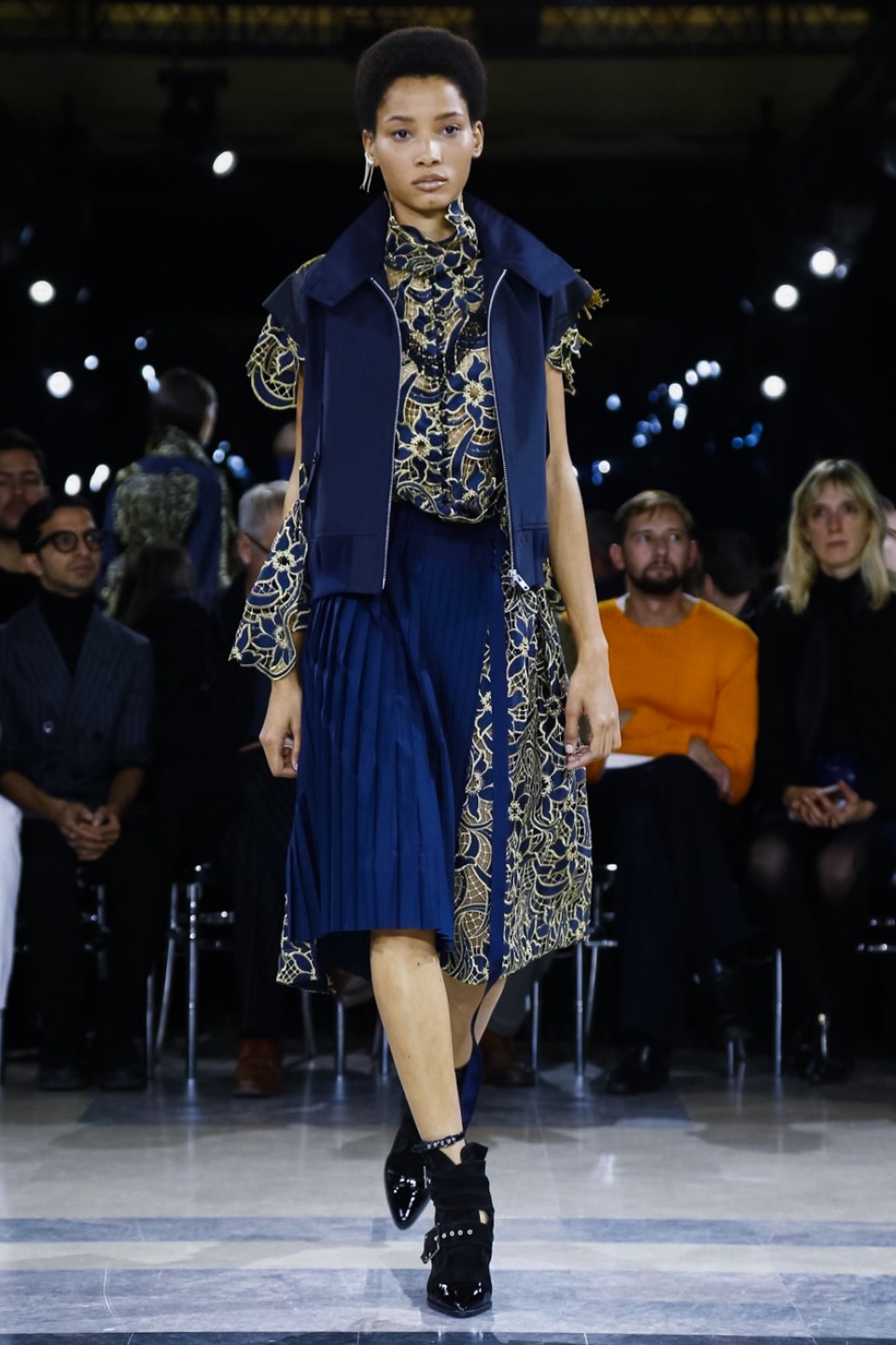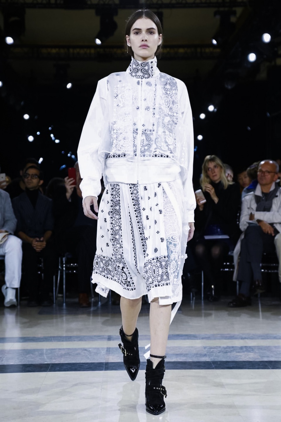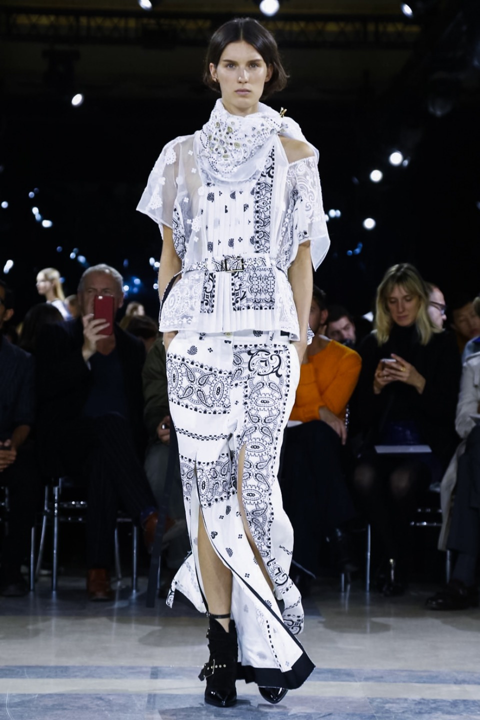 At this season Chitose Abe was brimming with ideas inspired by thrift-shop throw-away finds. Her treasures comprised souvenir scarf prints, hers depicted a safari Leopard scene, american bandana motifs,victorian lace – all came together to create cropped bombers with open backs, military jackets with gold guipure lace and epaulettes streaming in silk cord, knife-pleated skirts and wide leg trousers gashed open.
