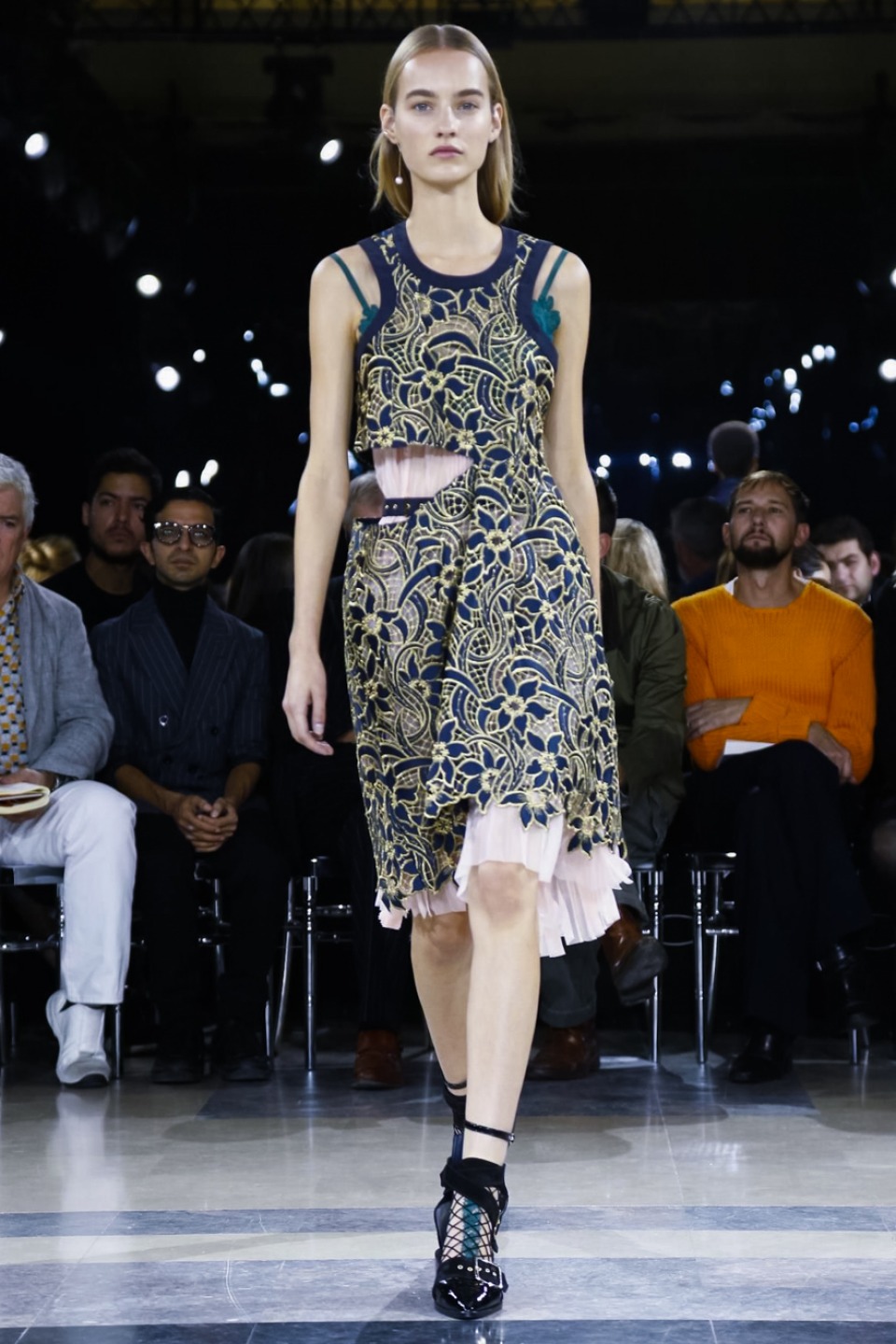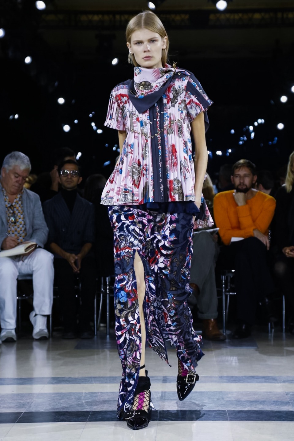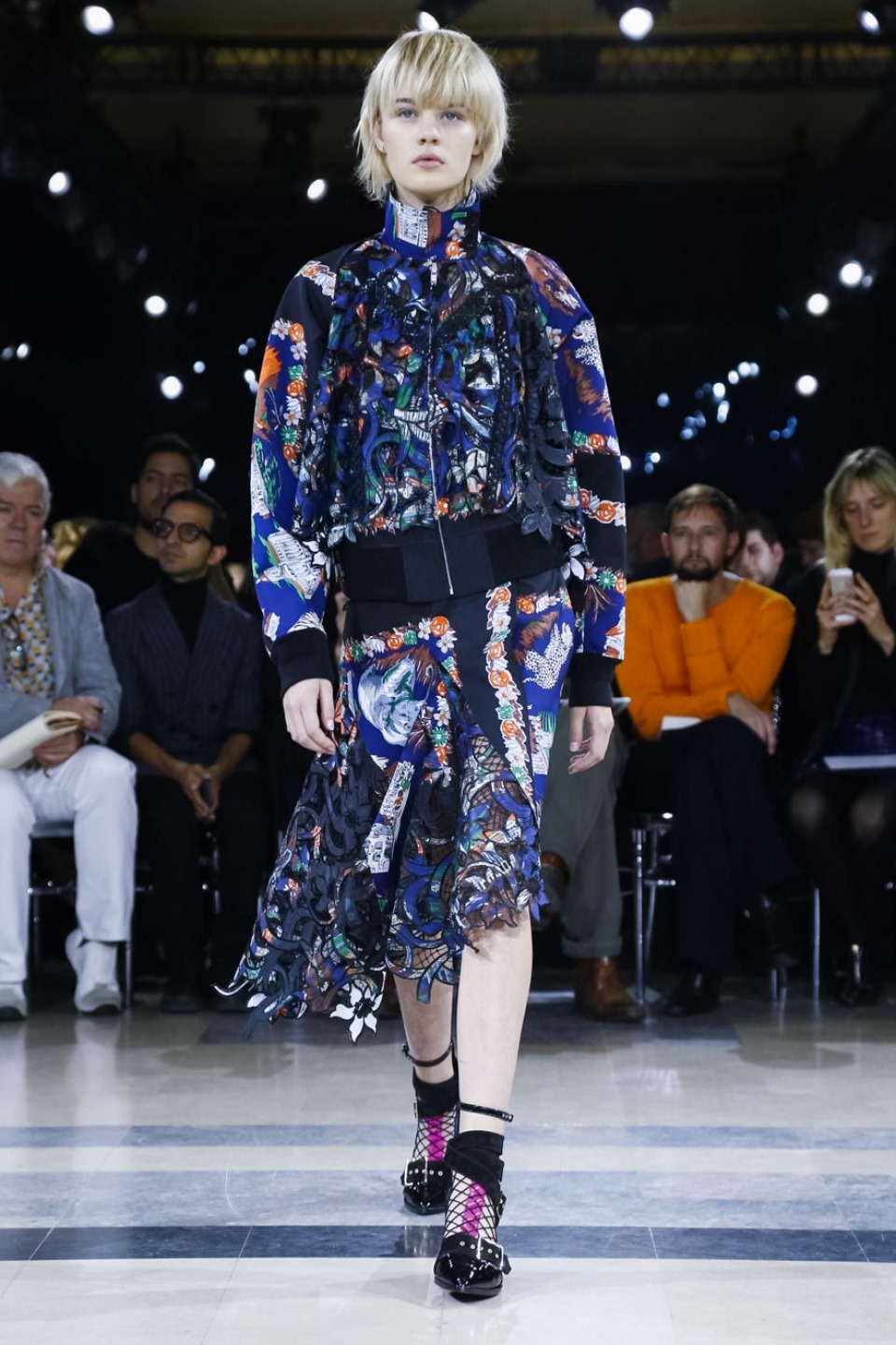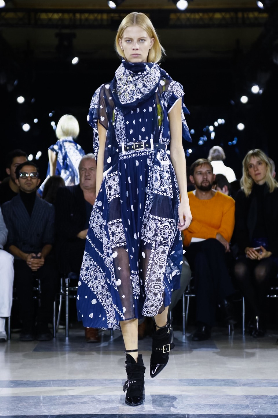 At this season Chitose Abe was brimming with ideas inspired by thrift-shop throw-away finds. Her treasures comprised souvenir scarf prints, hers depicted a safari Leopard scene, american bandana motifs,victorian lace – all came together to create cropped bombers with open backs, military jackets with gold guipure lace and epaulettes streaming in silk cord, knife-pleated skirts and wide leg trousers gashed open.
