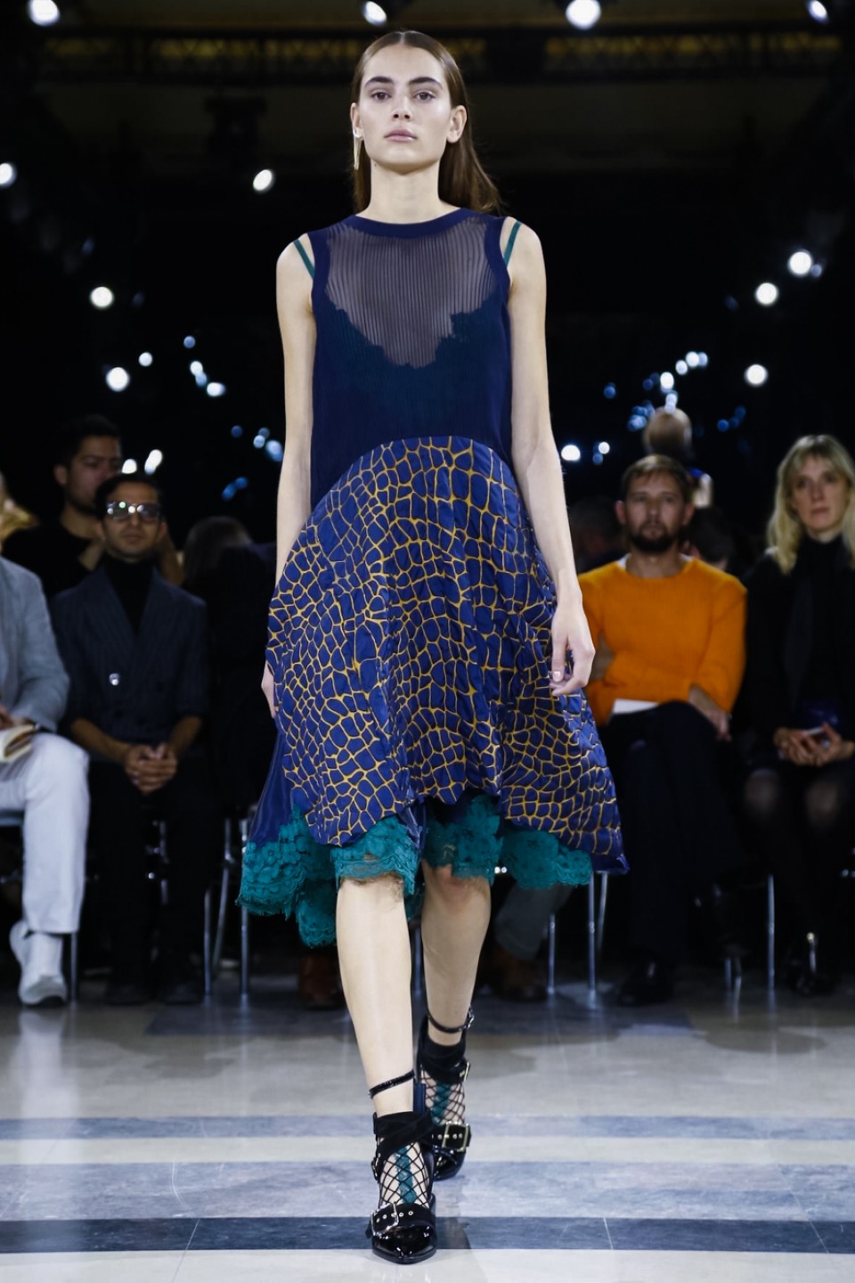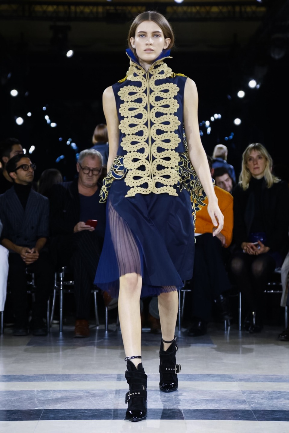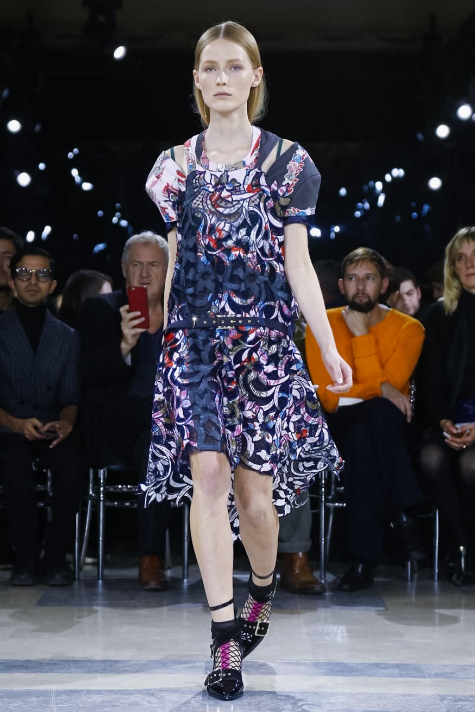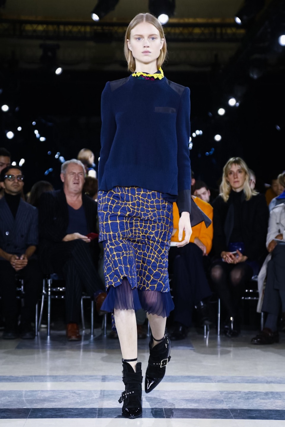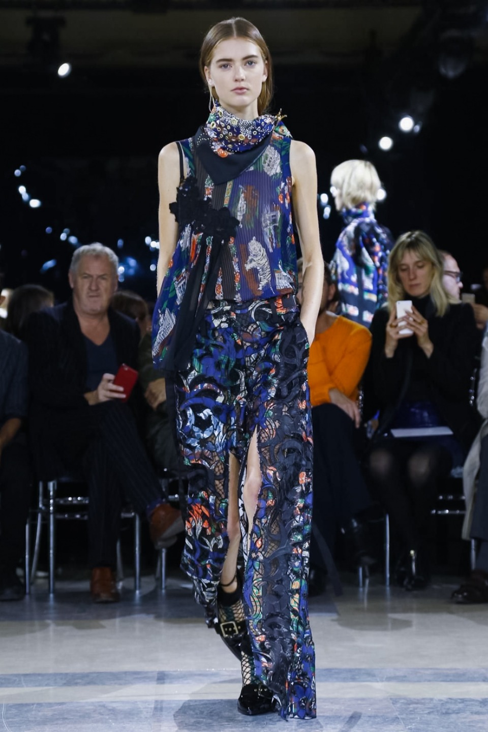 At this season Chitose Abe was brimming with ideas inspired by thrift-shop throw-away finds. Her treasures comprised souvenir scarf prints, hers depicted a safari Leopard scene, american bandana motifs,victorian lace – all came together to create cropped bombers with open backs, military jackets with gold guipure lace and epaulettes streaming in silk cord, knife-pleated skirts and wide leg trousers gashed open.