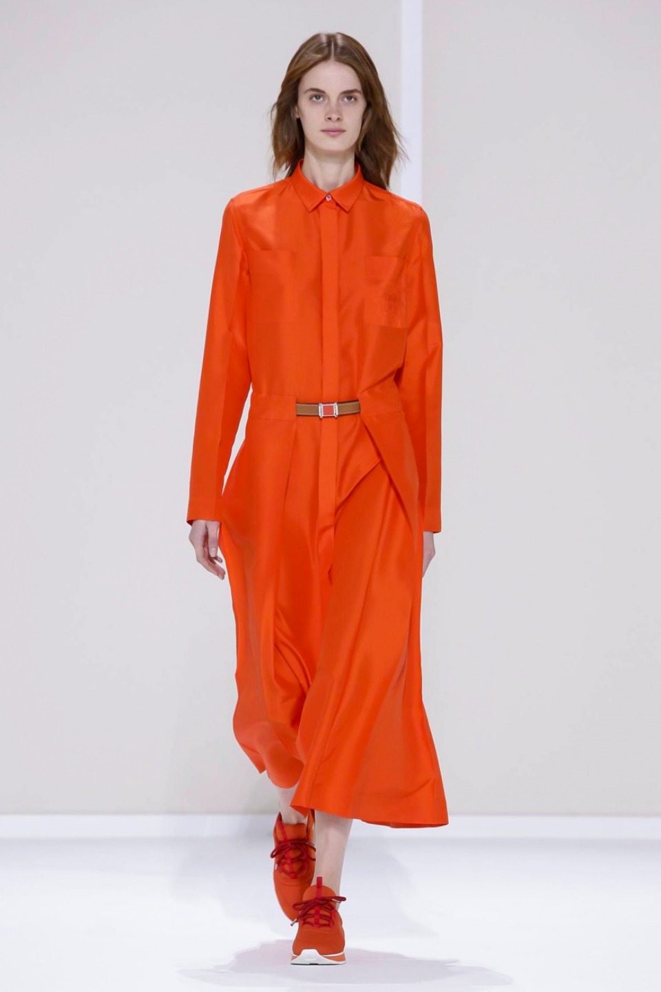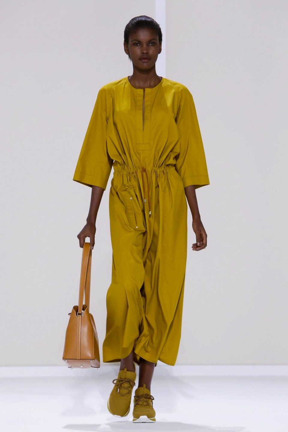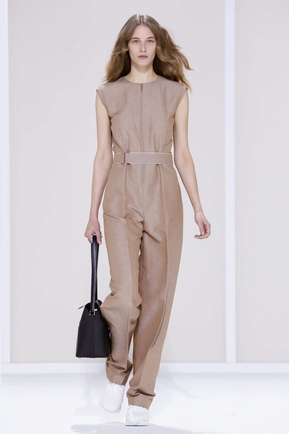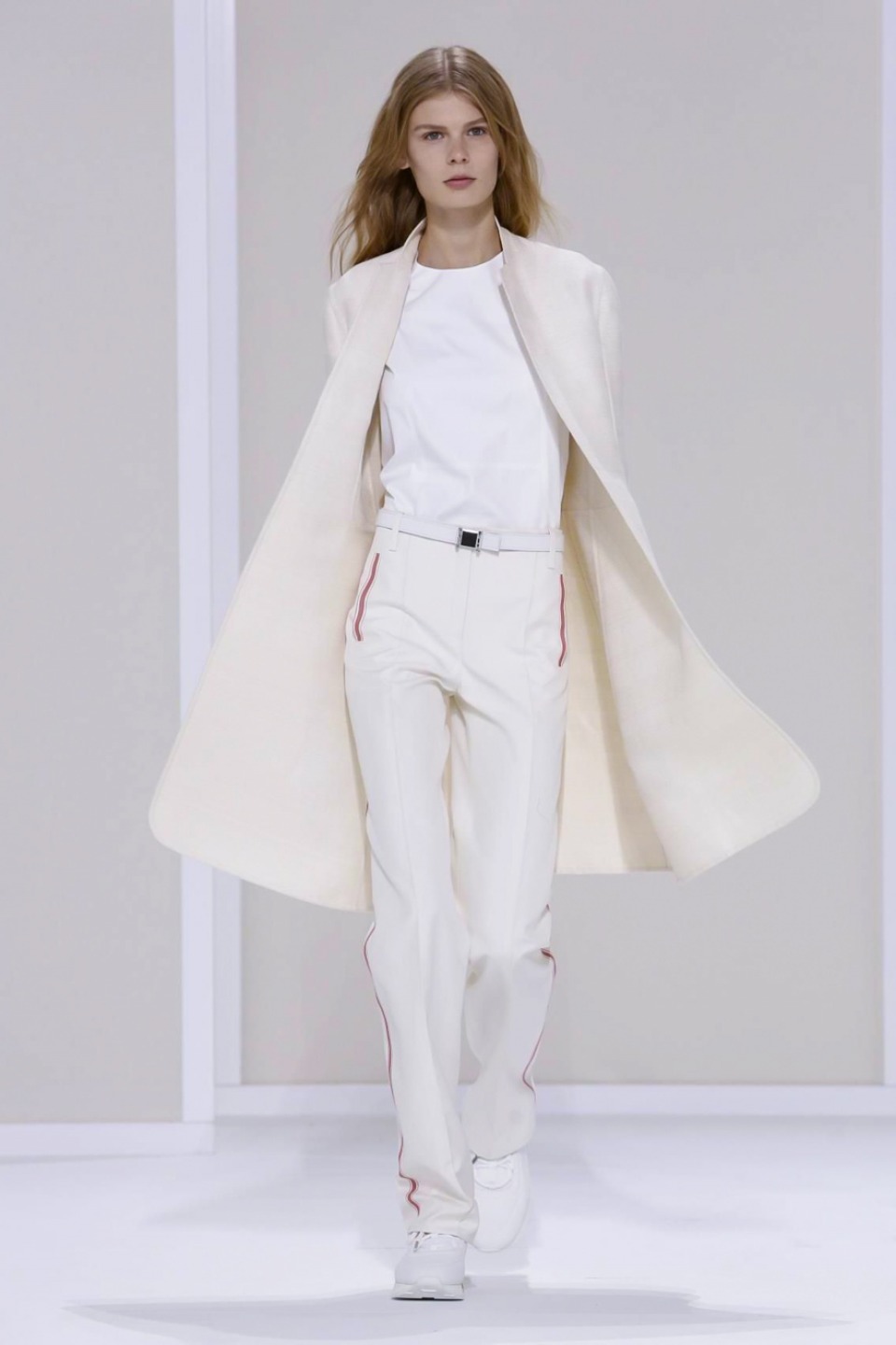 It’s not easy to find words to explain the ingeniously crafted, superfine fabrics and leather it uses in Hermés without sounding pretentious. I’ll try to describe what the Hermés about : Hermès is the essence of the cultivated, inbred french point of view that if you have wealth, it must be spent so that it doesn’t show except to those of your class. (Anyway a woman must never blunder by trying to be sexy, appear to wear makeup, or have done hair direct from hair stylist! – but too much women are half-blind to all these nuances. ) A lot of us wanted to know how Vanhee-Cybulski would set out the Hermès principles for Spring. and what can i tell you- she did it – with a simplified sequence of blue-black tailoring and grid-patterned black-on-cream tops and pants, and mustard-color dresses in cotton and leather, accessorized with large quartz and clear resin cuffs. She’s brought a sense of relaxed city-sportiness to the picture, showing Hermès trainers with many looks and dialing back on the horsey heritage for the moment. It’s not showy “fashion” that is being sold here; more a carefully calibrated sense of a lifestyle which consciously rises above trendiness. For those who want to belong to it, the quality of the materials will be explained in the ritual of buying at Hermès.