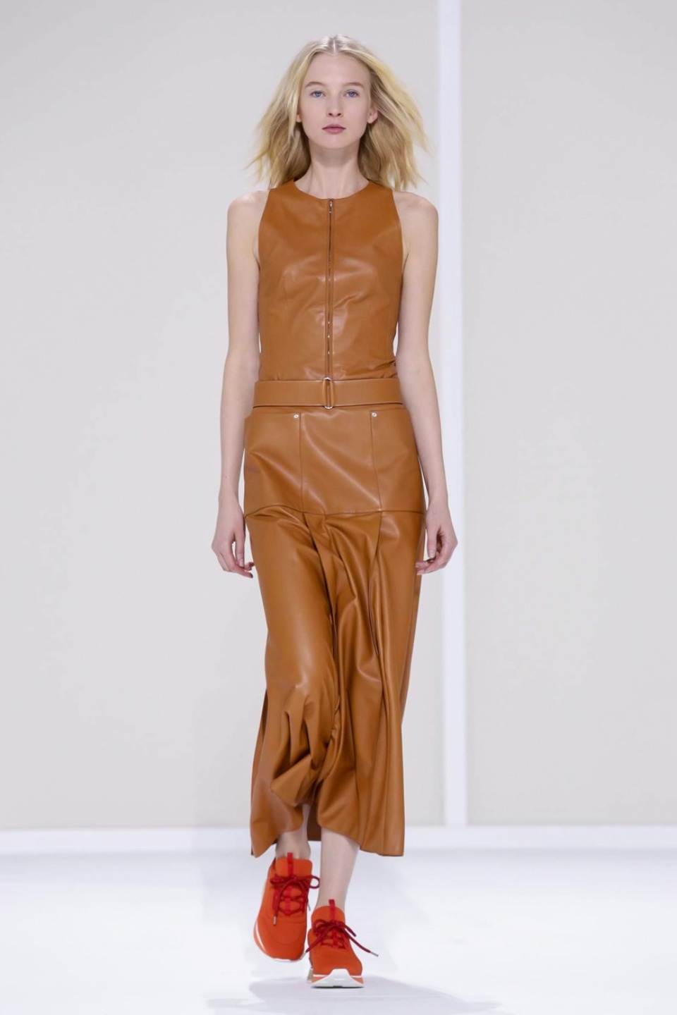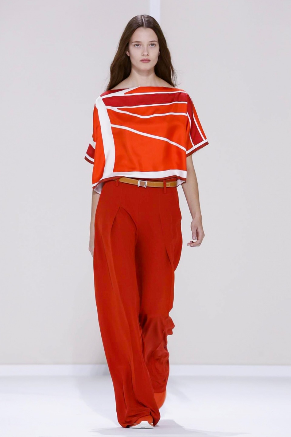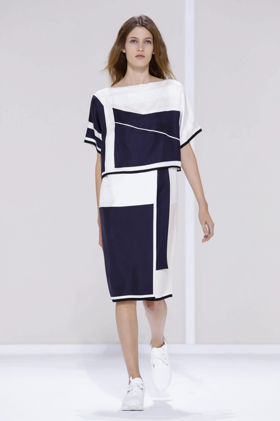 It’s not easy to find words to explain the ingeniously crafted, superfine fabrics and leather it uses in Hermés without sounding pretentious. I’ll try to describe what the Hermés about : Hermès is the essence of the cultivated, inbred french point of view that if you have wealth, it must be spent so that it doesn’t show except to those of your class. (Anyway a woman must never blunder by trying to be sexy, appear to wear makeup, or have done hair direct from hair stylist! – but too much women are half-blind to all these nuances. ) A lot of us wanted to know how Vanhee-Cybulski would set out the Hermès principles for Spring. and what can i tell you- she did it – with a simplified sequence of blue-black tailoring and grid-patterned black-on-cream tops and pants, and mustard-color dresses in cotton and leather, accessorized with large quartz and clear resin cuffs. She’s brought a sense of relaxed city-sportiness to the picture, showing Hermès trainers with many looks and dialing back on the horsey heritage for the moment. It’s not showy “fashion” that is being sold here; more a carefully calibrated sense of a lifestyle which consciously rises above trendiness. For those who want to belong to it, the quality of the materials will be explained in the ritual of buying at Hermès.