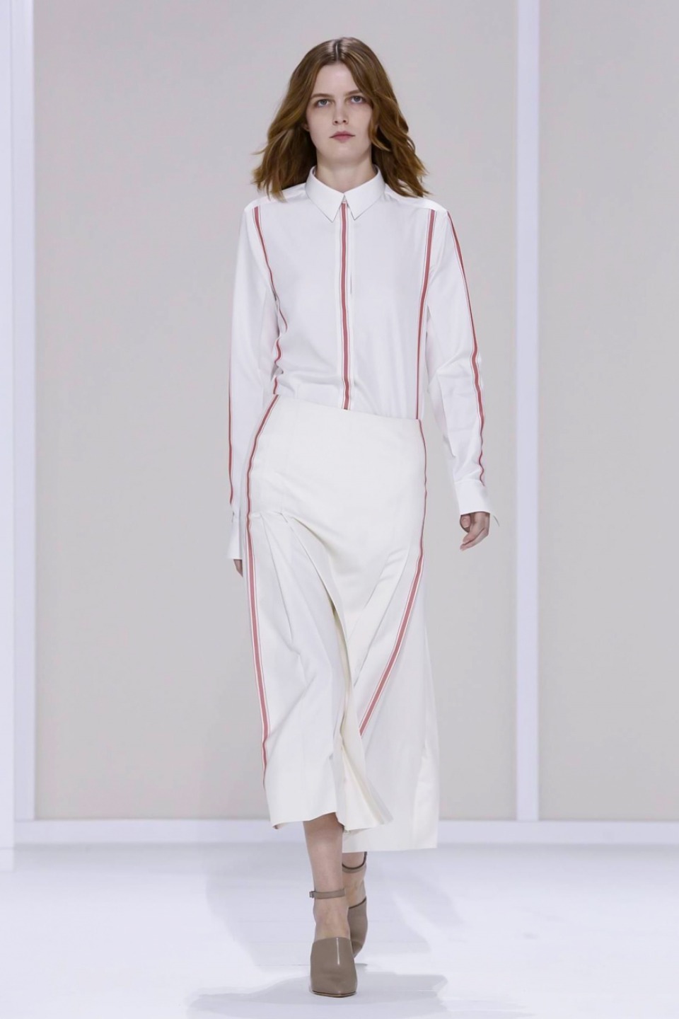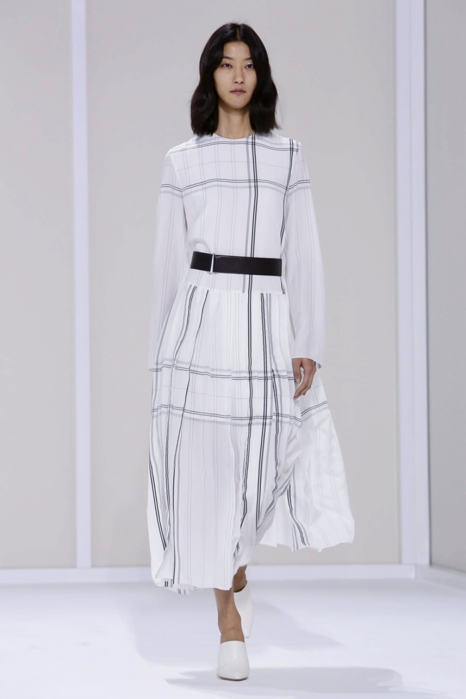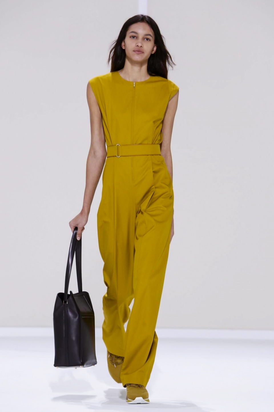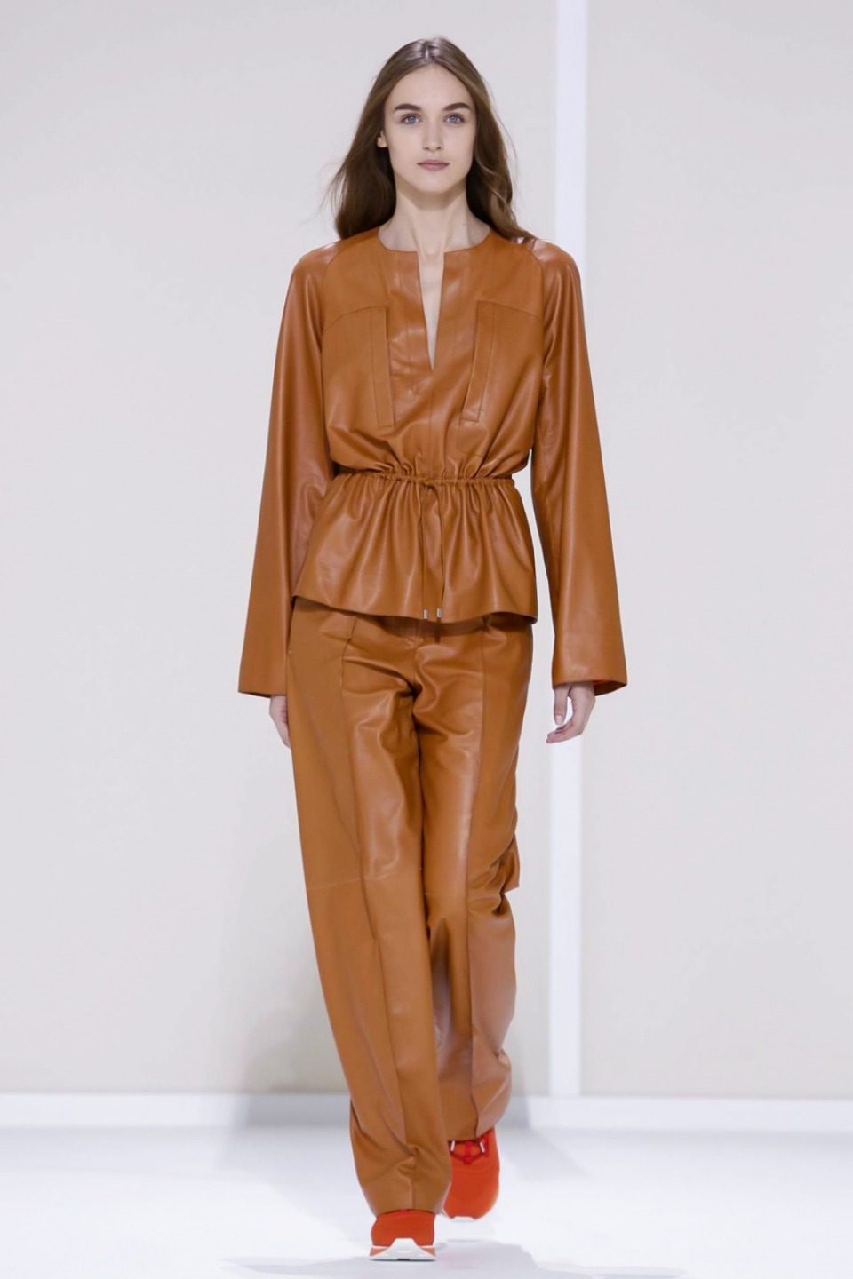 It’s not easy to find words to explain the ingeniously crafted, superfine fabrics and leather it uses in Hermés without sounding pretentious. I’ll try to describe what the Hermés about : Hermès is the essence of the cultivated, inbred french point of view that if you have wealth, it must be spent so that it doesn’t show except to those of your class. (Anyway a woman must never blunder by trying to be sexy, appear to wear makeup, or have done hair direct from hair stylist! – but too much women are half-blind to all these nuances. ) A lot of us wanted to know how Vanhee-Cybulski would set out the Hermès principles for Spring. and what can i tell you- she did it – with a simplified sequence of blue-black tailoring and grid-patterned black-on-cream tops and pants, and mustard-color dresses in cotton and leather, accessorized with large quartz and clear resin cuffs. She’s brought a sense of relaxed city-sportiness to the picture, showing Hermès trainers with many looks and dialing back on the horsey heritage for the moment. It’s not showy “fashion” that is being sold here; more a carefully calibrated sense of a lifestyle which consciously rises above trendiness. For those who want to belong to it, the quality of the materials will be explained in the ritual of buying at Hermès.