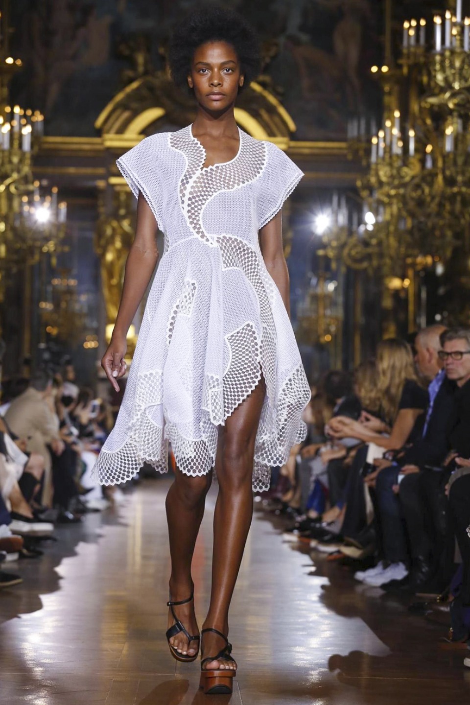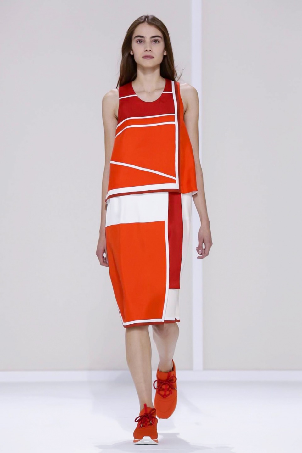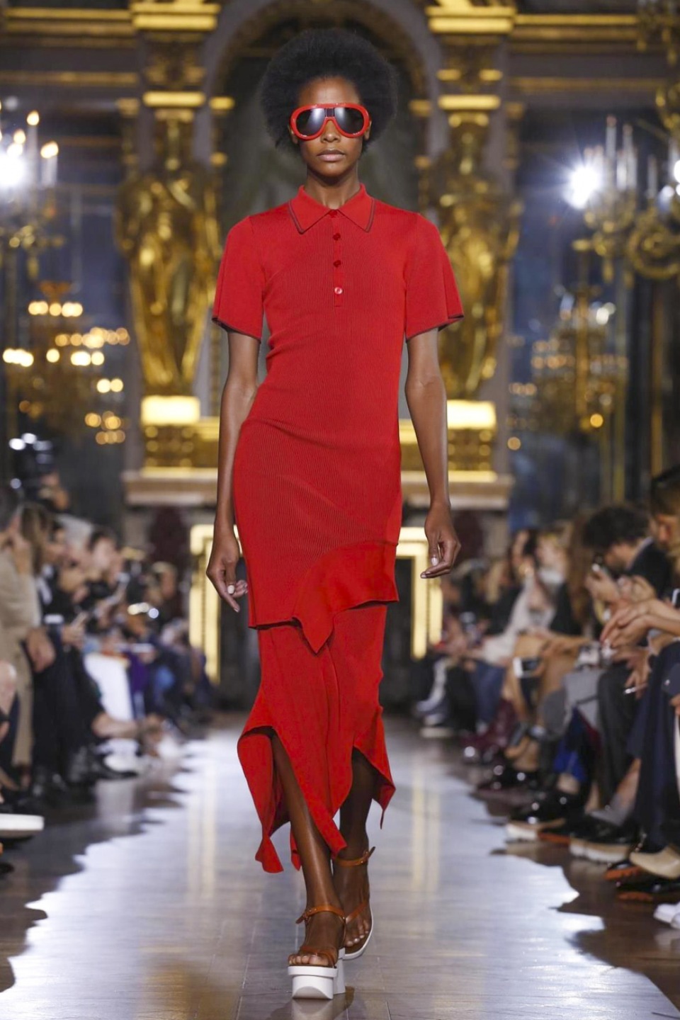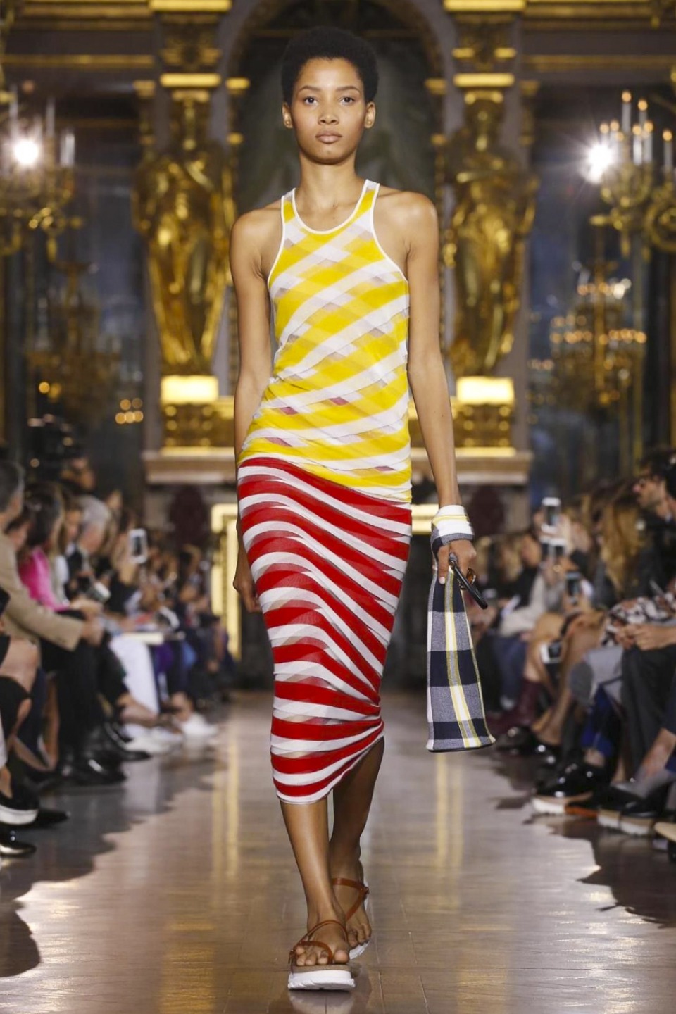 Stella McCartney put a major emphasis on knits in her spring-summer collection. Knitwear has become more visible on Spring runways in last few fahion cycles because a lot of innovative, computer-enabled techniques have allowed designers to do things not possible before. Of course , there’s also another reason sweater dressing is on the rise – because of comfort. McCartney’s layered tanks, polo shirts, and tube skirts looked stretchy as activewear, sporty and poised for action on the athletic sandals they paraded out on, but elevated in bright stripes, checks, and transparencies. She also played with pleated knits in loose trapeze-like shapes with sexy cutaways. It’s been a great week for color in Paris, but McCartney’s as bold as anybody, combining orange and blue or chili red with pink on those knit separates. Swirls of ribbon embroidery made a similarly strong impact on tracksuits and Dresses.