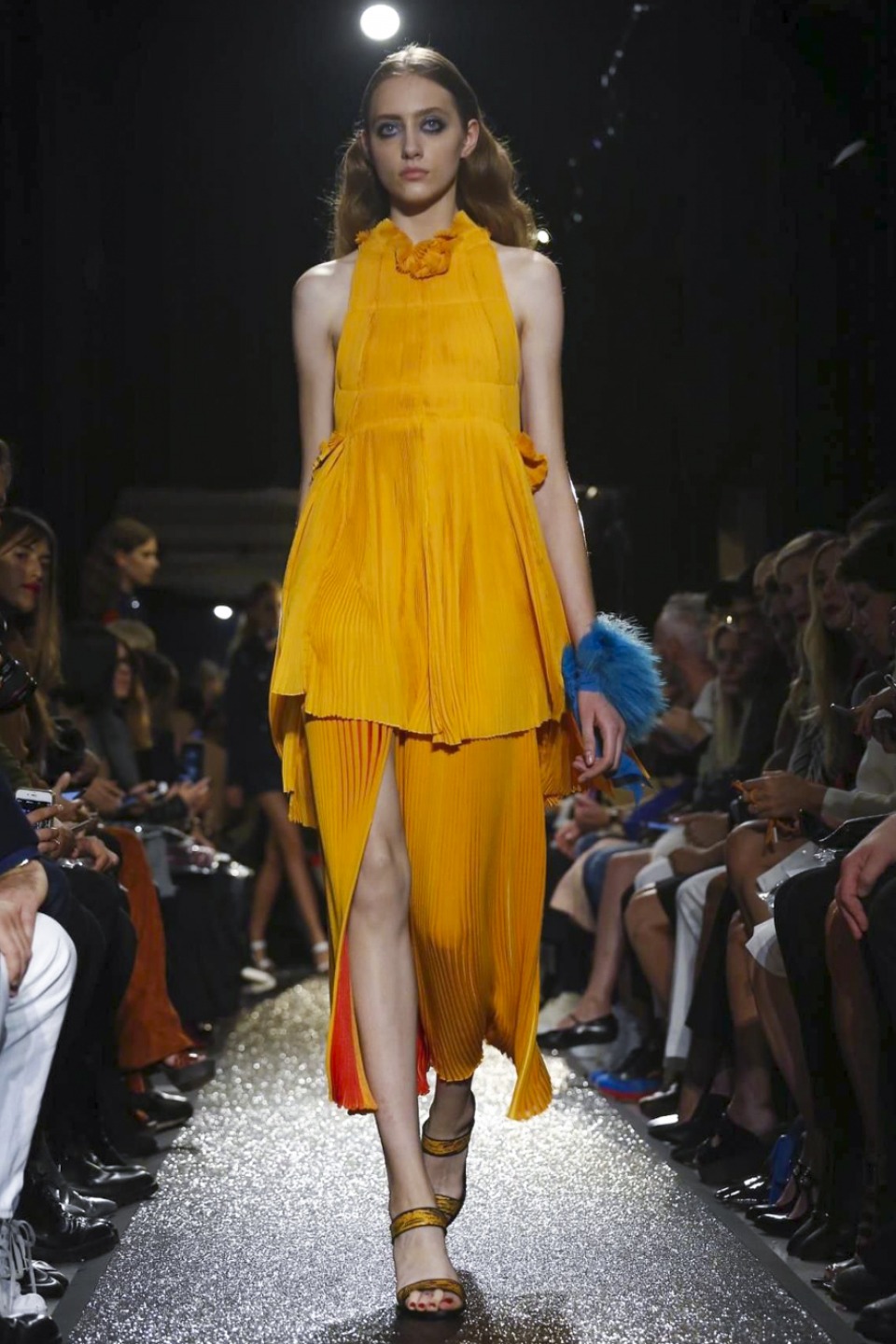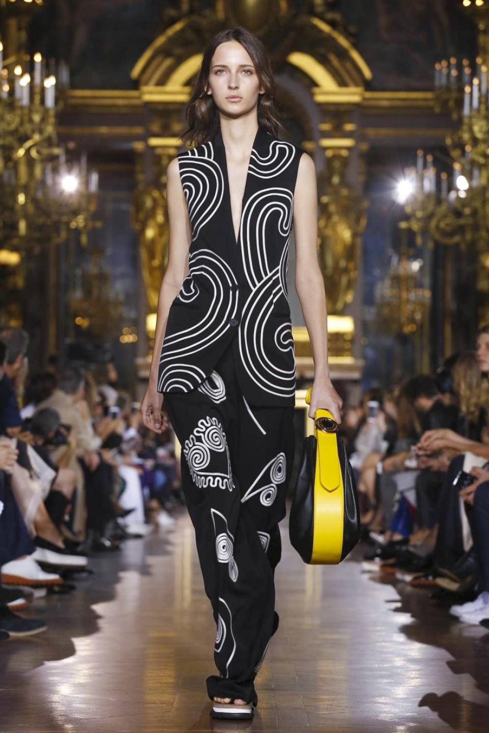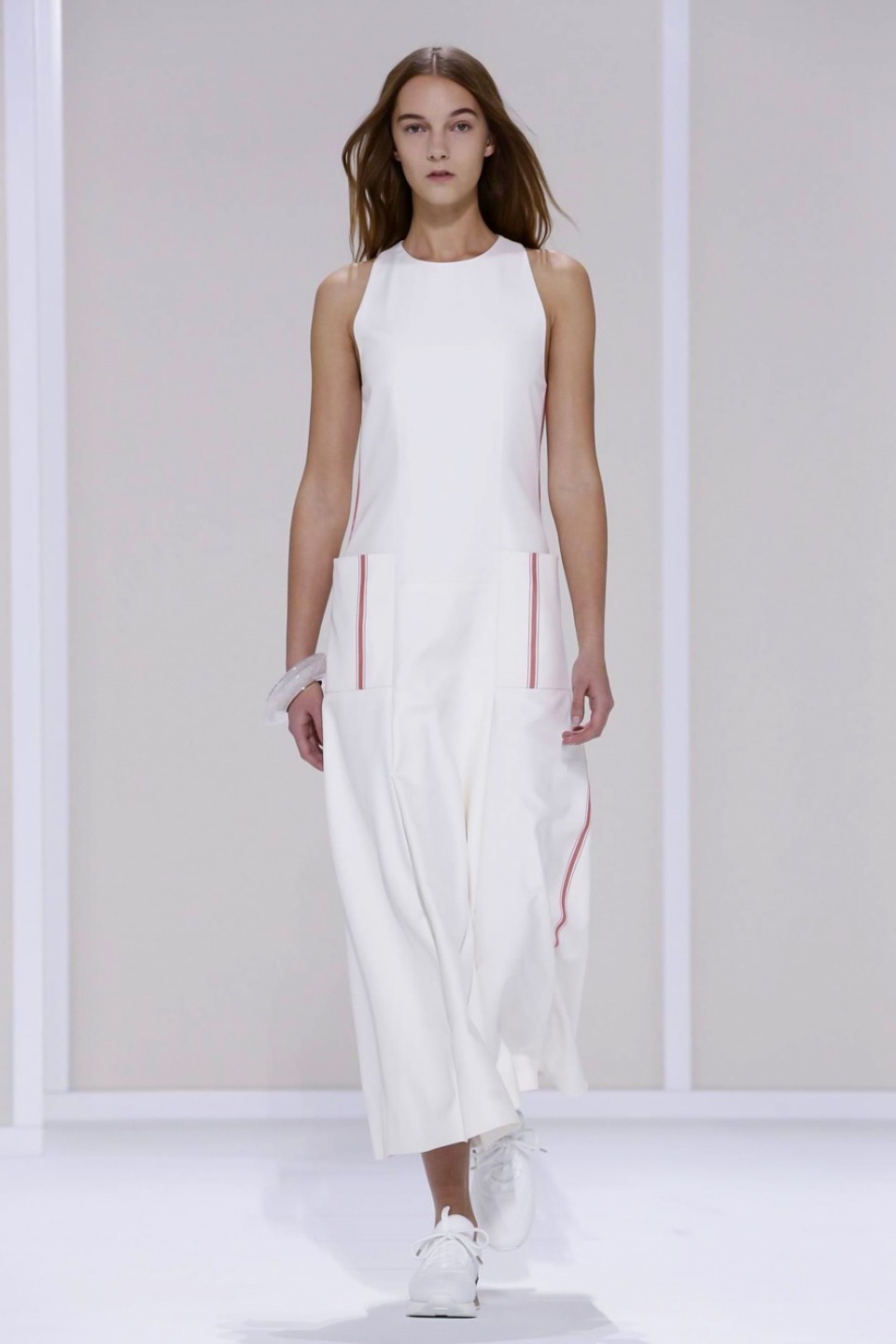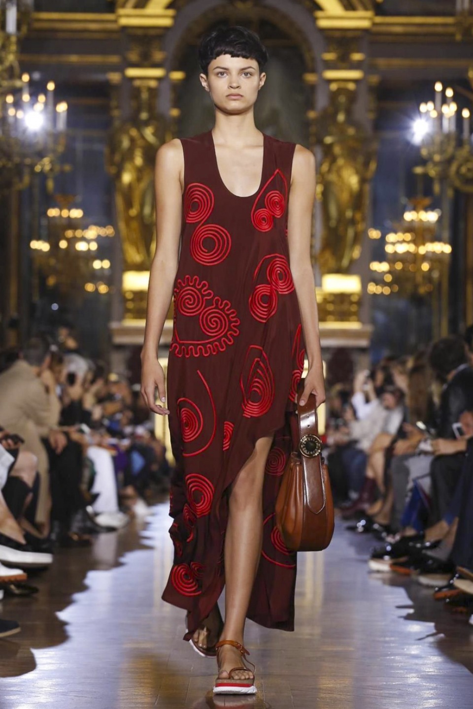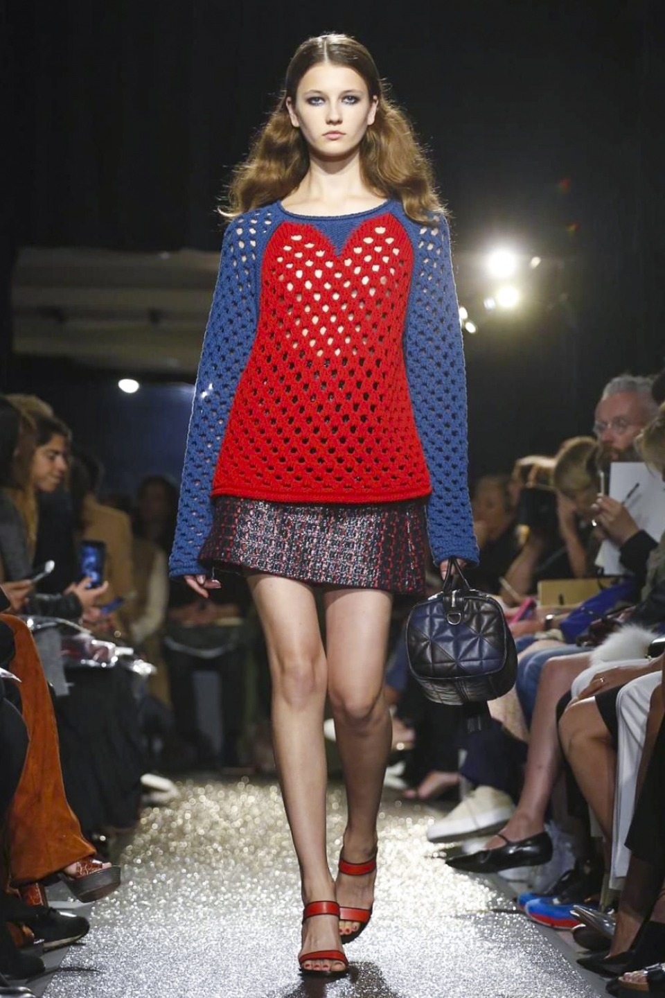 Stella McCartney put a major emphasis on knits in her spring-summer collection. Knitwear has become more visible on Spring runways in last few fahion cycles because a lot of innovative, computer-enabled techniques have allowed designers to do things not possible before. Of course , there’s also another reason sweater dressing is on the rise – because of comfort. McCartney’s layered tanks, polo shirts, and tube skirts looked stretchy as activewear, sporty and poised for action on the athletic sandals they paraded out on, but elevated in bright stripes, checks, and transparencies. She also played with pleated knits in loose trapeze-like shapes with sexy cutaways. It’s been a great week for color in Paris, but McCartney’s as bold as anybody, combining orange and blue or chili red with pink on those knit separates. Swirls of ribbon embroidery made a similarly strong impact on tracksuits and Dresses.