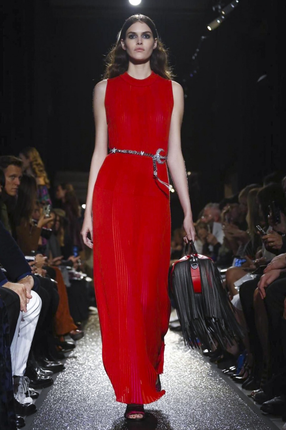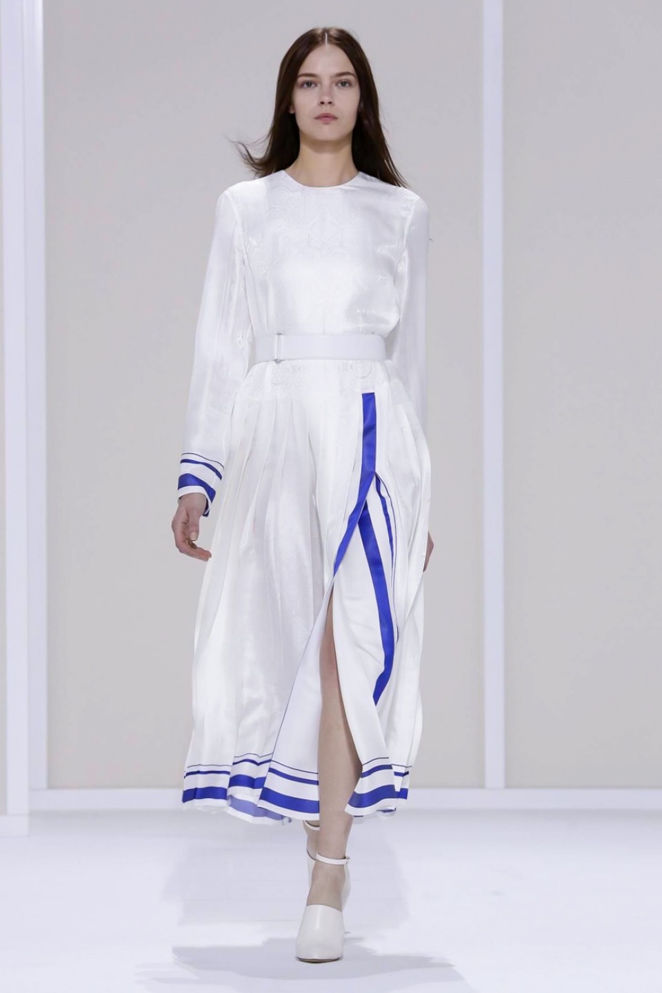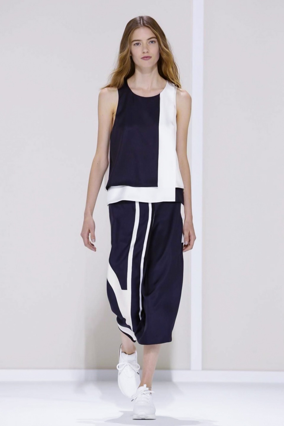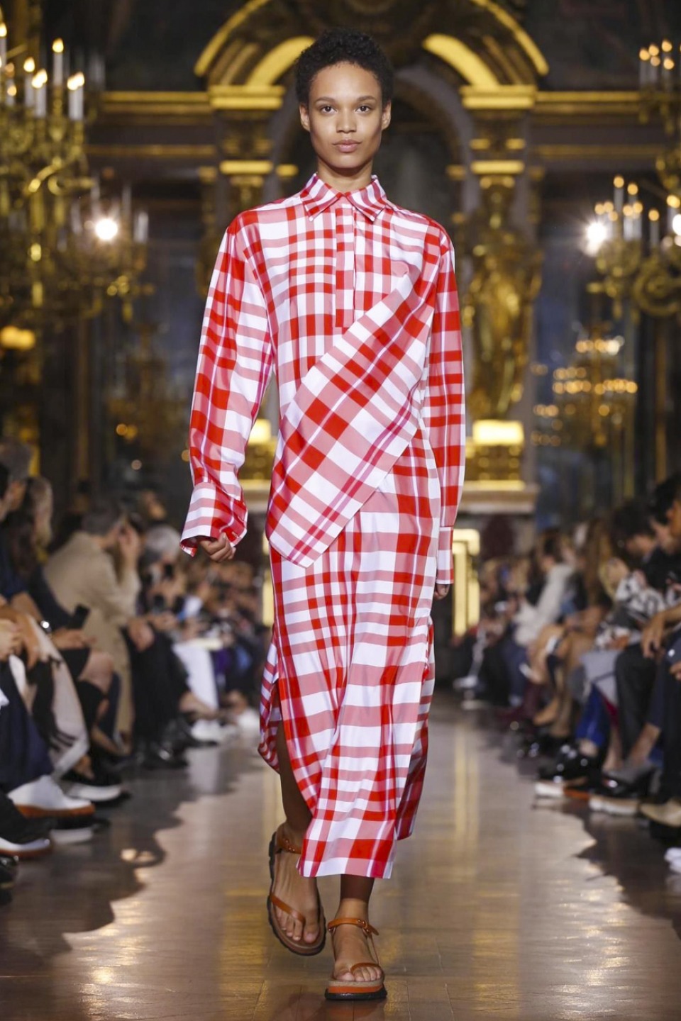 Stella McCartney put a major emphasis on knits in her spring-summer collection. Knitwear has become more visible on Spring runways in last few fahion cycles because a lot of innovative, computer-enabled techniques have allowed designers to do things not possible before. Of course , there’s also another reason sweater dressing is on the rise – because of comfort. McCartney’s layered tanks, polo shirts, and tube skirts looked stretchy as activewear, sporty and poised for action on the athletic sandals they paraded out on, but elevated in bright stripes, checks, and transparencies. She also played with pleated knits in loose trapeze-like shapes with sexy cutaways. It’s been a great week for color in Paris, but McCartney’s as bold as anybody, combining orange and blue or chili red with pink on those knit separates. Swirls of ribbon embroidery made a similarly strong impact on tracksuits and Dresses.