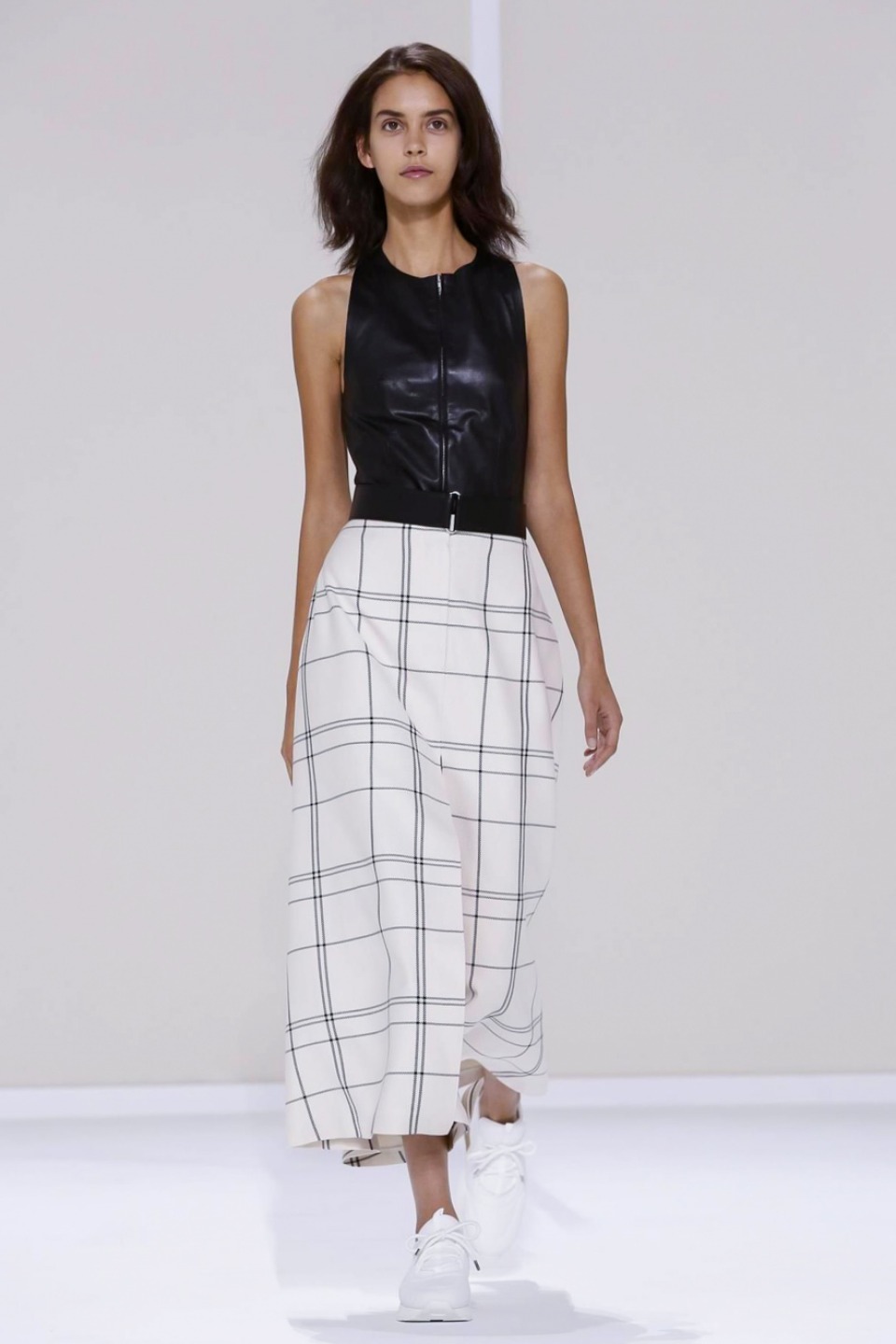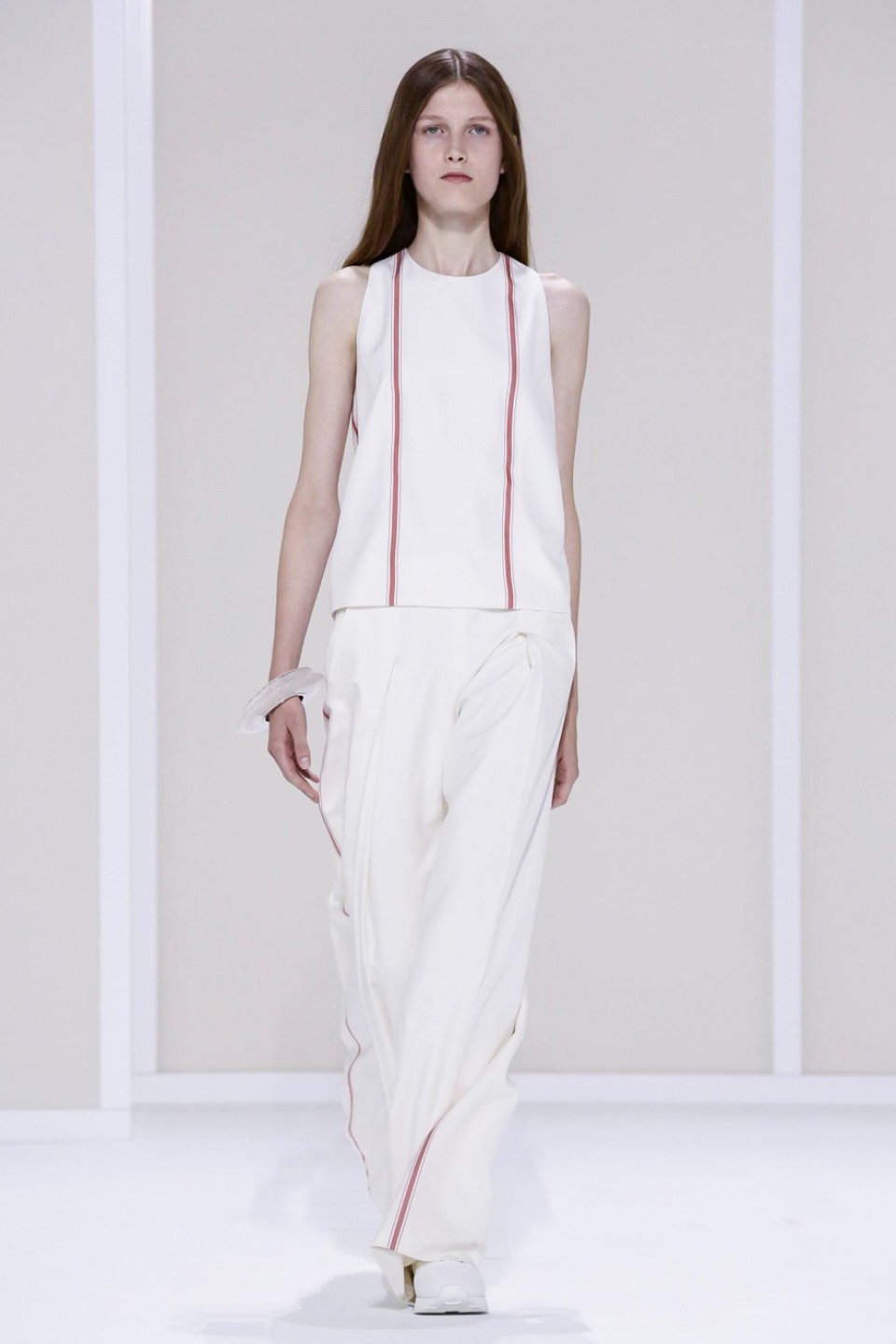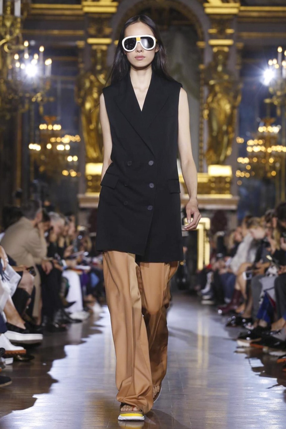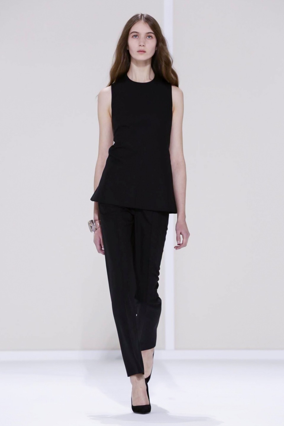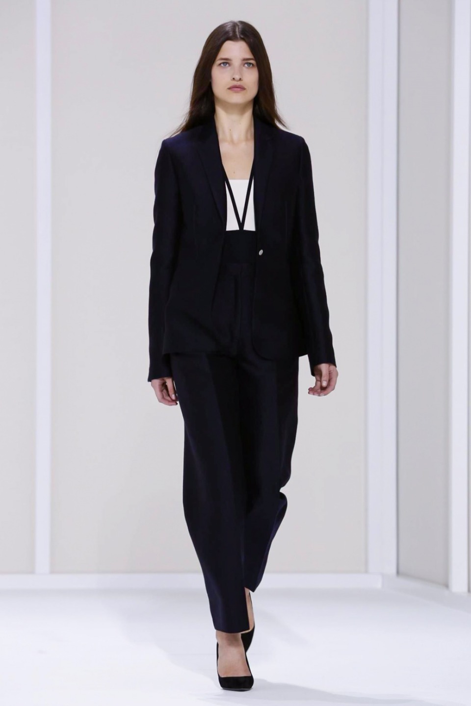 Her other project here was remake the suit, which has been an icon of the brand from the beginning. She did that via deconstruction; a double-breasted black jacket was transformed into a strapless, form-fitting tunic worn over a multi-slit skirt. More conventional pieces like vests and trousers had an appealing fluidity and elongated proportions.